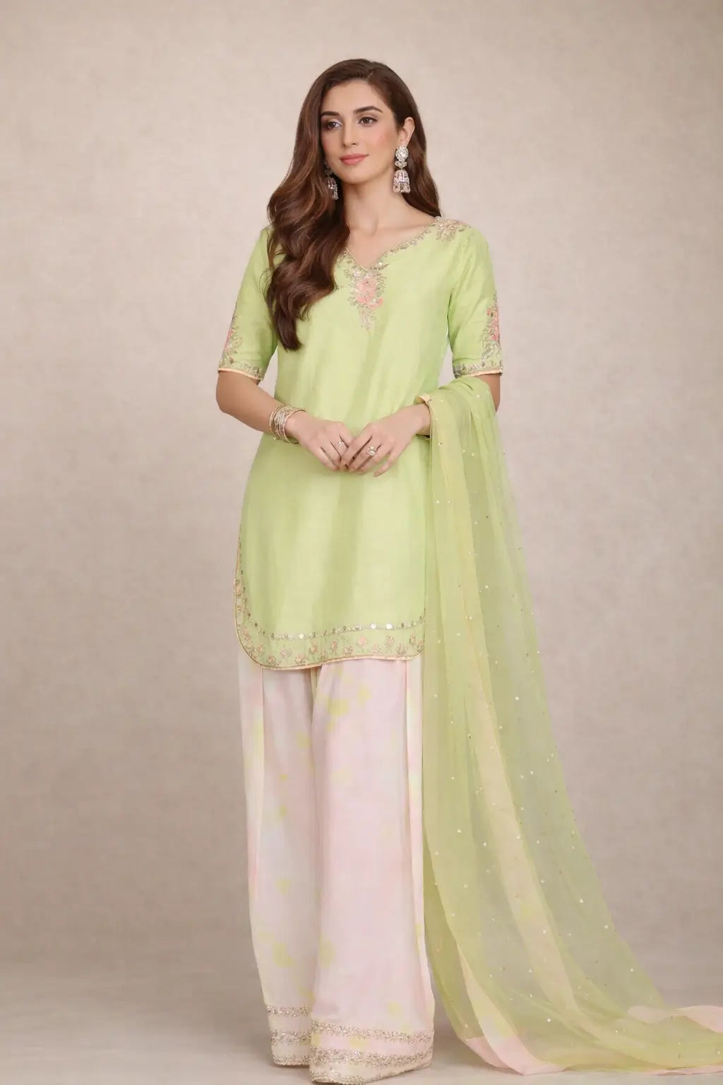 Step into graceful elegance with this light green and pastel pink contrast suit, crafted in pure natural crepe with 3mm sequin embroidery and royal mirror handwork. The kurta features delicate floral embroidery with fancy sleeves, paired with a digital print Farshi plazzo adorned with sequin work and comfortable elastic fitting.