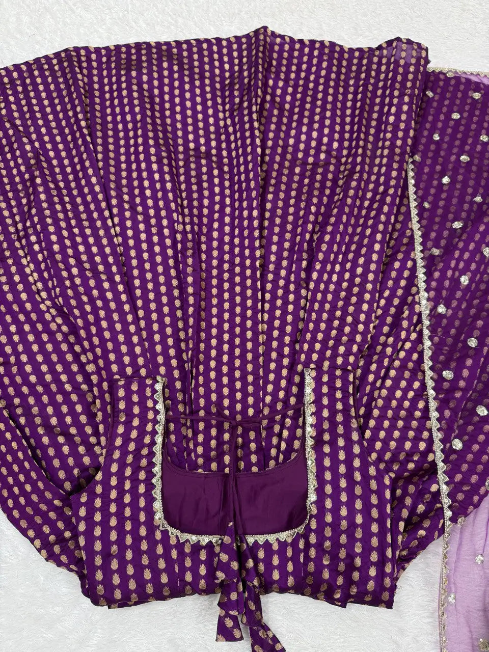 Step into regal charm with this Jacquard Silk Anarkali Suit, a masterpiece that blends traditional weaving with modern elegance. The woven jacquard silk kurta, highlighted with a delicate lace border, brings timeless sophistication, while the micro cotton lining ensures comfort throughout the day.
