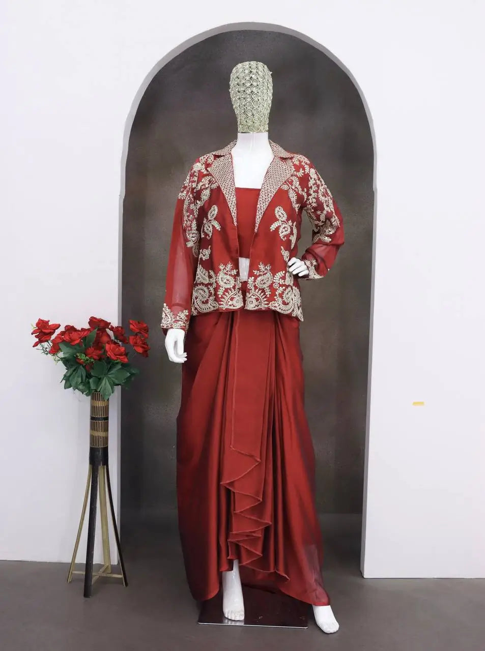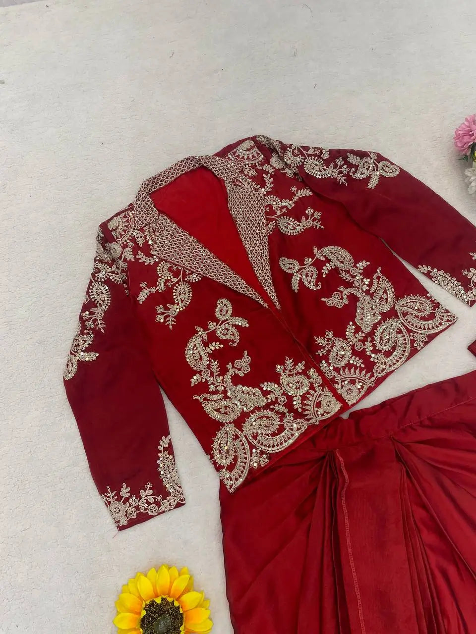 The blouse is crafted from heavy Rangoli silk and comes fully stitched, providing a comfortable yet stylish base layer. The highlight of the outfit is the beautifully embroidered koti jacket designed with intricate multi thread sequence embroidery work that enhances the richness of the entire look. The structured koti adds a designer touch and elevates the outfit with its sophisticated detailing.