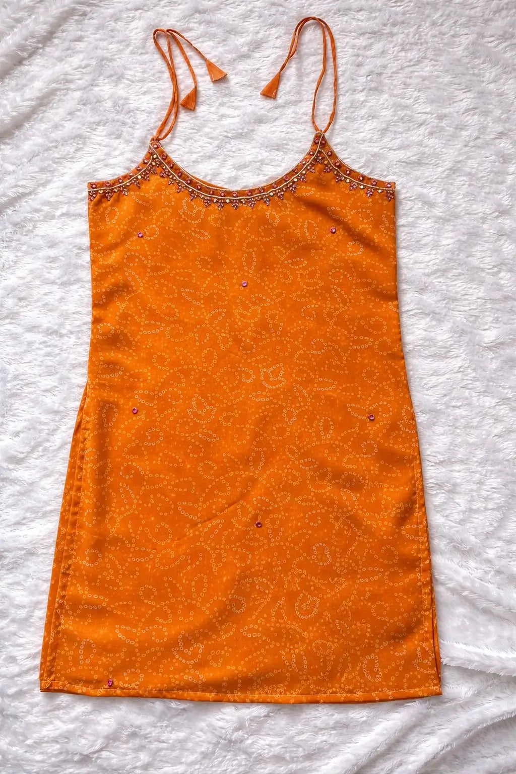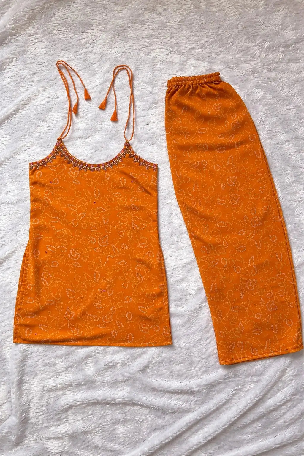 This stylish sleeveless kurti pant set is designed for modern comfort with a subtle festive touch. The kurti features elegant shoulder tie-up straps and a beautifully shaped neckline, highlighted with delicate handcrafted mirror-style embellishments and fine thread work. The coordinated straight-fit bottom complements the kurti perfectly, offering ease of movement and all-day comfort. Crafted for casual outings, festive get-togethers, and relaxed celebrations, this lightweight set delivers a graceful yet contemporary look without the need for a dupatta.