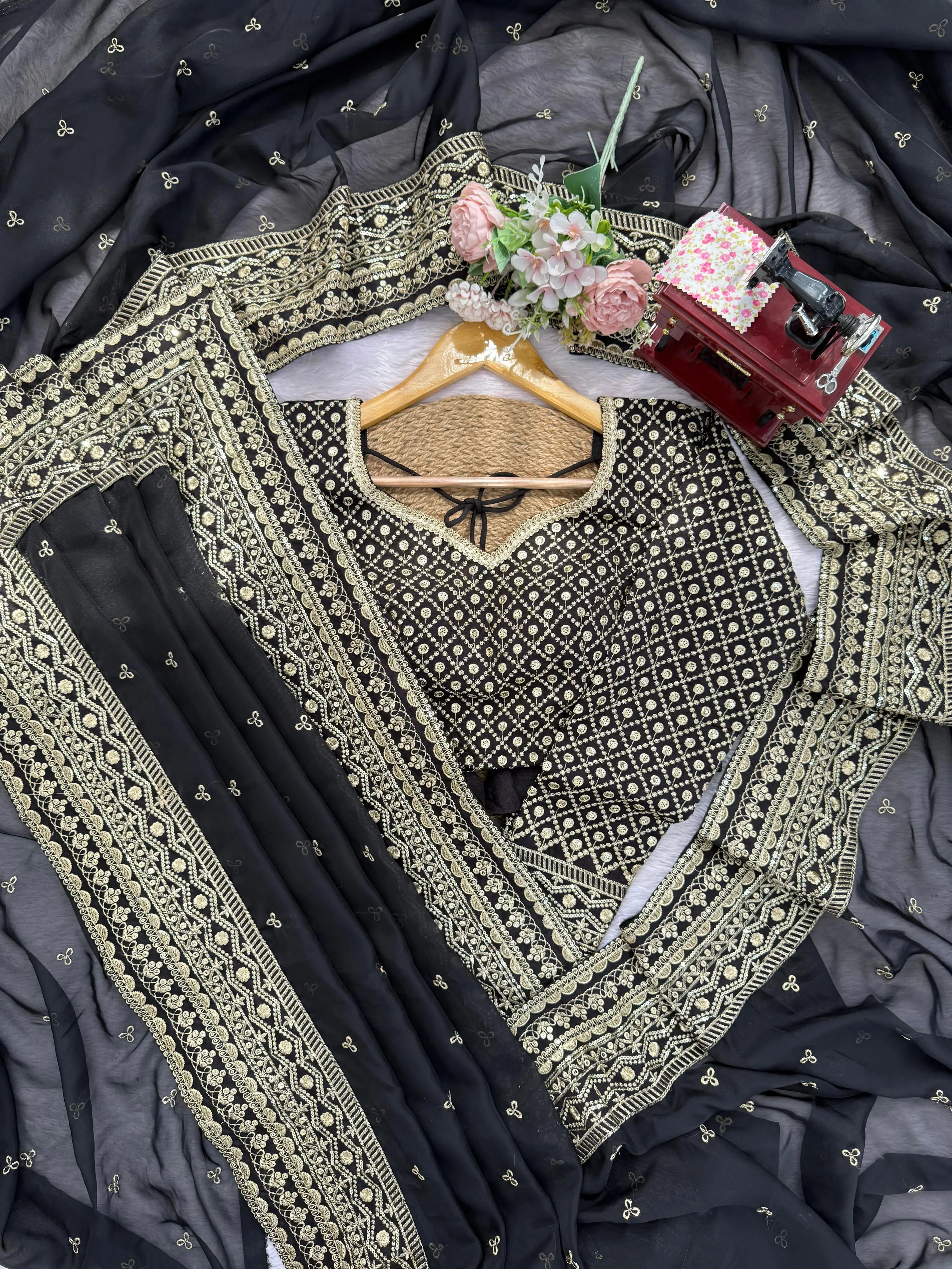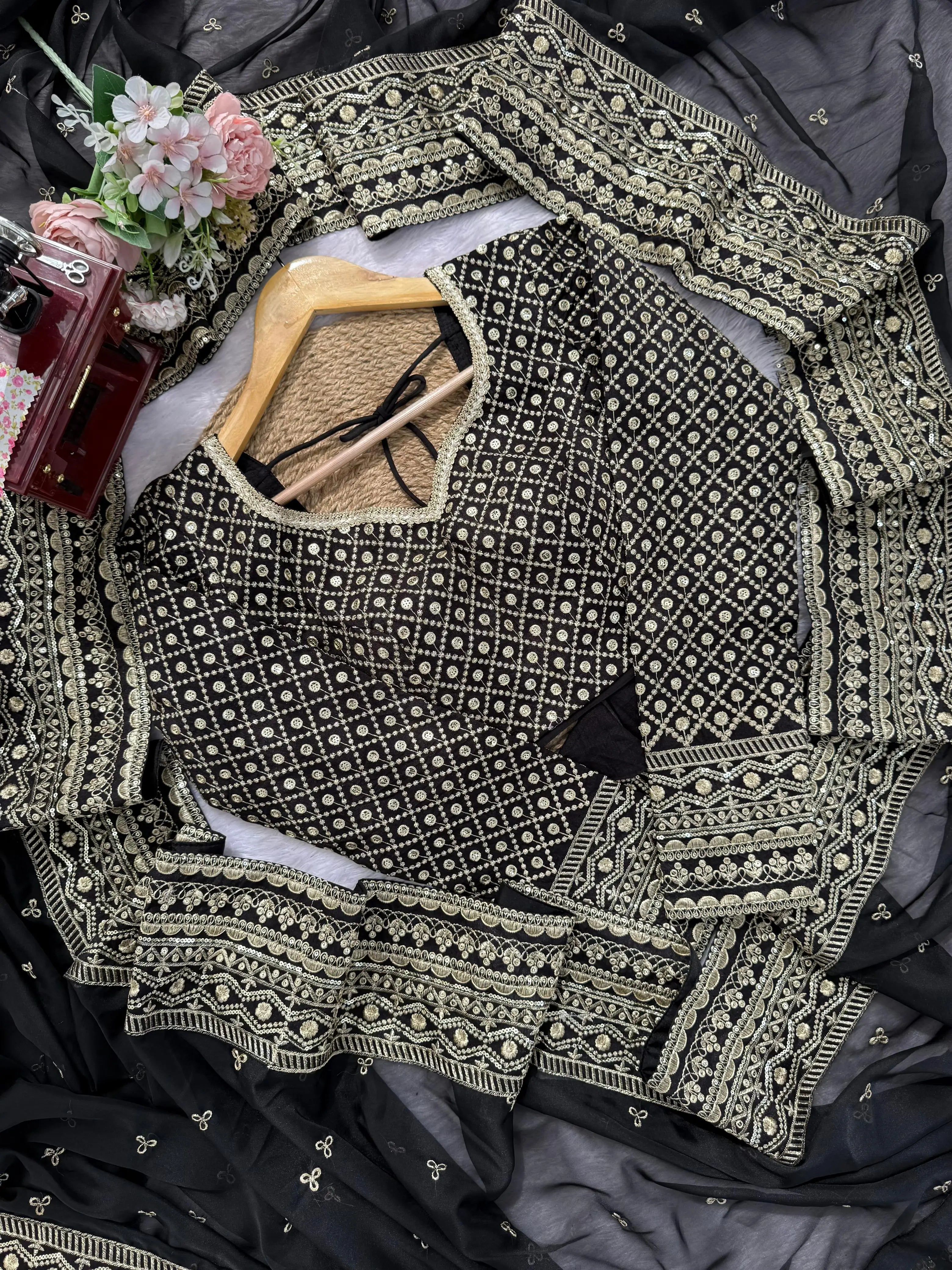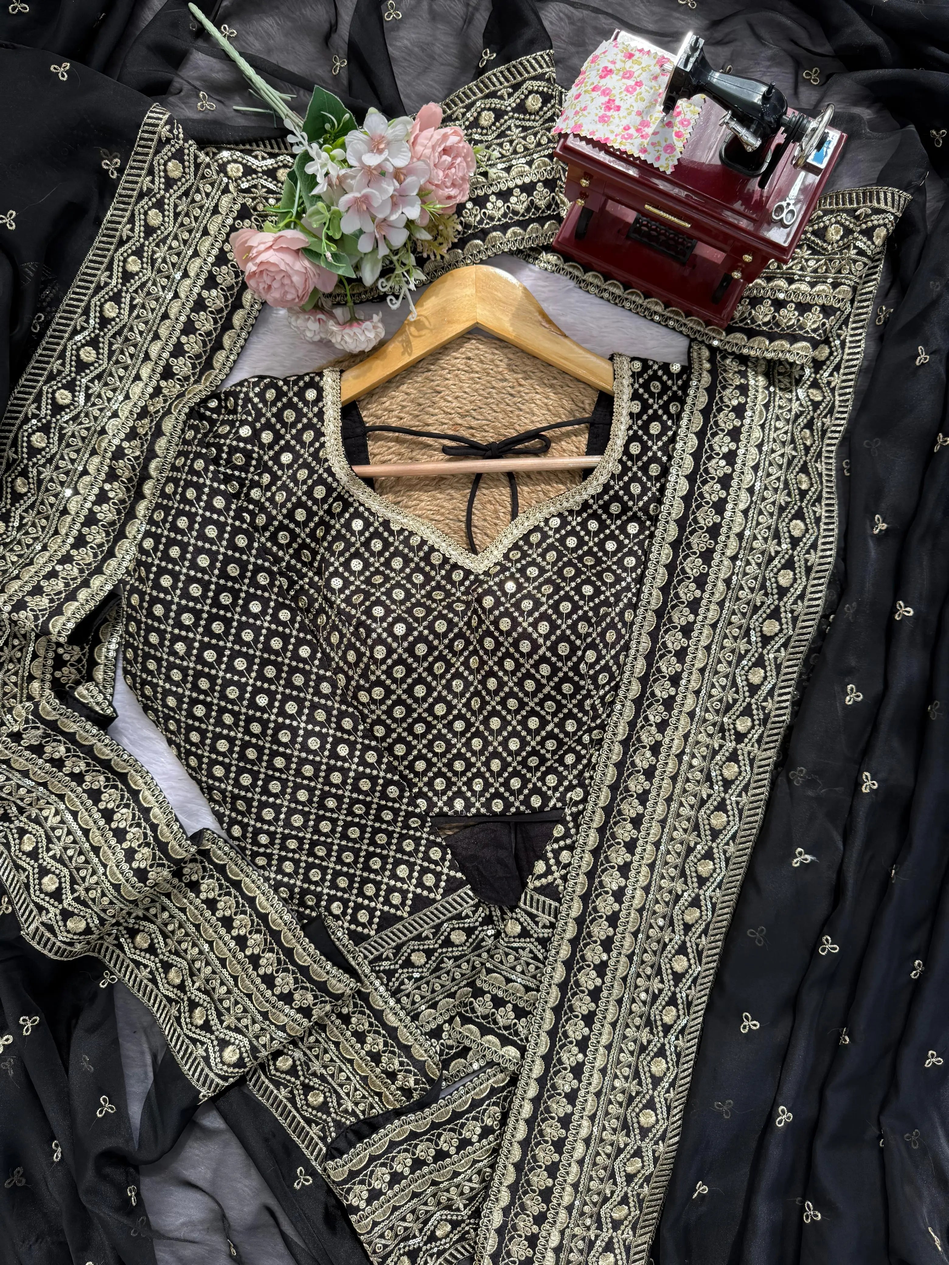 The saree and blouse feature detailed sequence and thread embroidery for an elegant finish.
