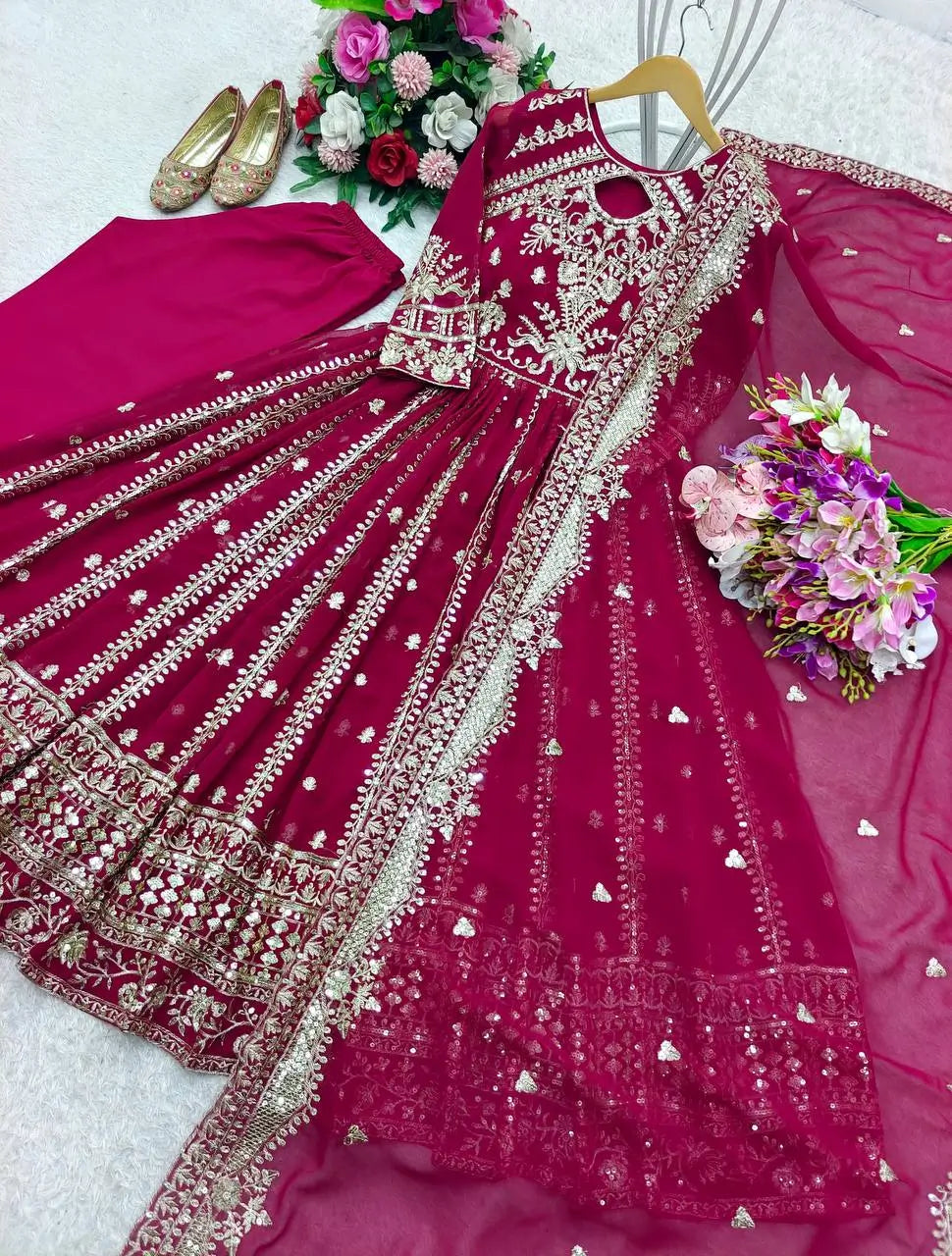This embroidered georgette Anarkali gown set is a masterpiece of elegance, perfect for festive occasions and grand celebrations. Made from premium heavy blooming faux georgette, the gown is richly detailed with intricate embroidery and sequence work that shimmers beautifully in every light. The design features stitched cups and a flattering silhouette that flows gracefully to a 55-inch length. A soft micro cotton lining ensures comfort throughout wear. The outfit comes with a heavy butter silk bottom for a smooth finish and a faux blooming georgette dupatta adorned with elegant embroidery and a ready-made lace border. Fully stitched and ready to wear, this ensemble blends sophistication and timeless charm.