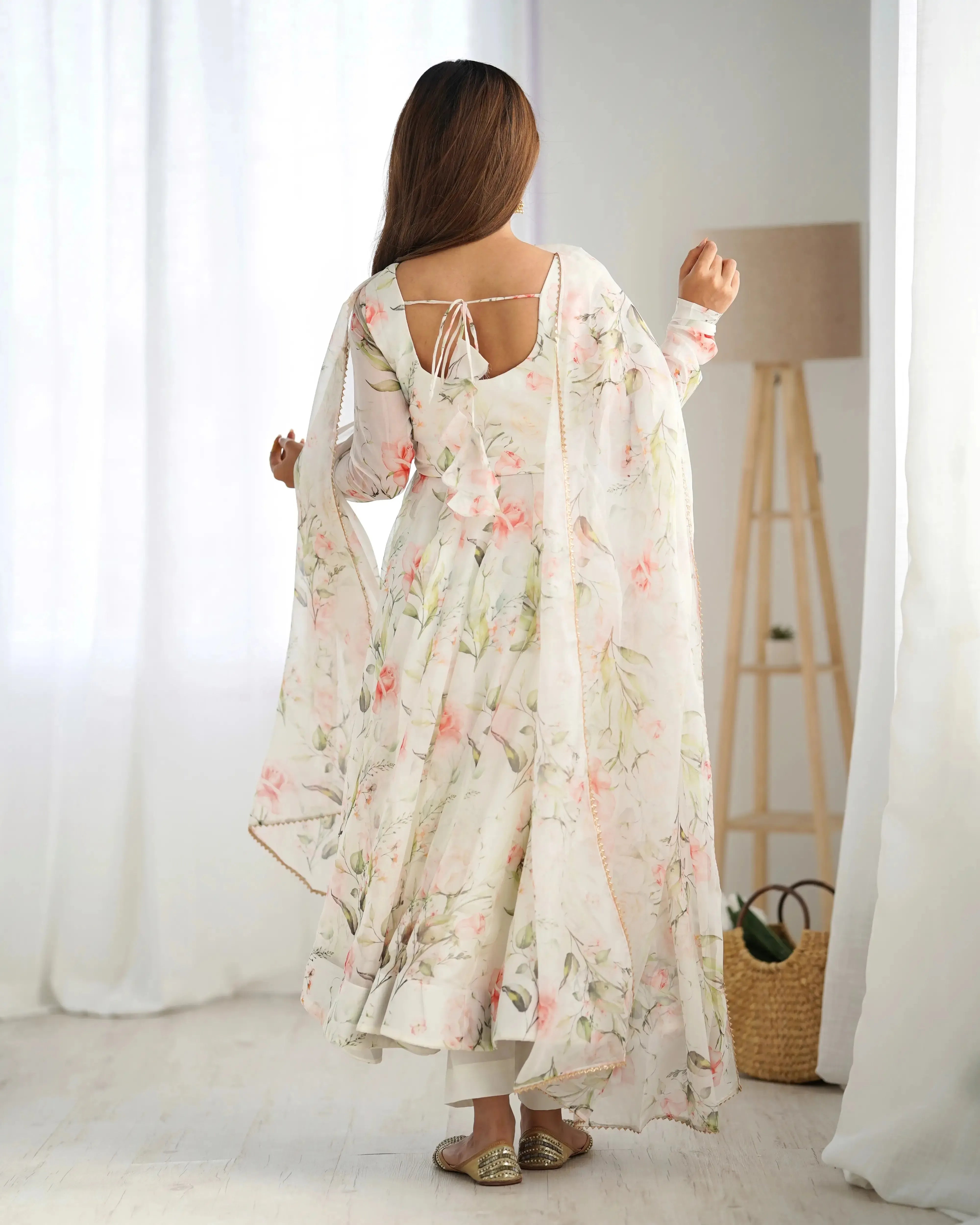 Step into effortless elegance with this organza silk floral Anarkali set, designed for weddings, festive gatherings, and daytime celebrations. Crafted in heavy pure soft organza silk print, this Anarkali flows gracefully with a 4-meter kali cut flair and canvas patta, giving it a voluminous and structured silhouette.