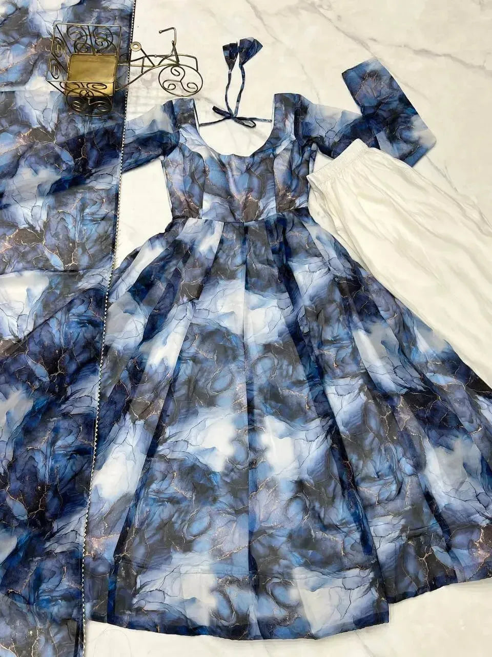 Turn heads with this luxurious organza silk Anarkali set, beautifully designed for weddings, festive occasions, and elegant gatherings. Made from heavy pure soft organza silk with marble print, the Anarkali showcases a stunning 4-meter flair with kali cut and a canvas patta, giving it a voluminous and graceful fall.