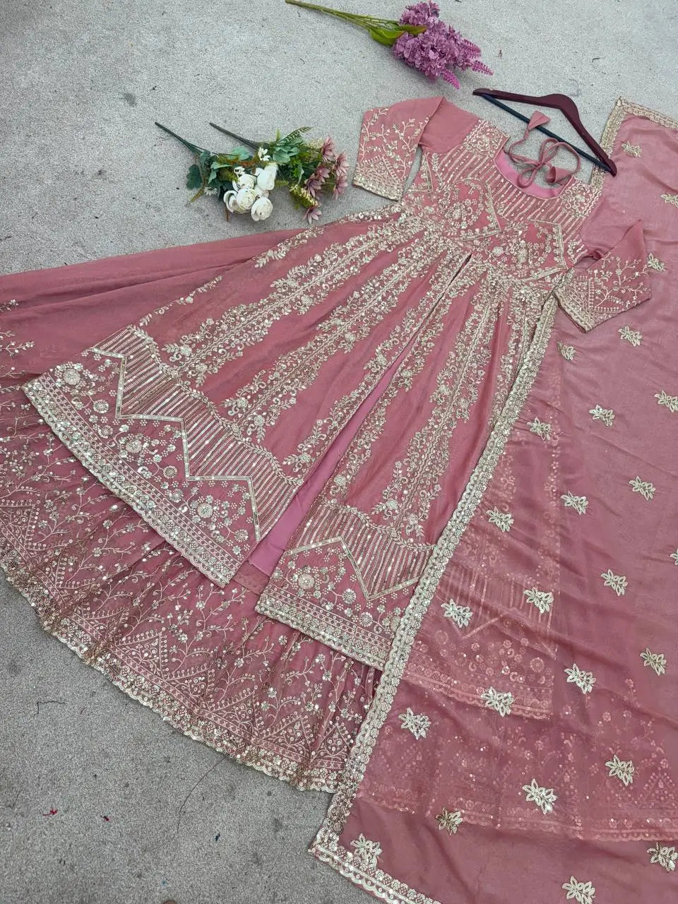 This embroidered crunchy silk palazzo suit set is a perfect fusion of luxury and tradition, designed to make you stand out at weddings and festive occasions. The long top is crafted from premium crunchy silk, beautifully adorned with heavy embroidery and sequence work, and paired with full sleeves for a regal look. With a flattering length of 50–51 inches and a soft heavy micro cotton inner, it offers both elegance and comfort. The matching palazzo is stitched from crunchy silk and lined with micro cotton for ease of wear. Completing the ensemble is a rich dupatta in crunchy silk, featuring exquisite embroidery and sequence detailing. With its graceful flow, premium finish, and lightweight 1.2 kg design, this set is perfect for creating a grand statement at any celebration.