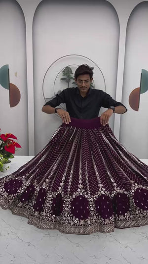 A deep-toned georgette lehenga enriched with intricate embroidery for a refined festive look. The matching blouse and dupatta complete the outfit with harmony and charm.