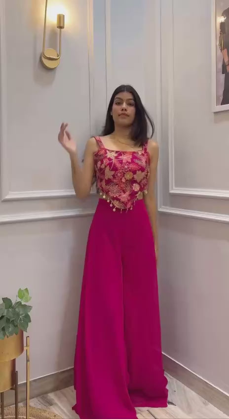 The set comes paired with a flowy georgette plazo, designed with an adjustable elastic waist for a perfect fit. Lightweight and easy to wear, this two-piece outfit is perfect for festive occasions, cocktail parties, and modern ethnic gatherings.