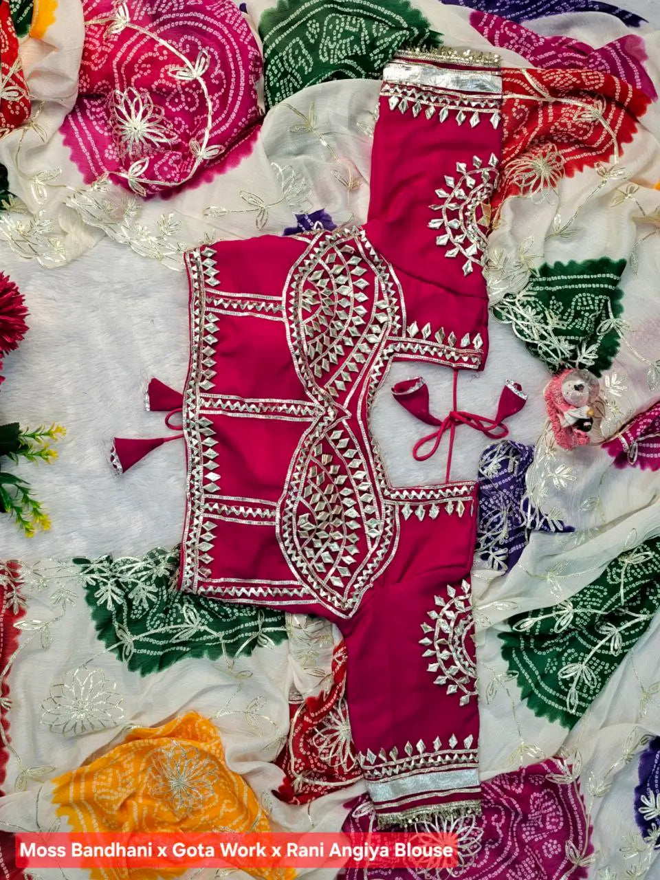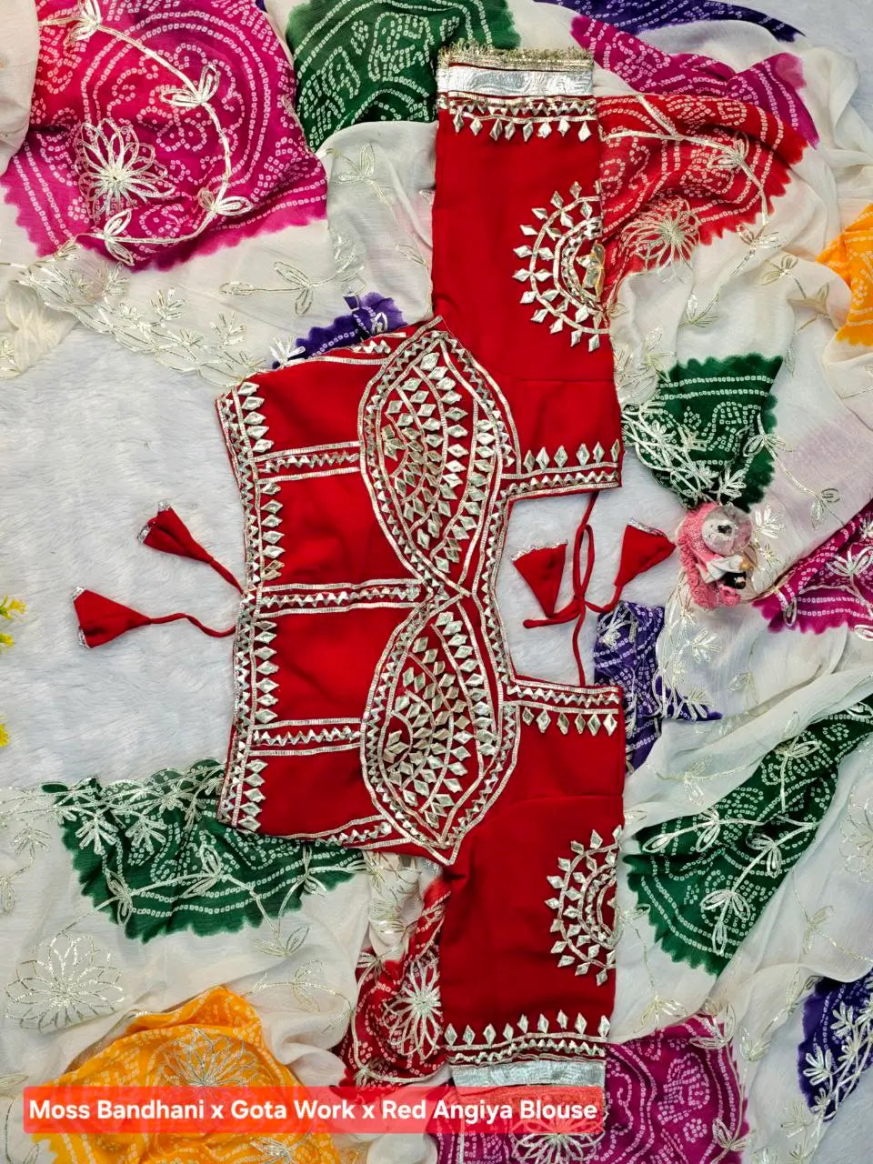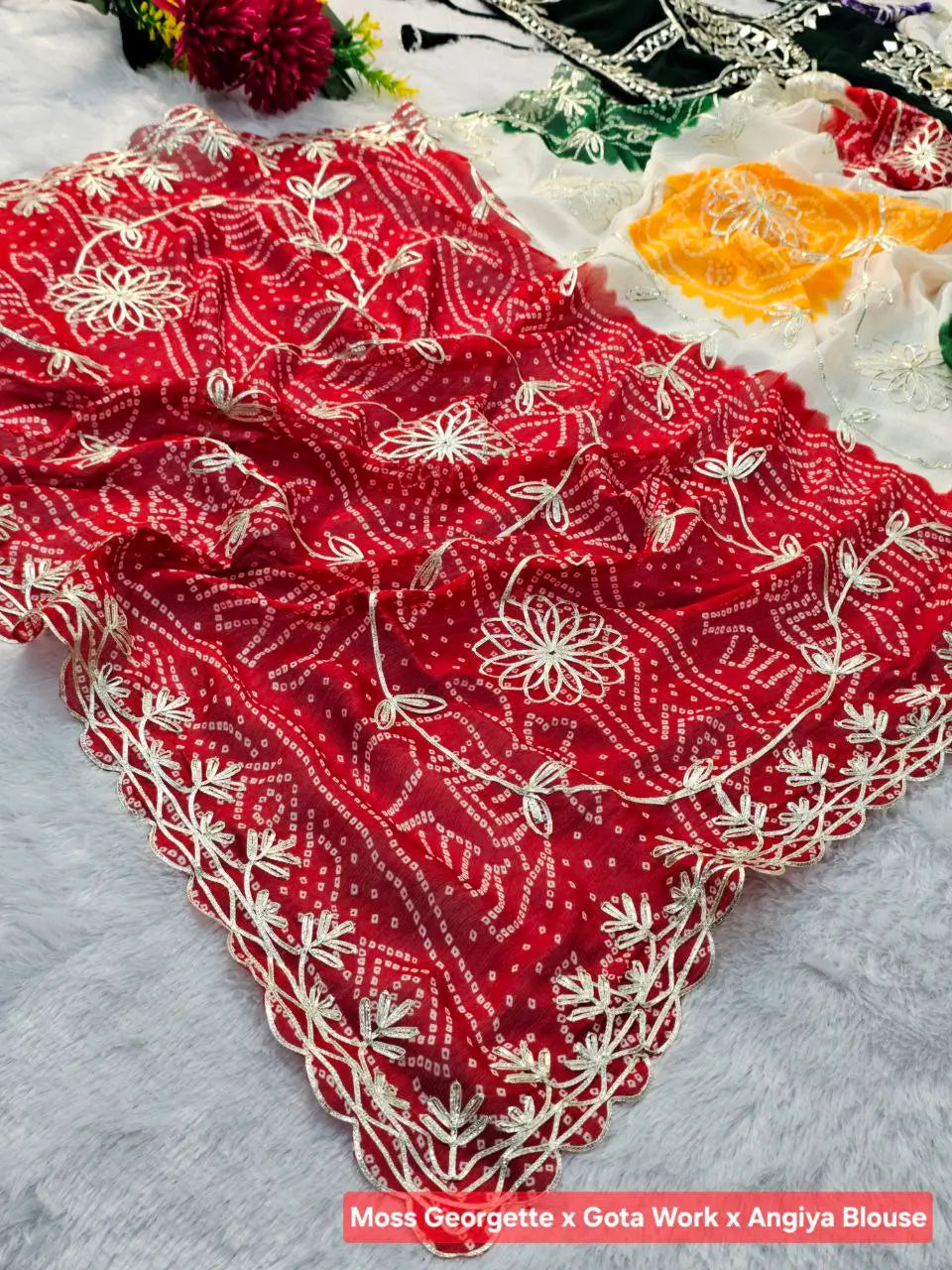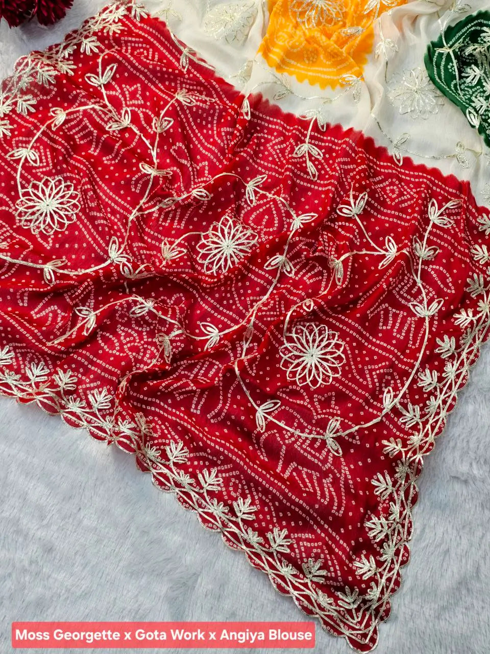 This elegant saree set showcases the timeless beauty of traditional craftsmanship blended with festive charm. Crafted from soft moss georgette, the saree features an attractive Bandhani print enhanced with beautiful full jaal gota work spread gracefully across the drape. The lightweight fabric offers an effortless fall while maintaining a rich and festive appearance. Paired with a soft georgette blouse adorned with hand charkhi gotta patti work, the ensemble reflects refined detailing and artisanal finish. The fully stitched blouse ensures convenience and comfort, making this saree set an ideal choice for festive gatherings, cultural celebrations, and special occasions.