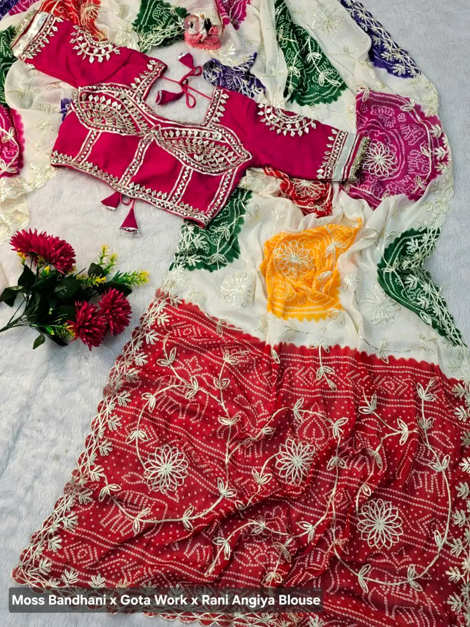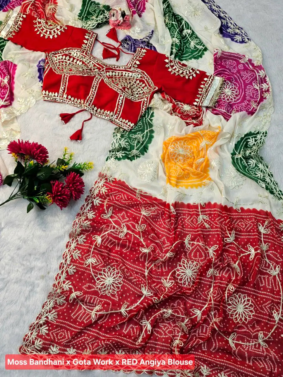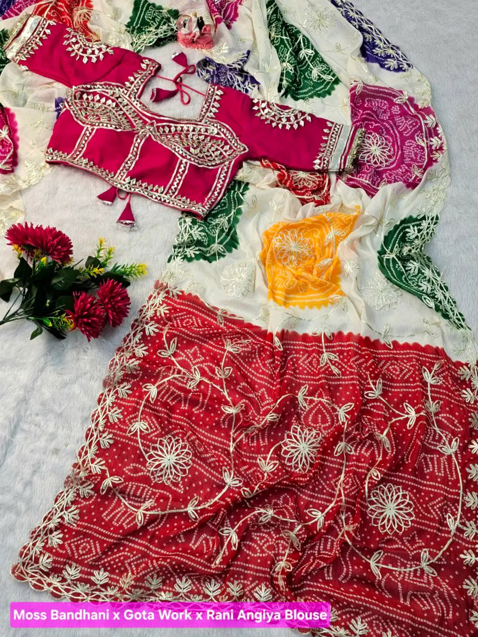 This elegant saree set showcases the timeless beauty of traditional craftsmanship blended with festive charm. Crafted from soft moss georgette, the saree features an attractive Bandhani print enhanced with beautiful full jaal gota work spread gracefully across the drape. The lightweight fabric offers an effortless fall while maintaining a rich and festive appearance. Paired with a soft georgette blouse adorned with hand charkhi gotta patti work, the ensemble reflects refined detailing and artisanal finish. The fully stitched blouse ensures convenience and comfort, making this saree set an ideal choice for festive gatherings, cultural celebrations, and special occasions.