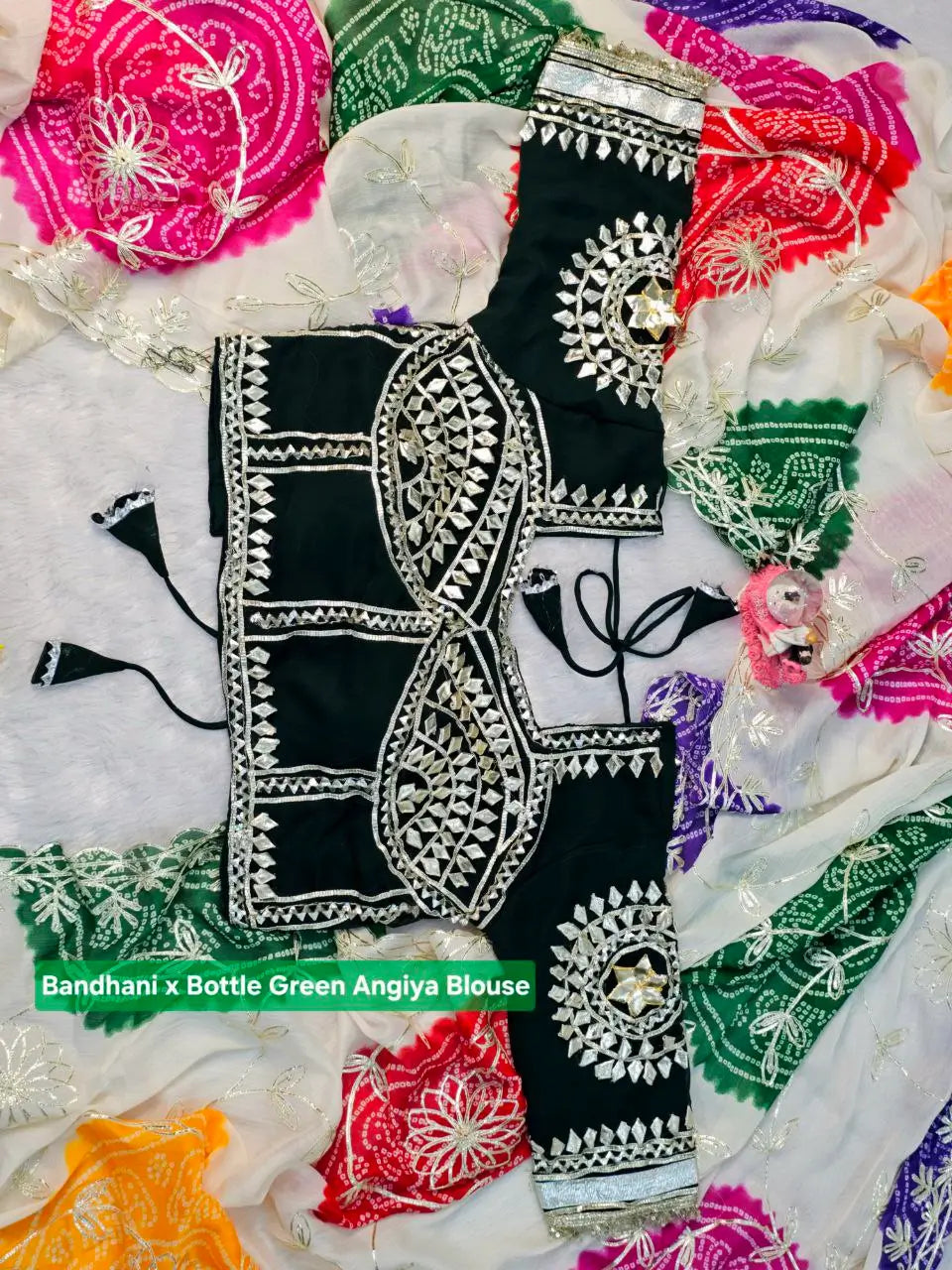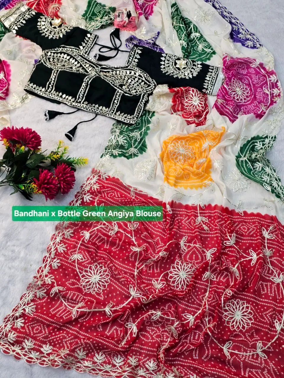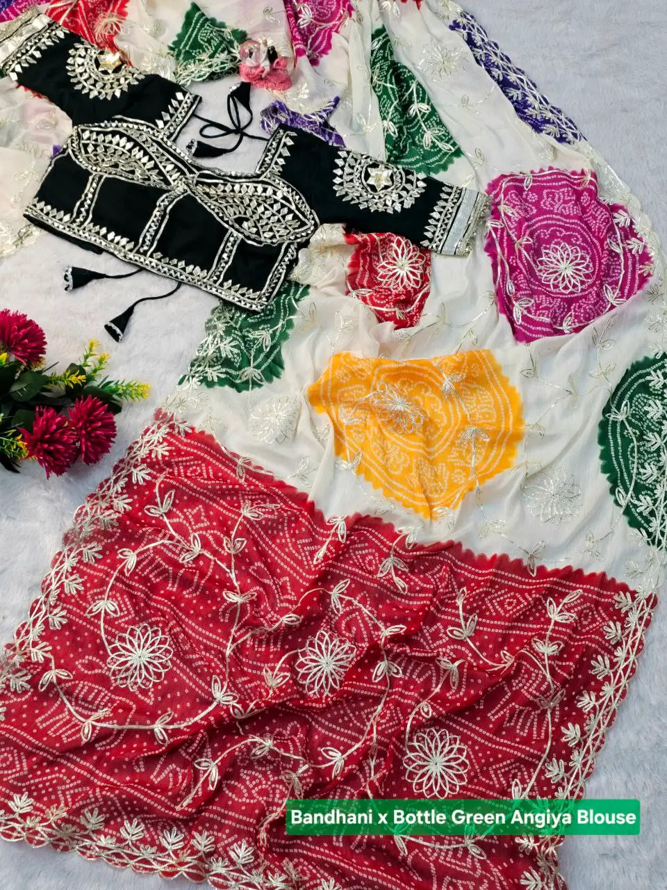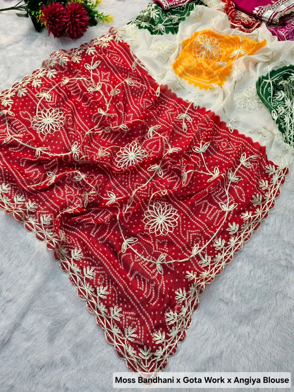 This elegant saree set showcases the timeless beauty of traditional craftsmanship blended with festive charm. Crafted from soft moss georgette, the saree features an attractive Bandhani print enhanced with beautiful full jaal gota work spread gracefully across the drape. The lightweight fabric offers an effortless fall while maintaining a rich and festive appearance. Paired with a soft georgette blouse adorned with hand charkhi gotta patti work, the ensemble reflects refined detailing and artisanal finish. The fully stitched blouse ensures convenience and comfort, making this saree set an ideal choice for festive gatherings, cultural celebrations, and special occasions.