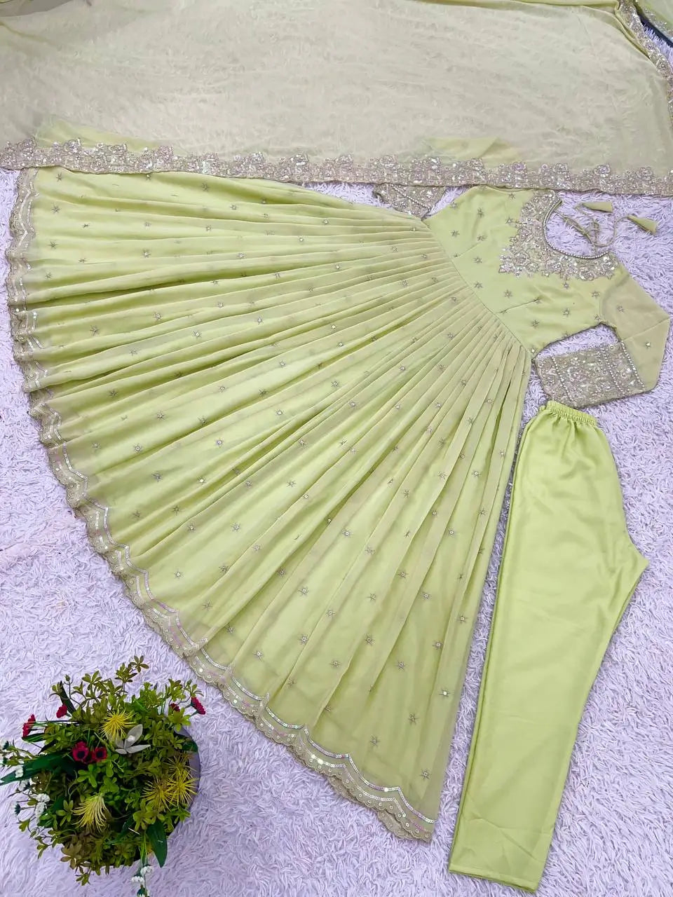 This elegant party wear gown set is crafted from premium heavy georgette, beautifully embellished with intricate rembo sequin embroidery and delicate moti work for a rich and festive appeal. The gown features full sleeves, a length of 51–52 inches, and a flowing 3-meter flair, creating a graceful and regal silhouette. Lined with micro cotton for comfort, it ensures a smooth fit for long wear. The matching bottom is tailored in heavy micro cotton with a stitched free-size fit, while the dupatta in heavy georgette is adorned with matching rembo sequin embroidery for a complete, sophisticated look. Fully stitched and ready to wear, this gown set is perfect for weddings, festive events, and special evening occasions.