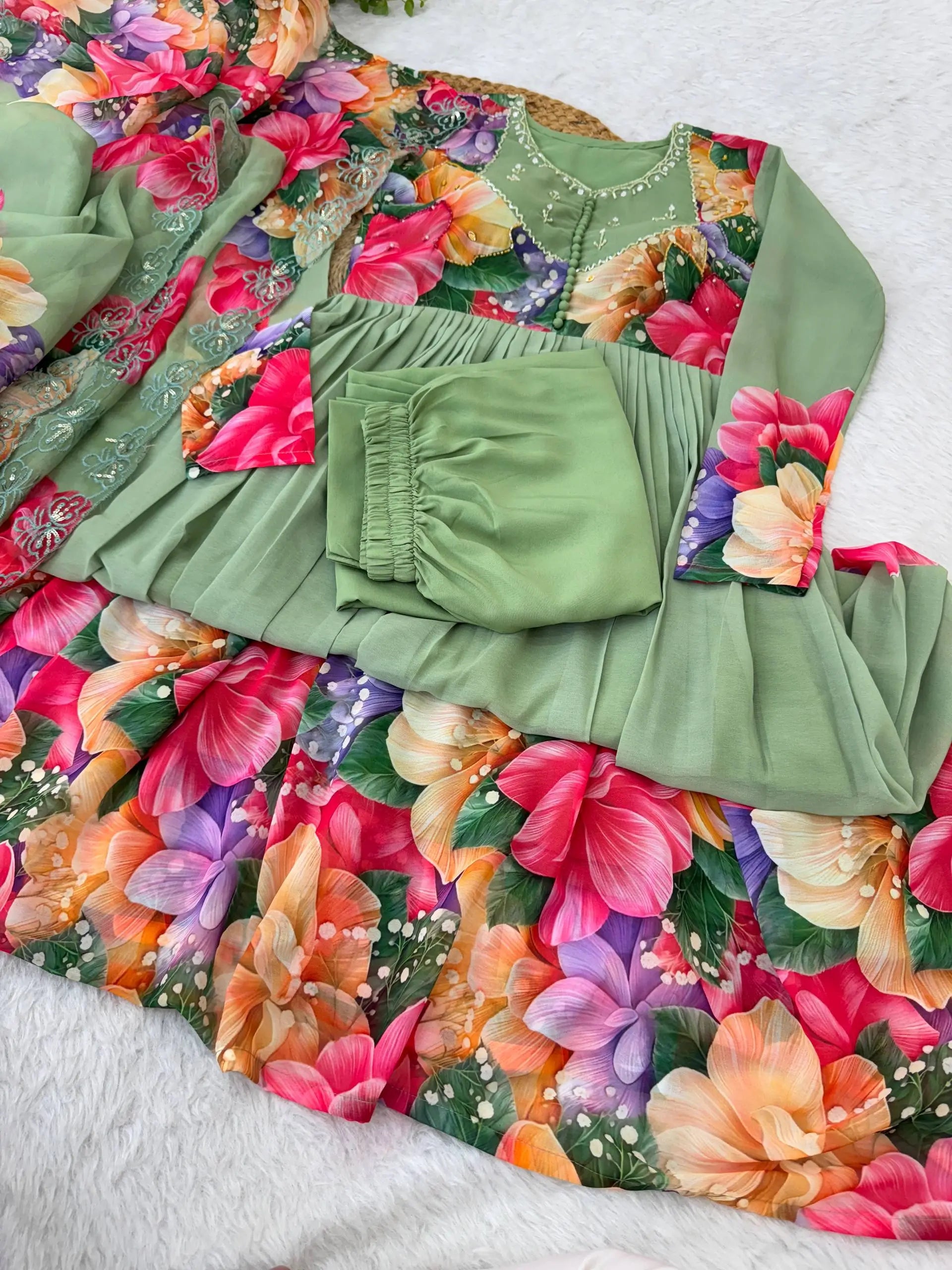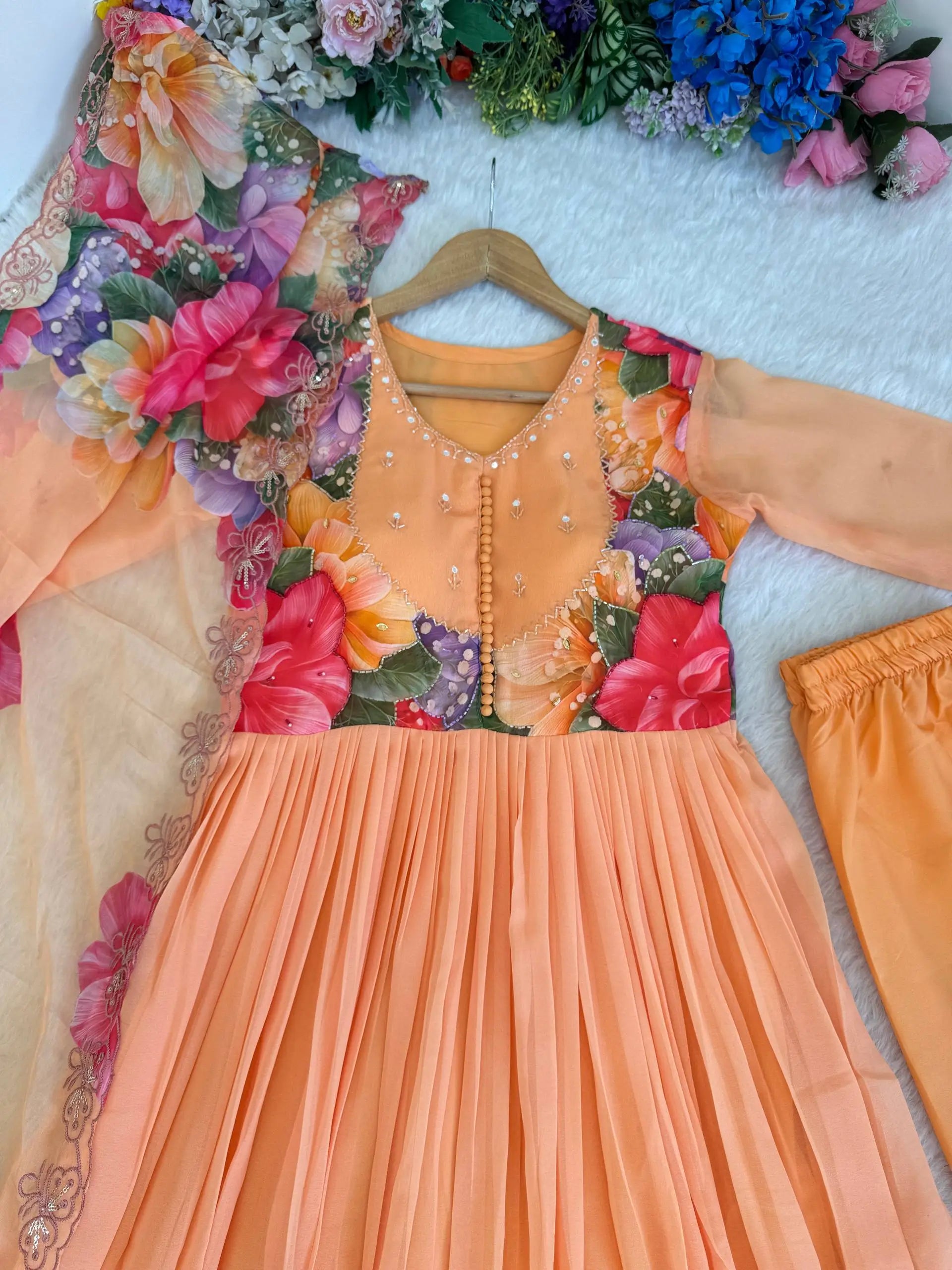 Add a refreshing charm to your ethnic wardrobe with this beautifully designed Anarkali gown set. Crafted in premium fox georgette, the gown features a flattering 3-meter flair with full-length sleeves and elegant handwork on the neckline and cuffs. Lined with American heavy butter cotton, it ensures both comfort and style, making it ideal for long wear during festive occasions.
