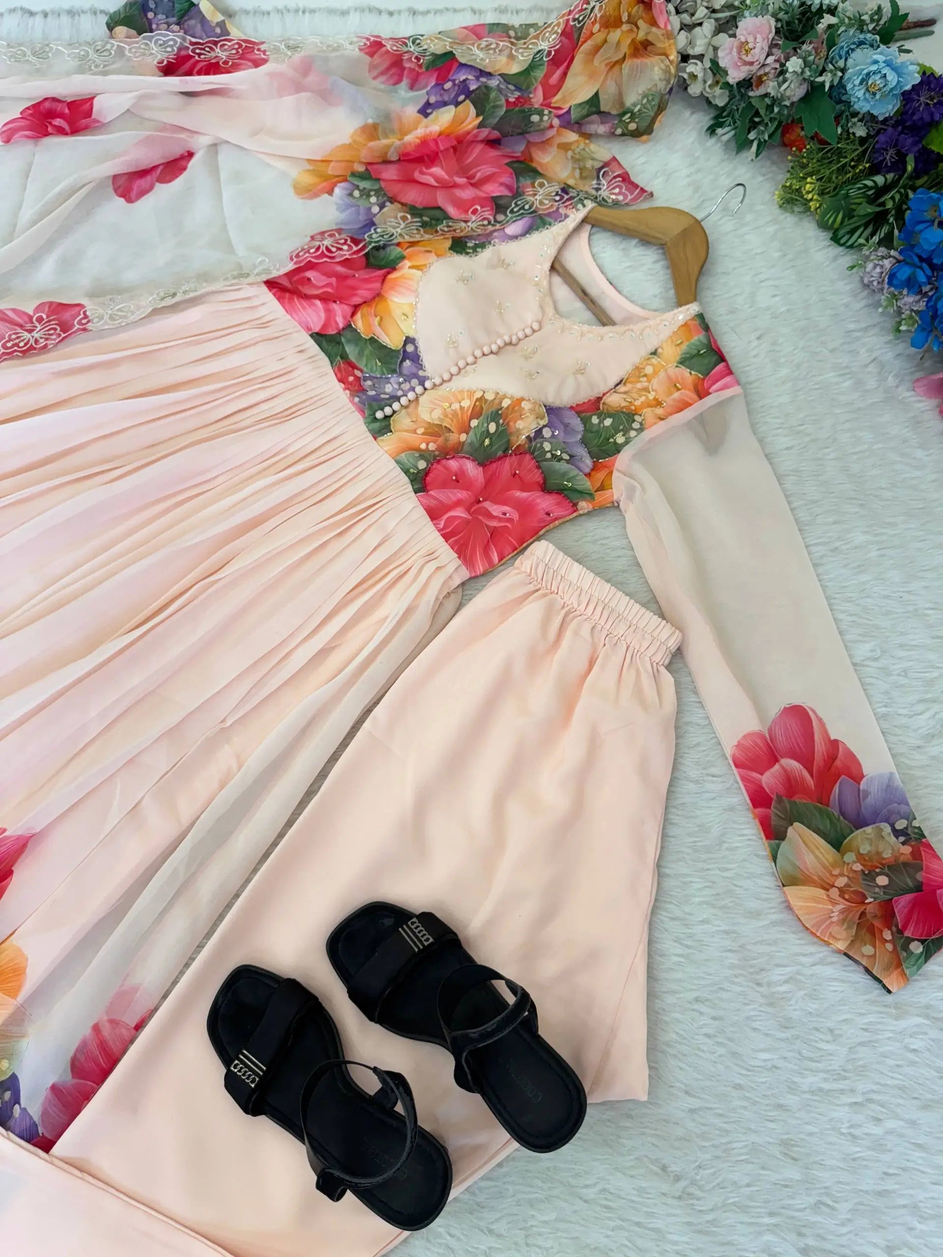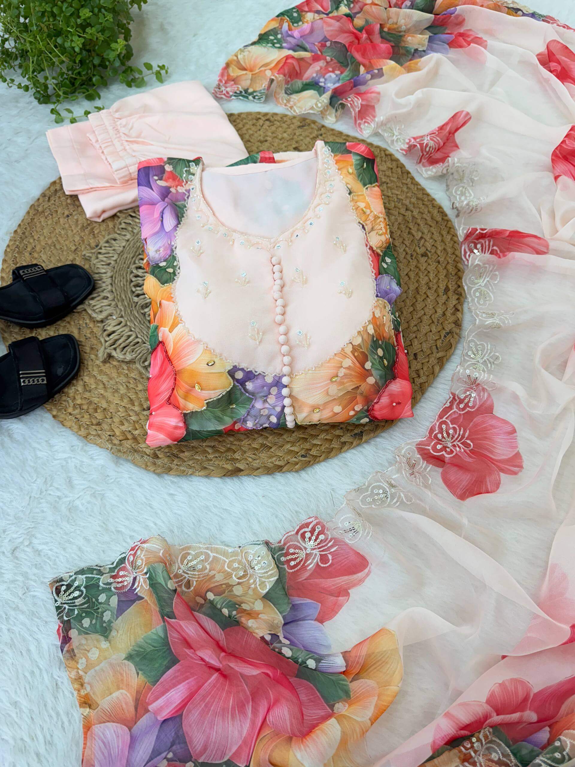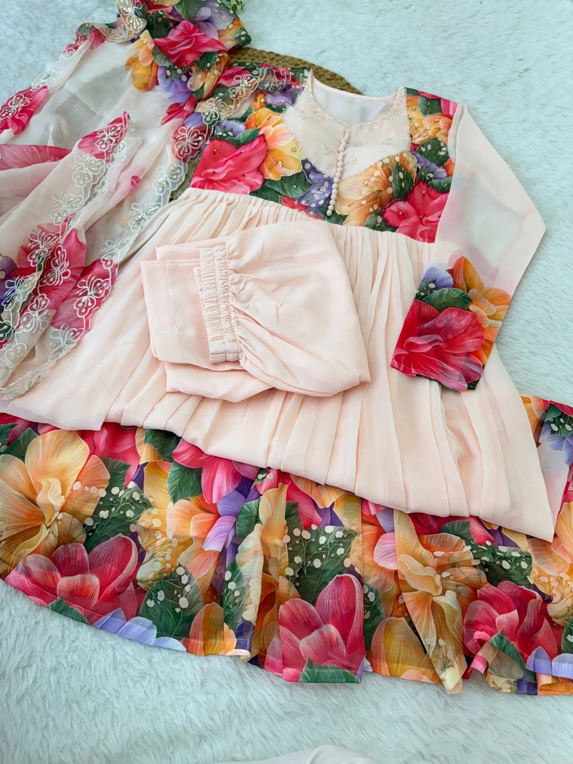 The look is completed with a digitally printed taby silk dupatta enhanced with sequin embroidery and a delicate border, creating a striking blend of tradition and modern elegance. Paired with a heavy American crepe pant for a perfect silhouette, this three-piece set makes a versatile choice for weddings, parties, and festive gatherings.
