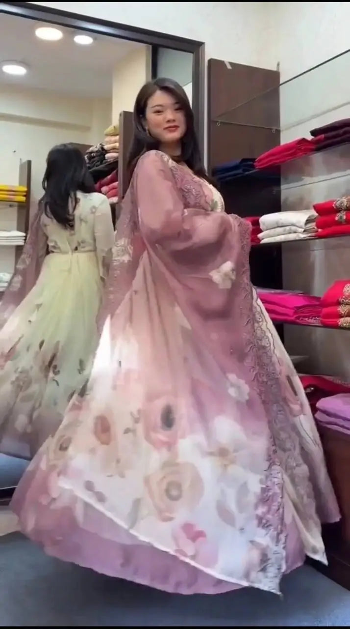 This floral embroidered faux georgette gown set is a perfect blend of elegance and comfort, designed to make a statement at any occasion. The gown is crafted in premium faux georgette with embroidery sequence work, full sleeves, and a graceful 3-meter flair. It comes fully stitched with a soft heavy micro cotton inner, ensuring ease and comfort throughout the day. Paired with a matching micro cotton pant for a sleek look, the outfit is completed with a delicate faux georgette dupatta enhanced with embroidery sequence detailing and a lace border. With a flattering length of 51–52 inches and lightweight finish, this ready-to-wear set is ideal for festive celebrations, parties, and weddings.