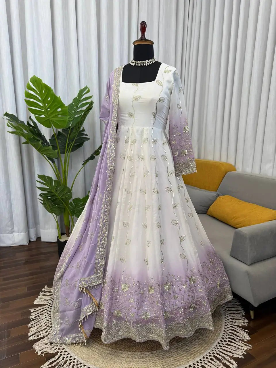 The Anarkali and dupatta are made from star georgette, while the pant and lining are crafted from micro cotton.