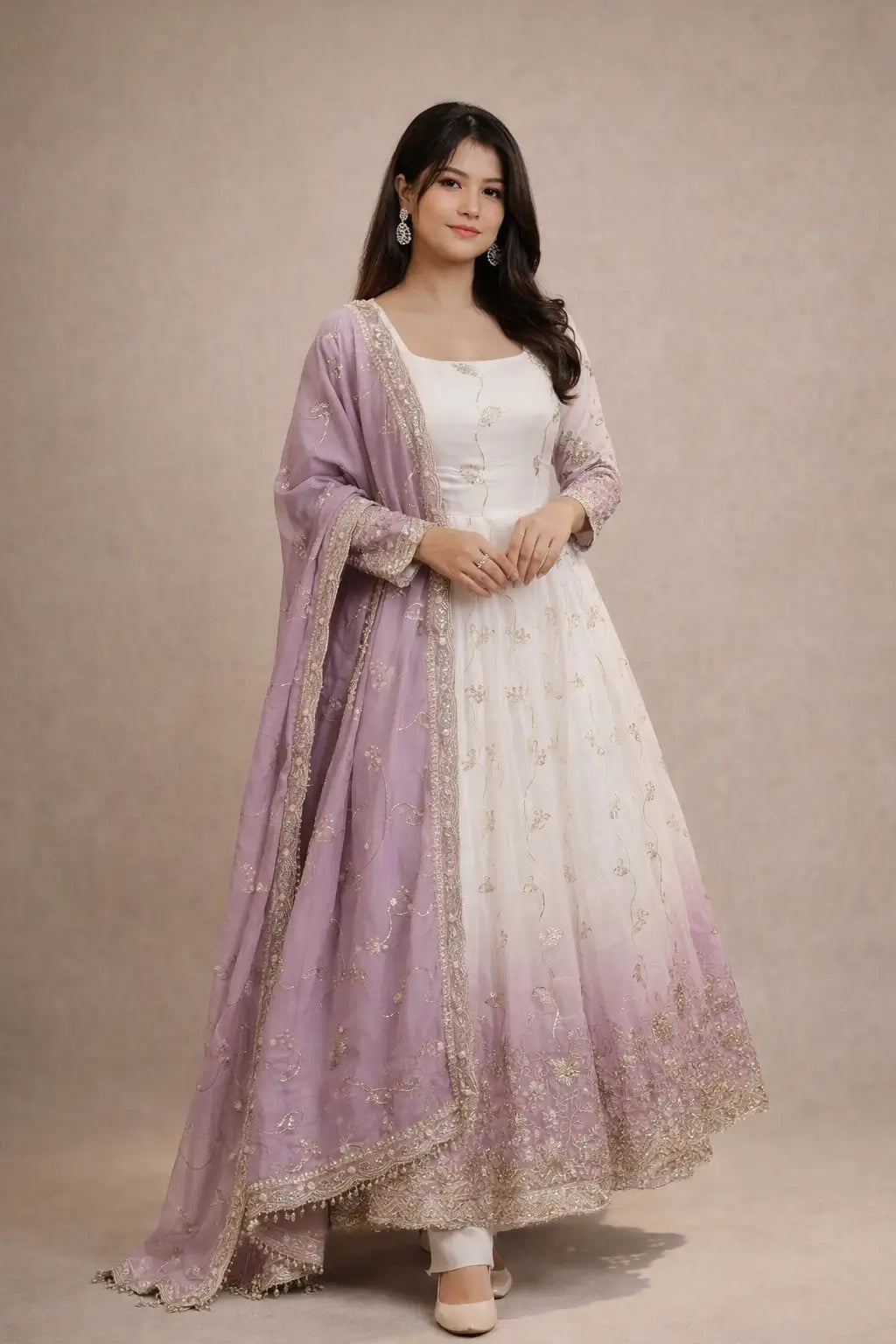 Elevate your ethnic wardrobe with this timeless Ivory Grace Anarkali Suit Set, crafted to bring elegance and comfort together in one refined silhouette. Designed in premium star georgette fabric, this Anarkali flows beautifully with every step, offering a flattering and graceful look for festive and formal occasions.