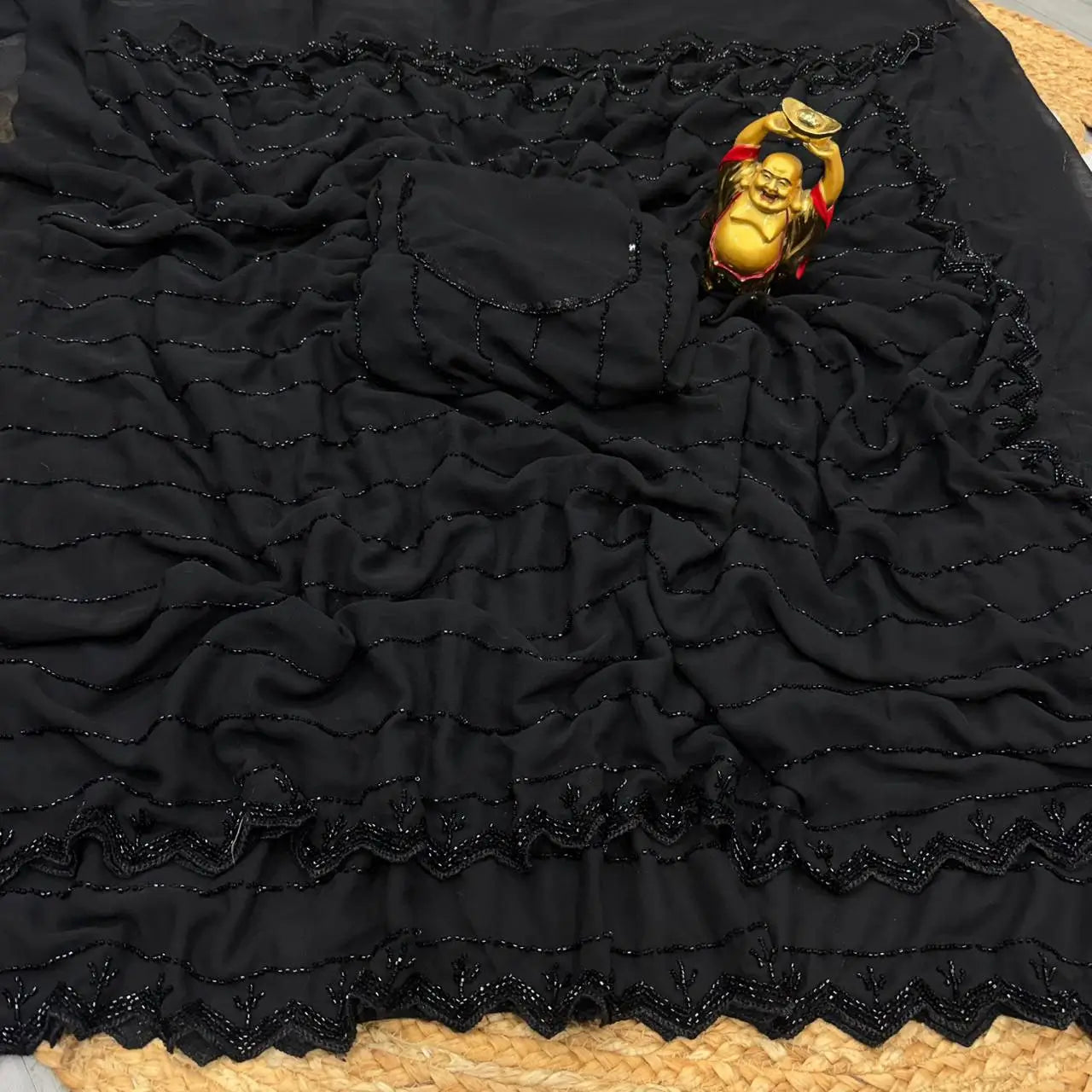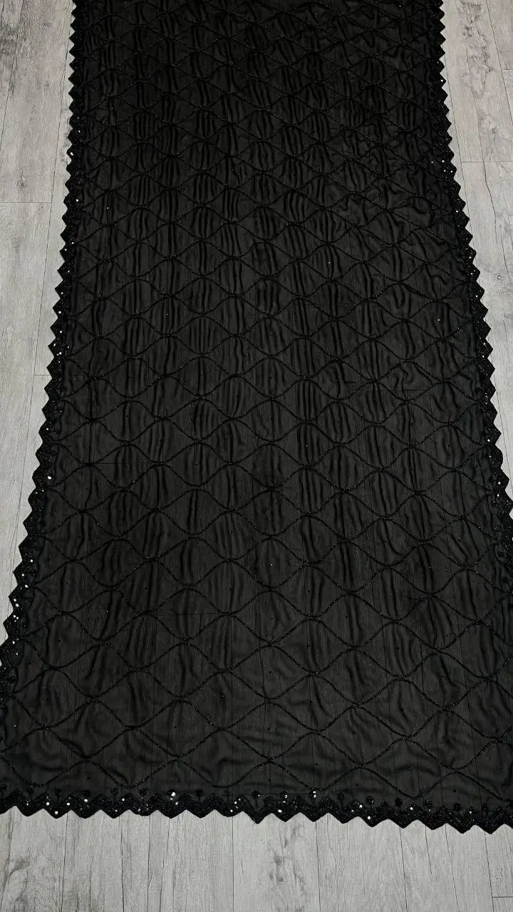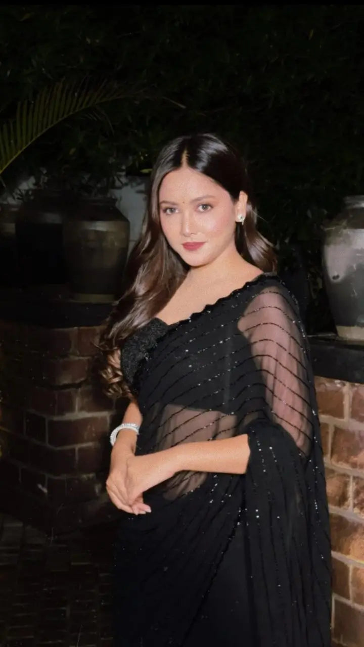 This black party wear saree is crafted on pure georgette fabric with a soft velvet shine that enhances its rich and luxurious appeal. The saree is beautifully adorned with intricate beads, sequins, and cutdana handwork, creating a graceful all over pattern that reflects fine craftsmanship. Lightweight yet festive, it drapes effortlessly and offers both comfort and sophistication. Paired with a matching blouse piece featuring coordinated work, this saree is an ideal choice for evening parties, festive occasions, and special celebrations where timeless elegance is desired.