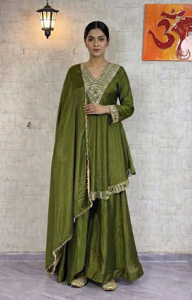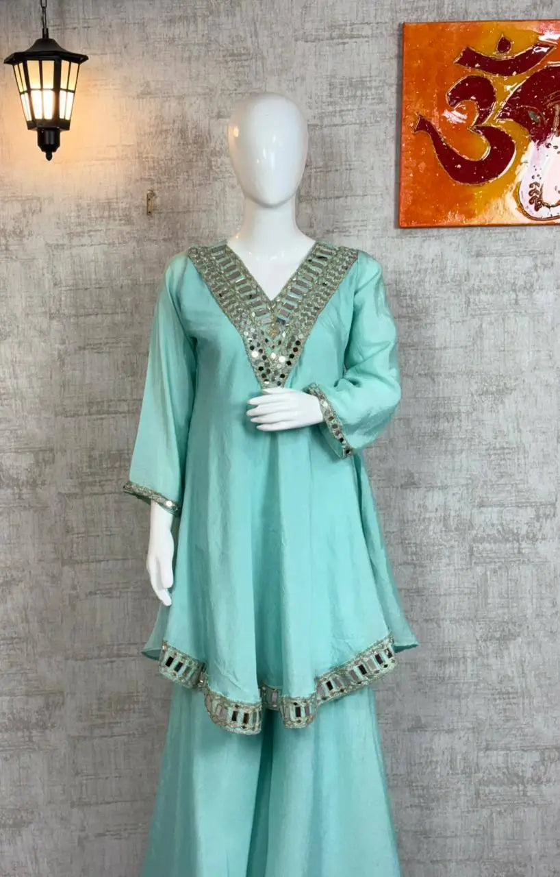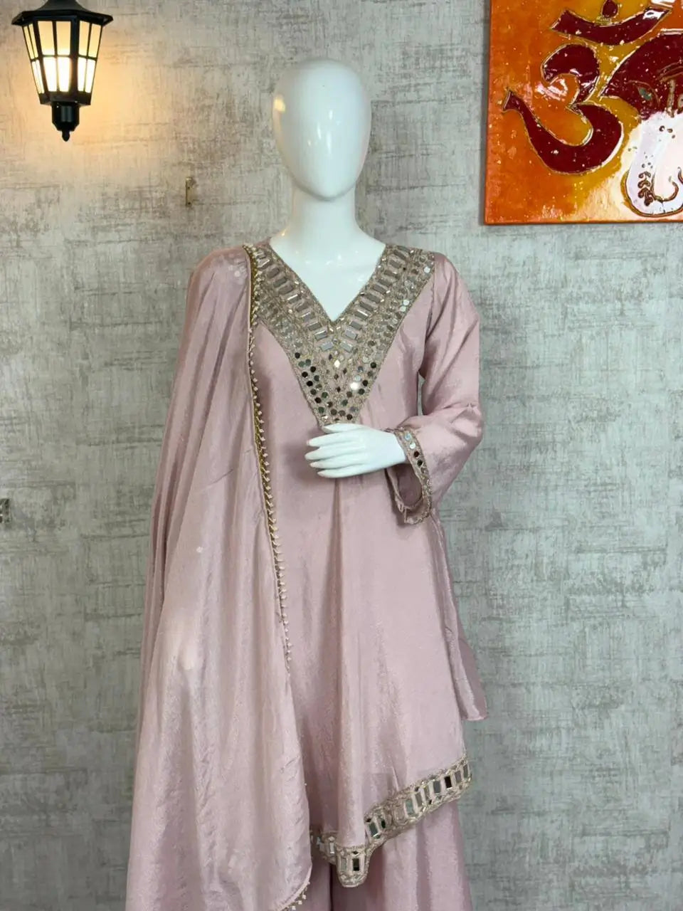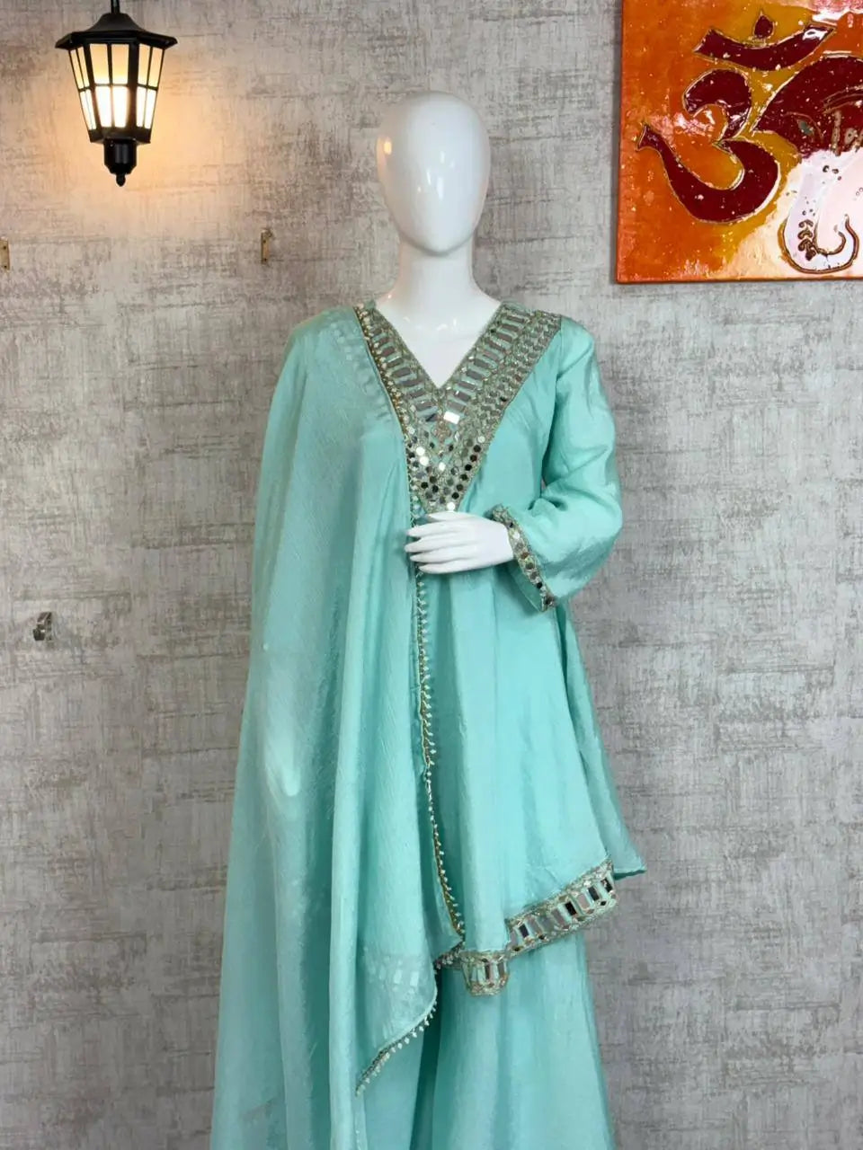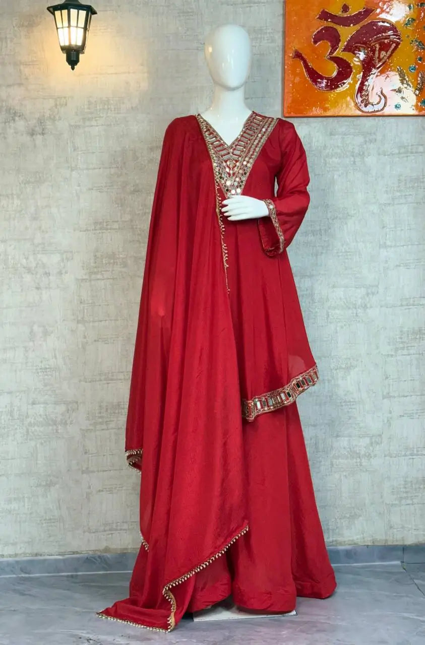 This elegant Anarkali plazo set is crafted from premium cosmos fabric, offering a soft, luxurious feel with a graceful flow. The top features intricate thread work embellished with real mirror detailing, giving it a festive and modern appeal. A comfortable micro inner ensures smooth wear, while the generous 4.5 meter flair adds a beautifully voluminous silhouette. The matching plazo is fully stitched with an elastic waist for an easy and flexible fit. The coordinated dupatta, crafted from cosmos fabric and finished with a four side fancy lace border, completes the ensemble with refined elegance. Ideal for festive functions, parties and traditional celebrations, this set combines comfort, craftsmanship and timeless style.