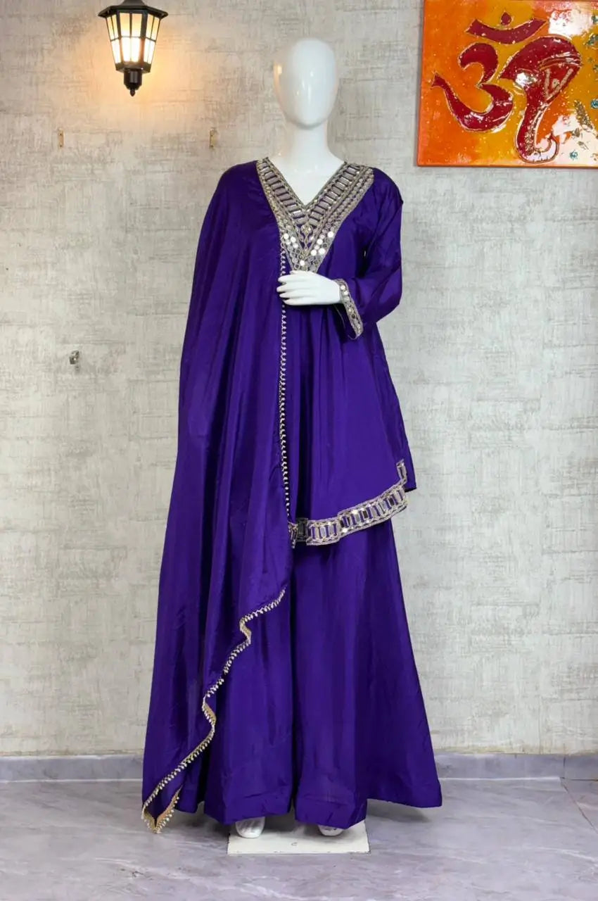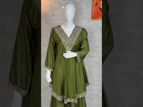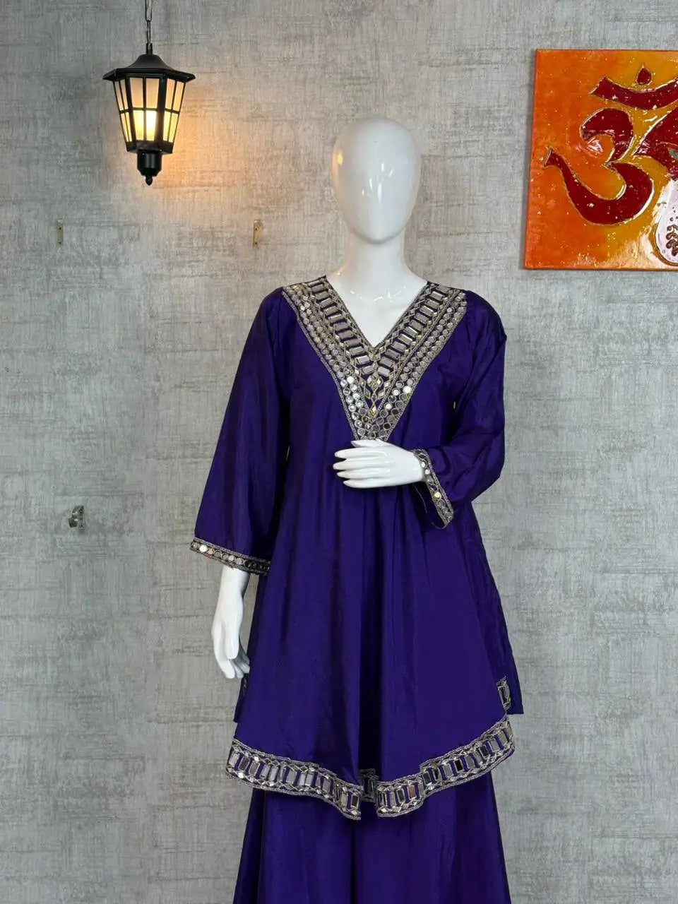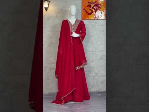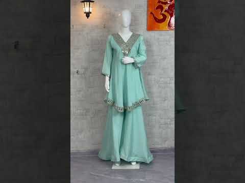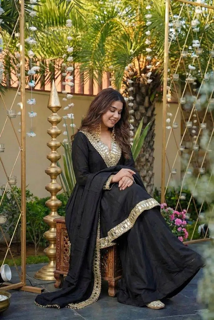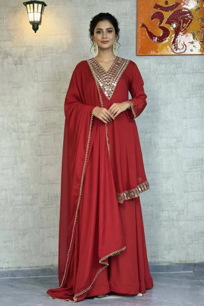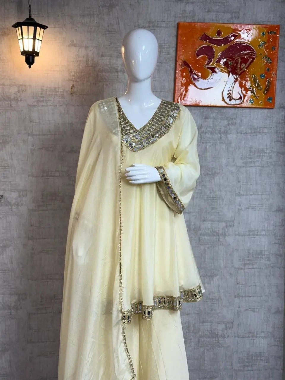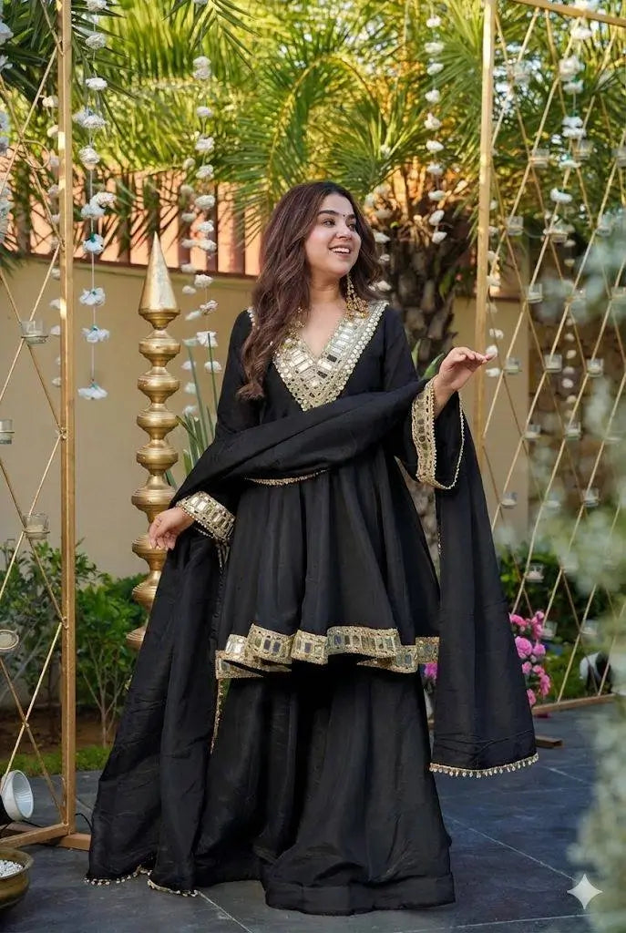 This elegant Anarkali plazo set is crafted from premium cosmos fabric, offering a soft, luxurious feel with a graceful flow. The top features intricate thread work embellished with real mirror detailing, giving it a festive and modern appeal. A comfortable micro inner ensures smooth wear, while the generous 4.5 meter flair adds a beautifully voluminous silhouette. The matching plazo is fully stitched with an elastic waist for an easy and flexible fit. The coordinated dupatta, crafted from cosmos fabric and finished with a four side fancy lace border, completes the ensemble with refined elegance. Ideal for festive functions, parties and traditional celebrations, this set combines comfort, craftsmanship and timeless style.