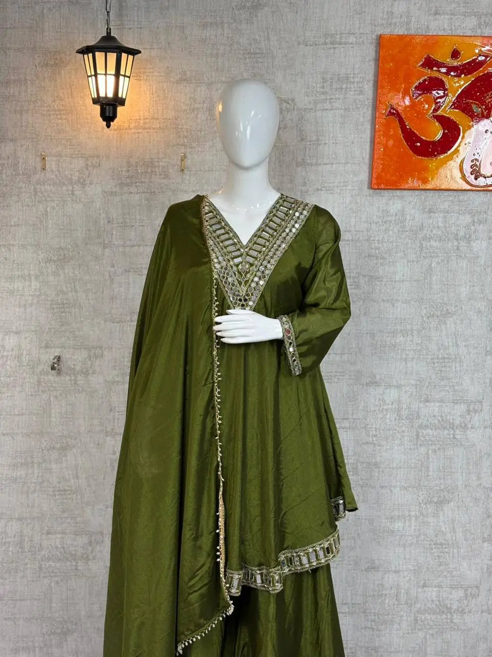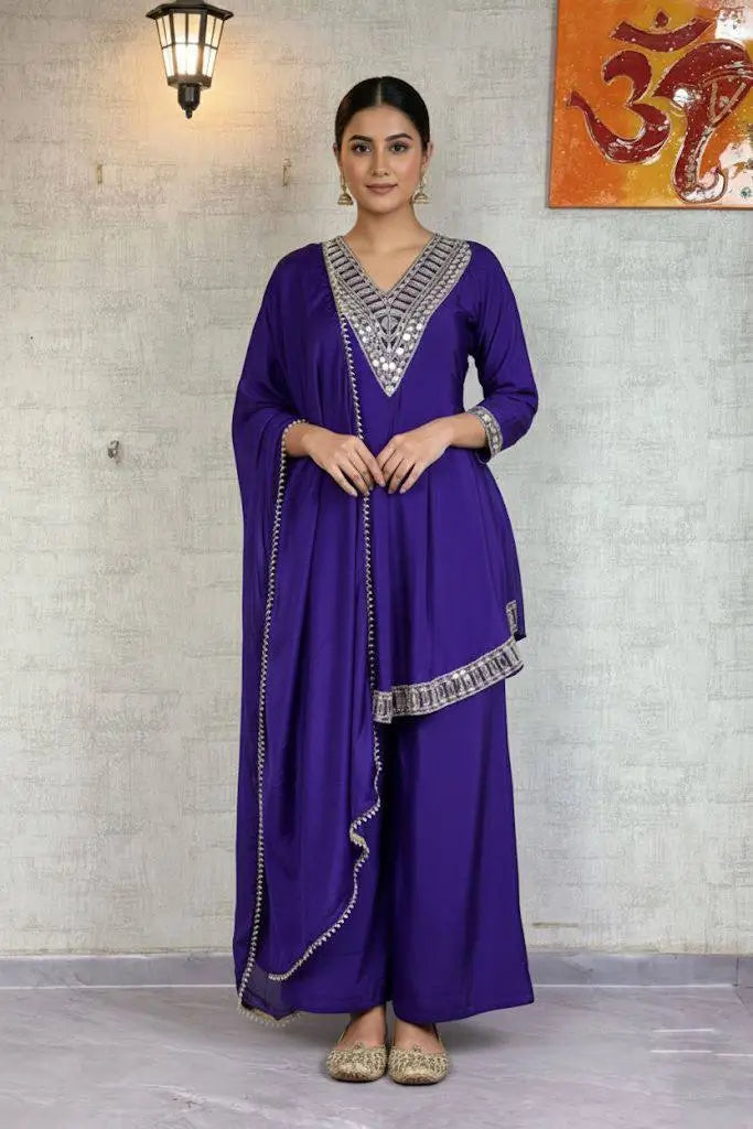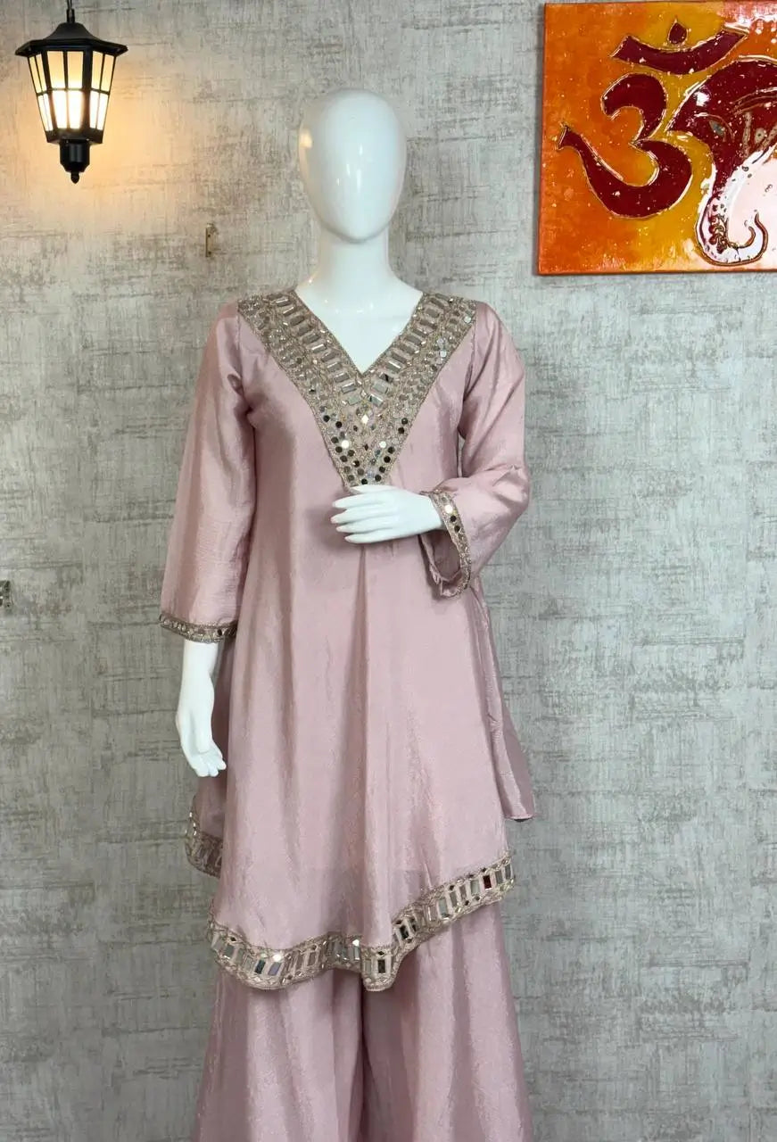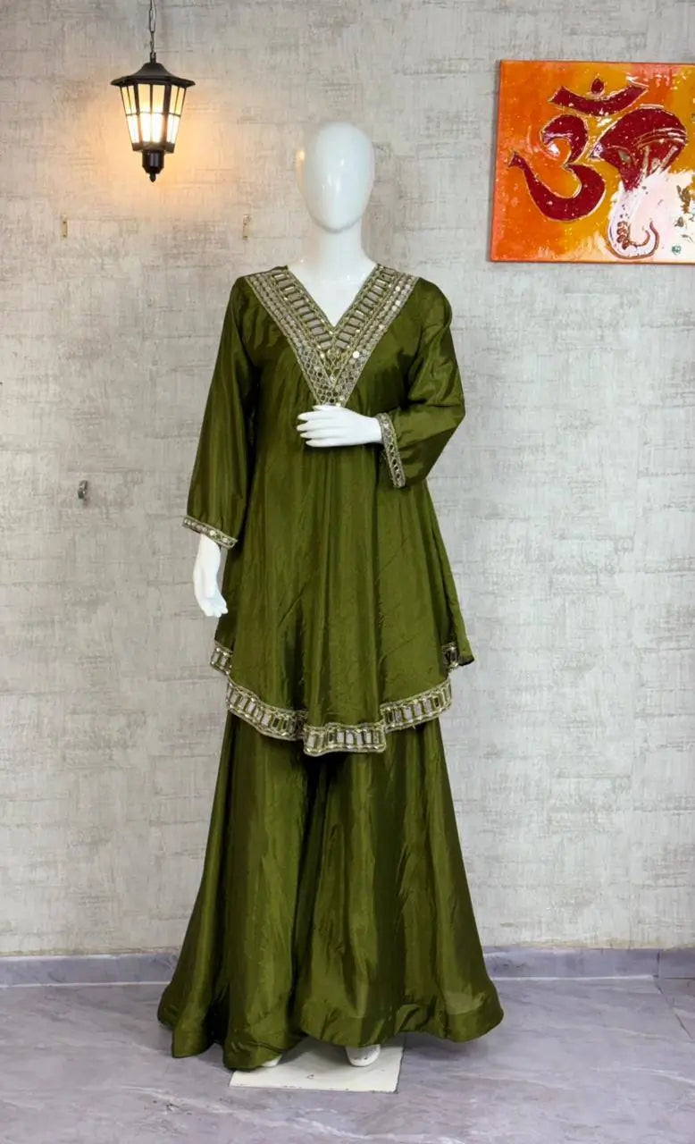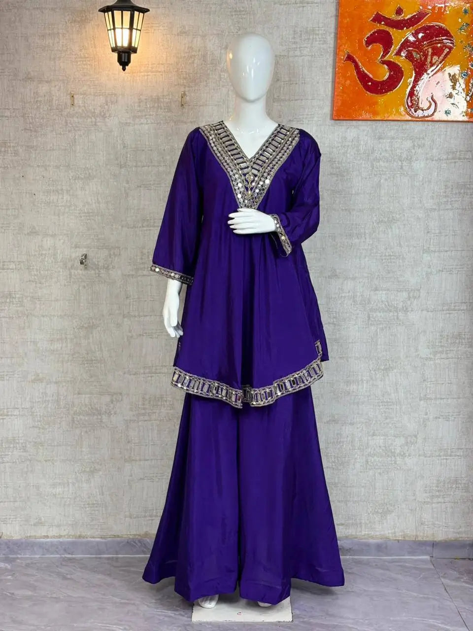 This elegant Anarkali plazo set is crafted from premium cosmos fabric, offering a soft, luxurious feel with a graceful flow. The top features intricate thread work embellished with real mirror detailing, giving it a festive and modern appeal. A comfortable micro inner ensures smooth wear, while the generous 4.5 meter flair adds a beautifully voluminous silhouette. The matching plazo is fully stitched with an elastic waist for an easy and flexible fit. The coordinated dupatta, crafted from cosmos fabric and finished with a four side fancy lace border, completes the ensemble with refined elegance. Ideal for festive functions, parties and traditional celebrations, this set combines comfort, craftsmanship and timeless style.