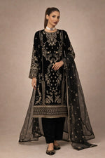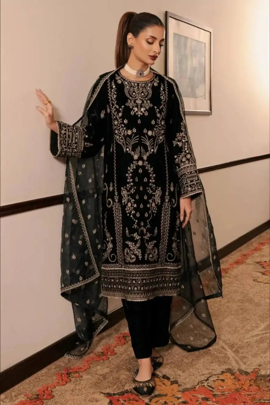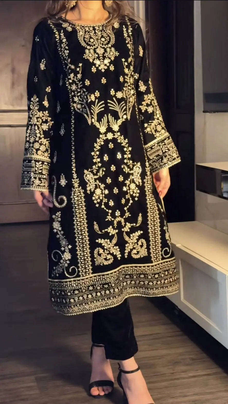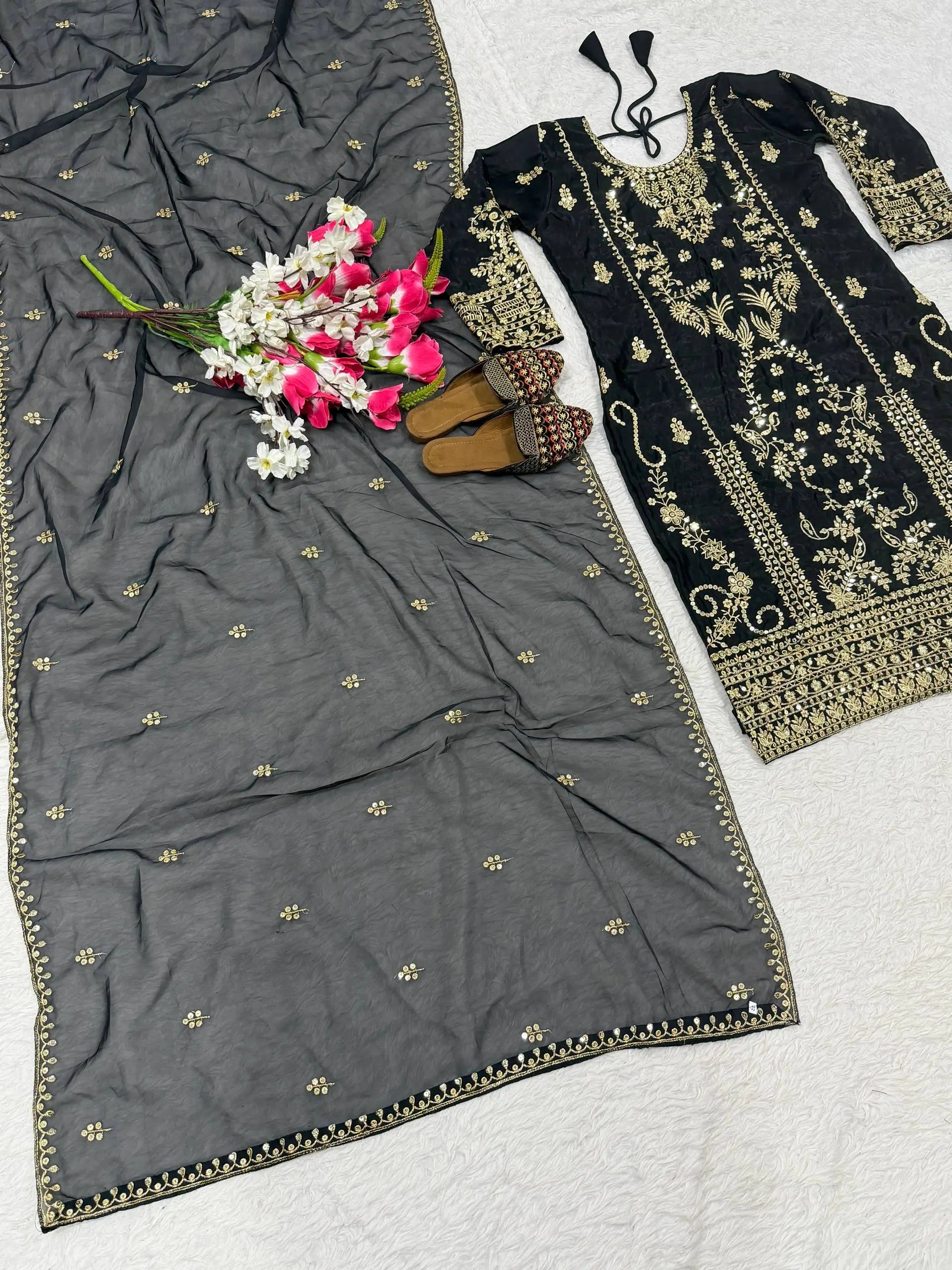 This elegant kurta pant set is crafted from premium Korean satin silk, offering a rich sheen and a graceful drape that enhances its festive appeal. The kurta is adorned with intricate embroidery highlighted by 5mm sequin work, creating a refined and luxurious look. A heavy micro cotton inner ensures comfort throughout extended wear. The matching pants are made from the same Korean satin silk fabric, maintaining a coordinated and polished silhouette. The ensemble is completed with a heavy tabby organza dupatta, beautifully embellished with embroidery and sequin work, adding sophistication and charm. Ideal for festive celebrations, evening functions, and traditional gatherings, this outfit blends modern elegance with classic craftsmanship.