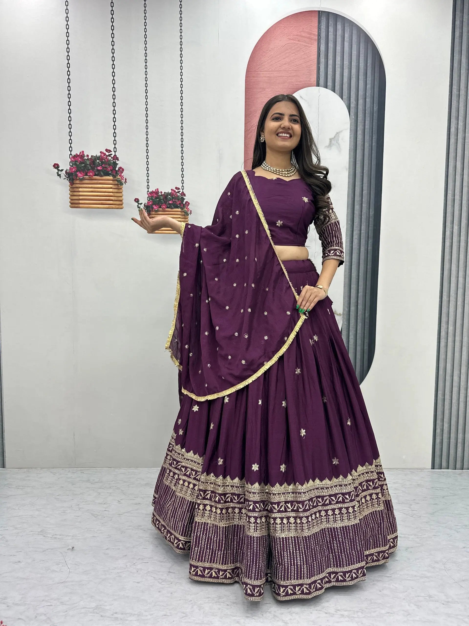 Enhance your festive and wedding wardrobe with this elegant lehenga choli set crafted in premium chinon fabric. The choli features detailed embroidery thread and sequins work that adds a refined shimmer while maintaining a graceful traditional appeal. Designed with a soft micro cotton inner, it offers comfort along with a structured fit and comes fully stitched for ease of wear. The matching lehenga is made from flowing chinon fabric with coordinated embroidery and sequins work, creating a rich look with a beautiful 3.50 meter flair that moves effortlessly with every step. Completing the ensemble is a matching chinon dupatta adorned with delicate embroidery, adding the perfect finishing touch for festive functions, weddings, and special celebrations.