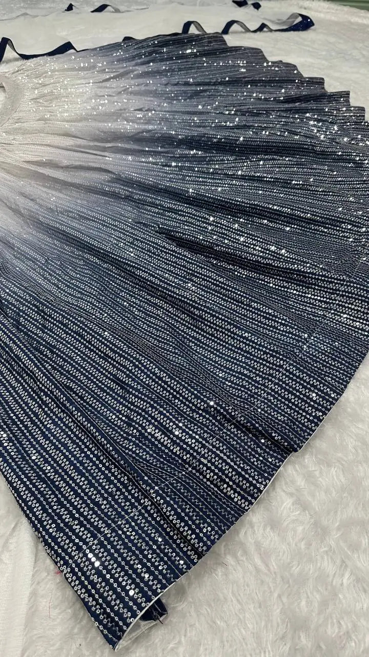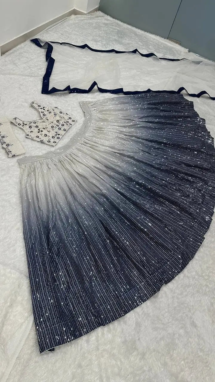 This stunning lehenga set is crafted from shaded georgette silk and embellished with fine sequins work that creates a radiant gradient effect. The lehenga features a 3.25 meter flair for a graceful, voluminous silhouette suitable for sangeet, receptions and festive celebrations. A Banglori silk waist belt with dori and sequins work is provided to enhance structure and add a defined finishing touch. The blouse is made from Banglori satin silk with detailed dori and sequins work on both the front and back, supplied unstitched for a customized fit. Completing the ensemble is a soft net dupatta adorned with an elegant sequins border, tying the entire look together with a refined and modern appeal. This set combines premium craftsmanship, contemporary styling and comfortable wear.