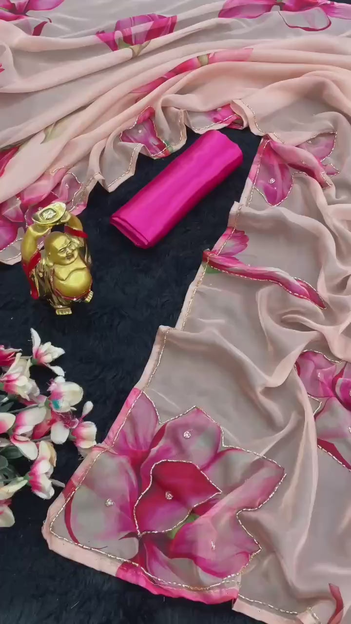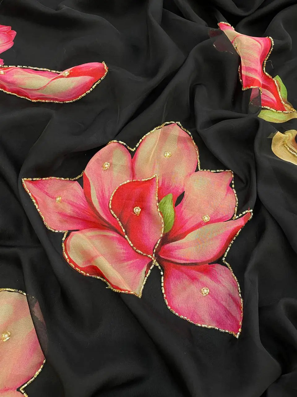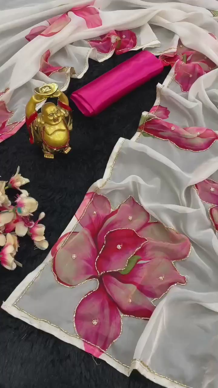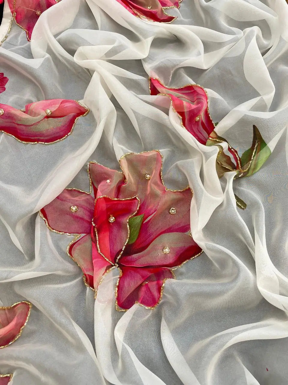 This elegant Tabby Organza Silk saree features a beautiful floral hand print that adds a fresh and graceful appeal to your look. The soft organza drapes effortlessly while the delicate cutdana detailing enhances the overall finish with subtle designer charm.