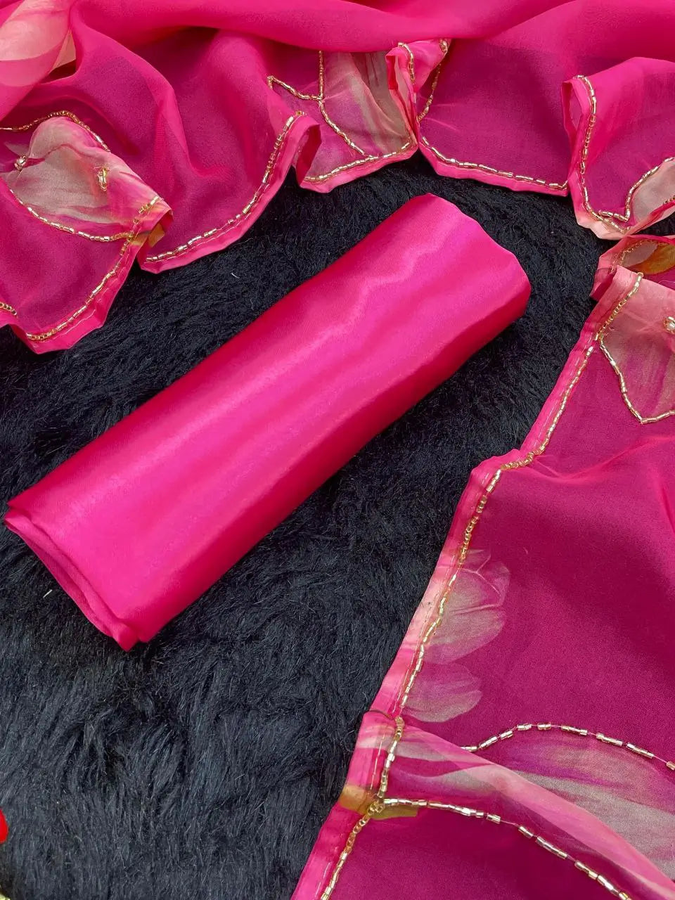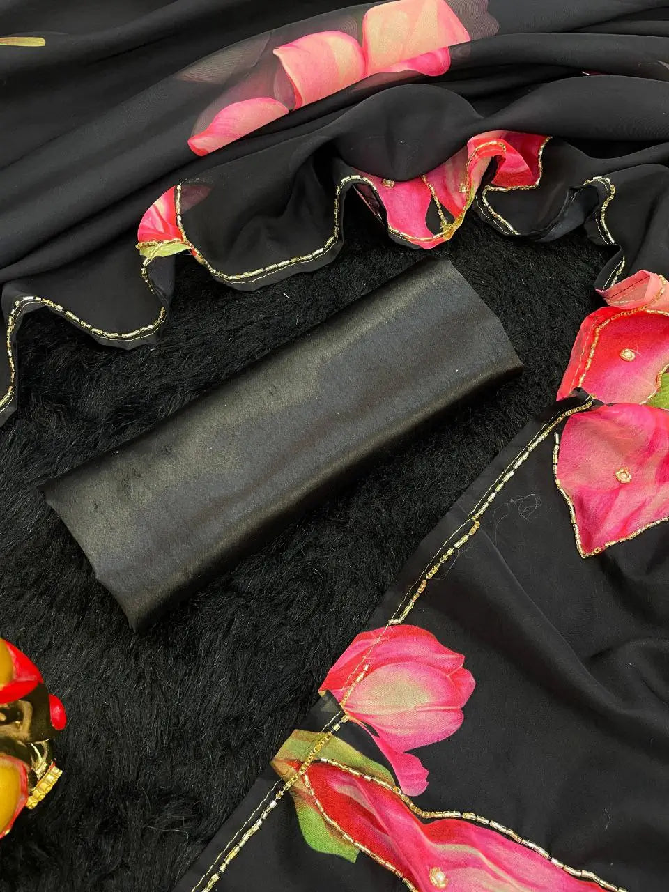 It comes with a smooth satin silk blouse piece that perfectly complements the saree, giving you a complete and refined festive or casual occasion outfit. Lightweight, breathable and visually stunning, this saree is ideal for day events, celebrations and gatherings.