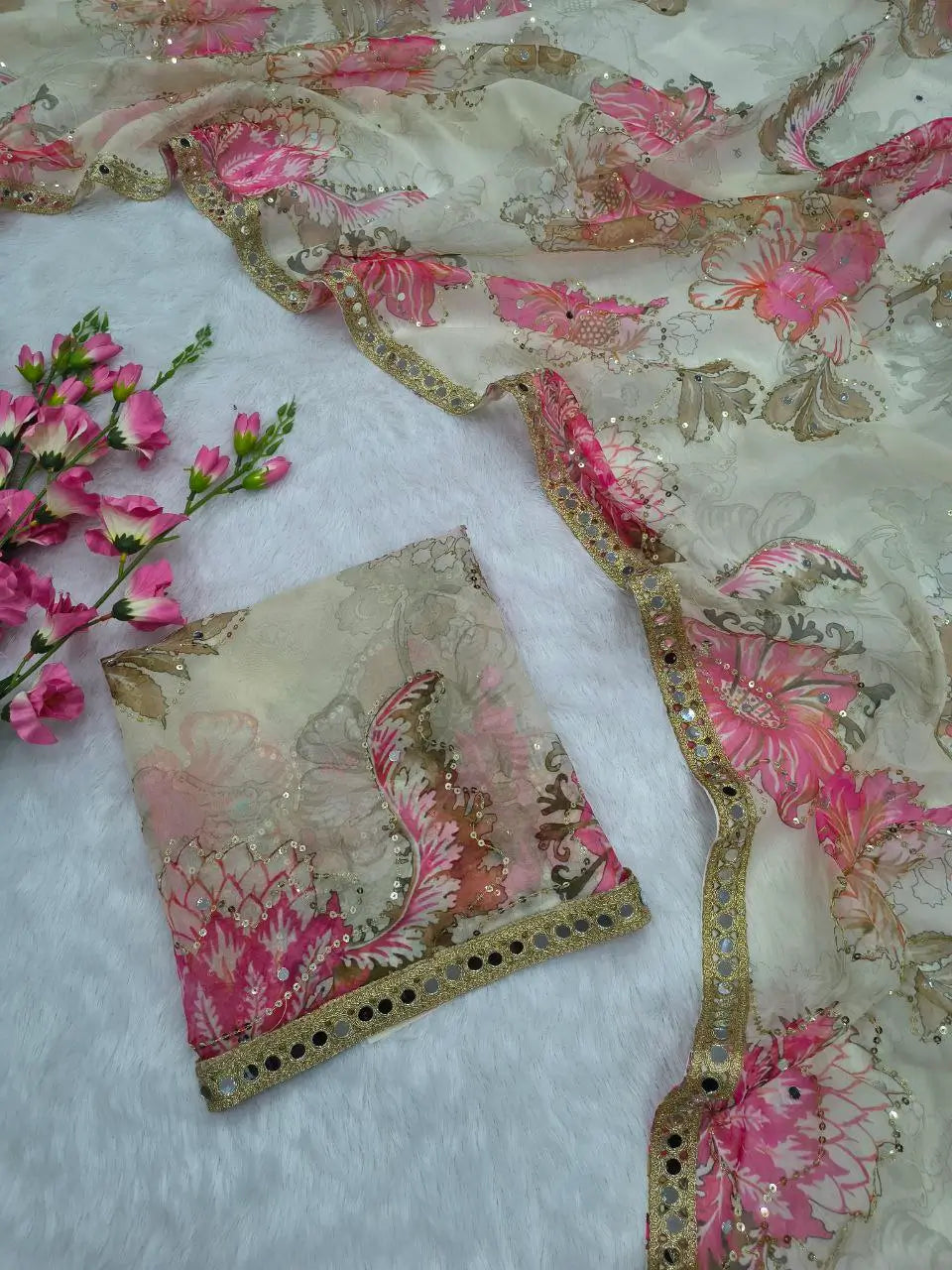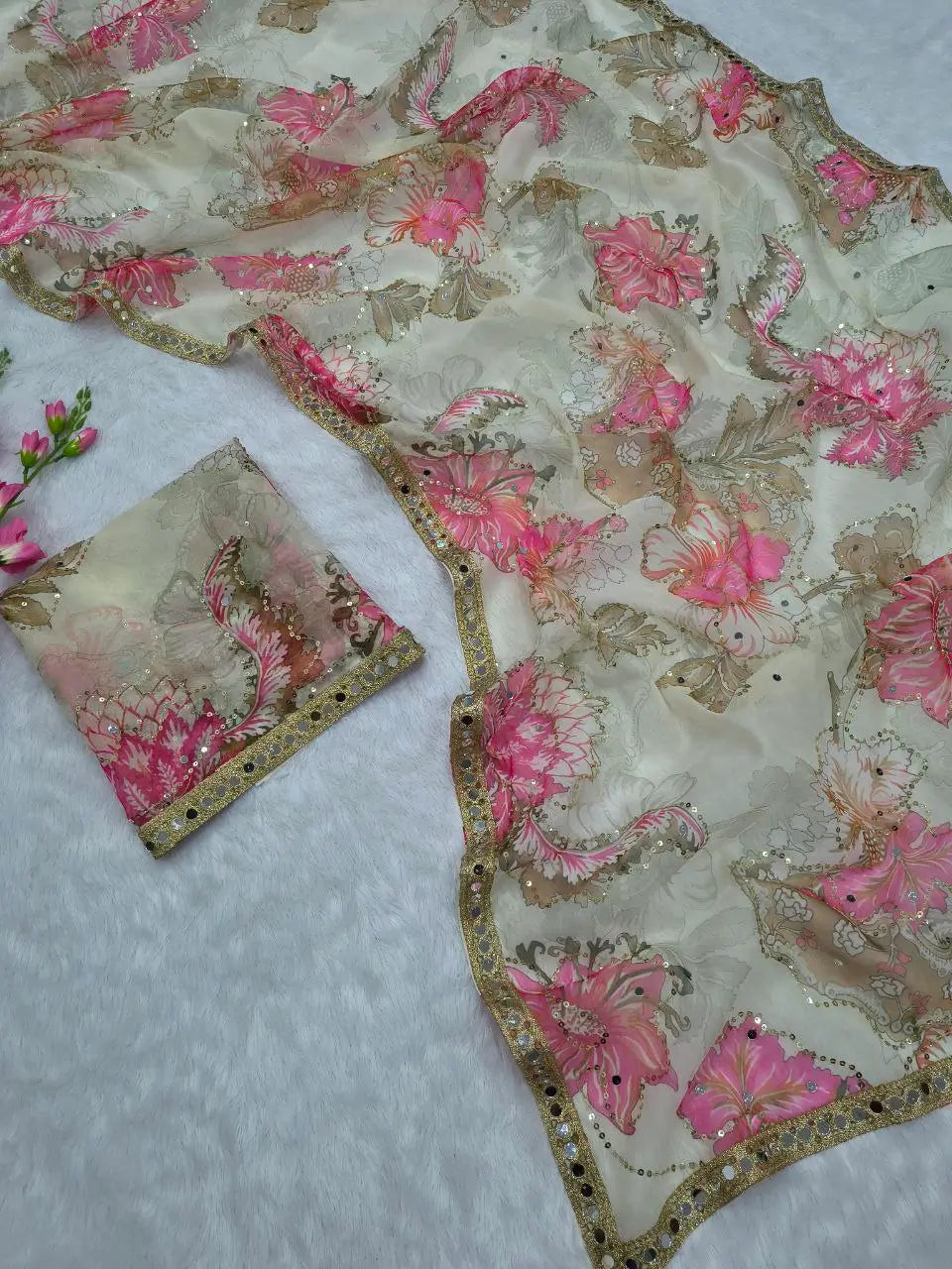 Elevate your ethnic wardrobe with this elegant premium Tabby silk saree, beautifully adorned with soft floral prints and exquisite handcrafted detailing. The saree features delicate sequins embroidery combined with authentic hand mirror work, giving it a rich yet graceful appeal. Finished with a stunning real mirror lace border, this saree reflects true craftsmanship and showroom-quality finesse. Paired with a matching unstitched blouse piece, this ensemble is perfect for festive occasions, parties, weddings, and elegant day functions.