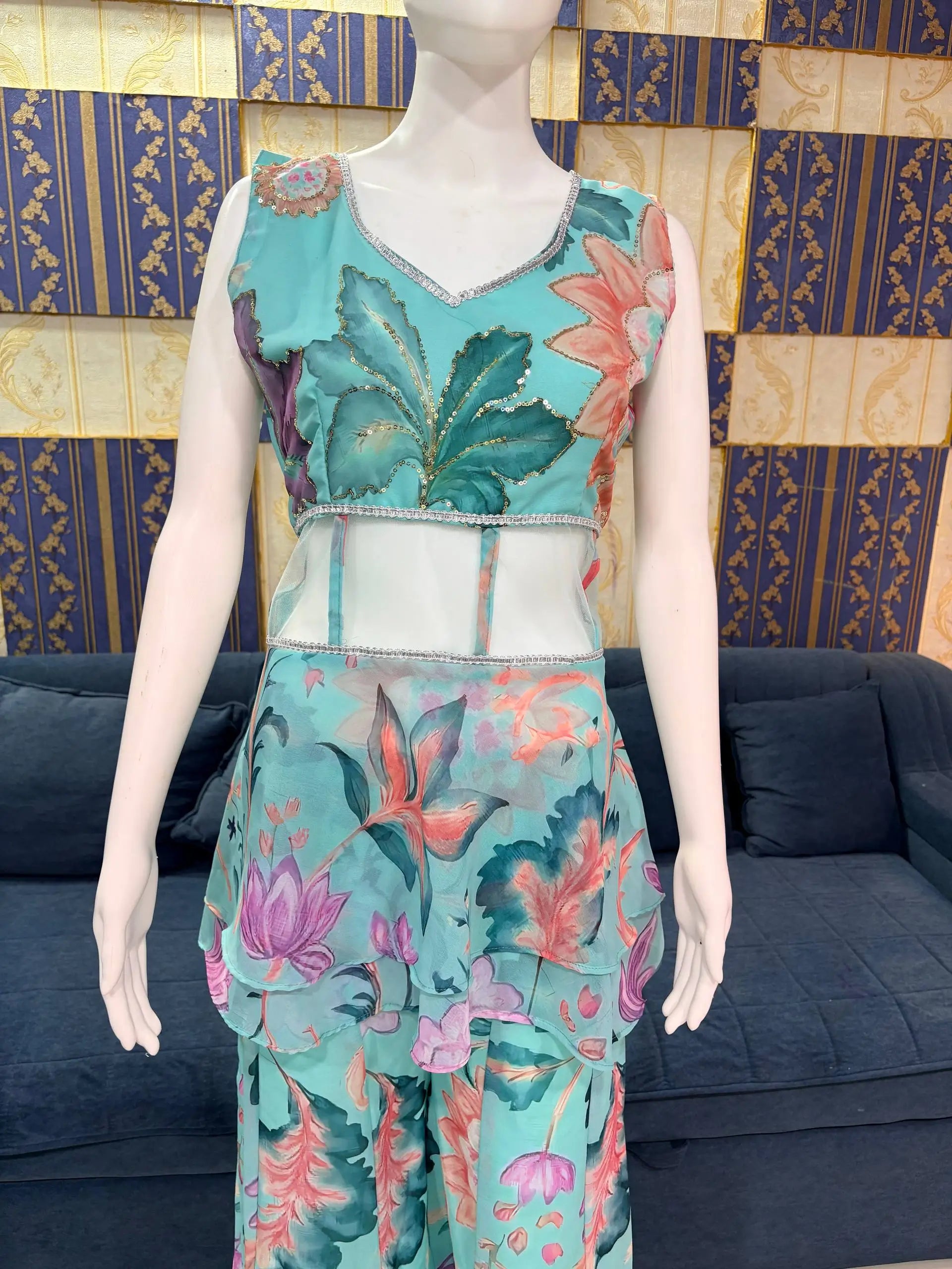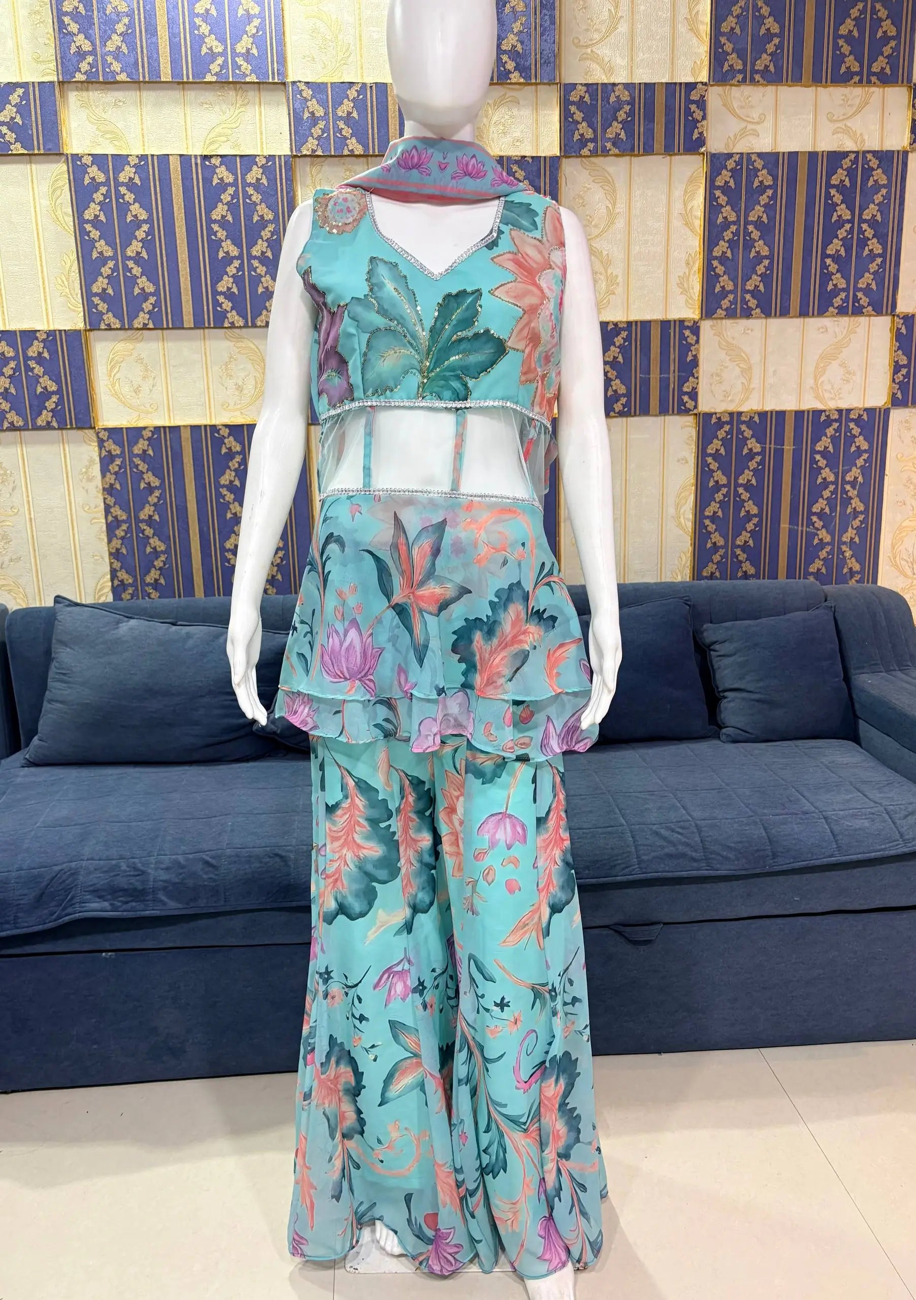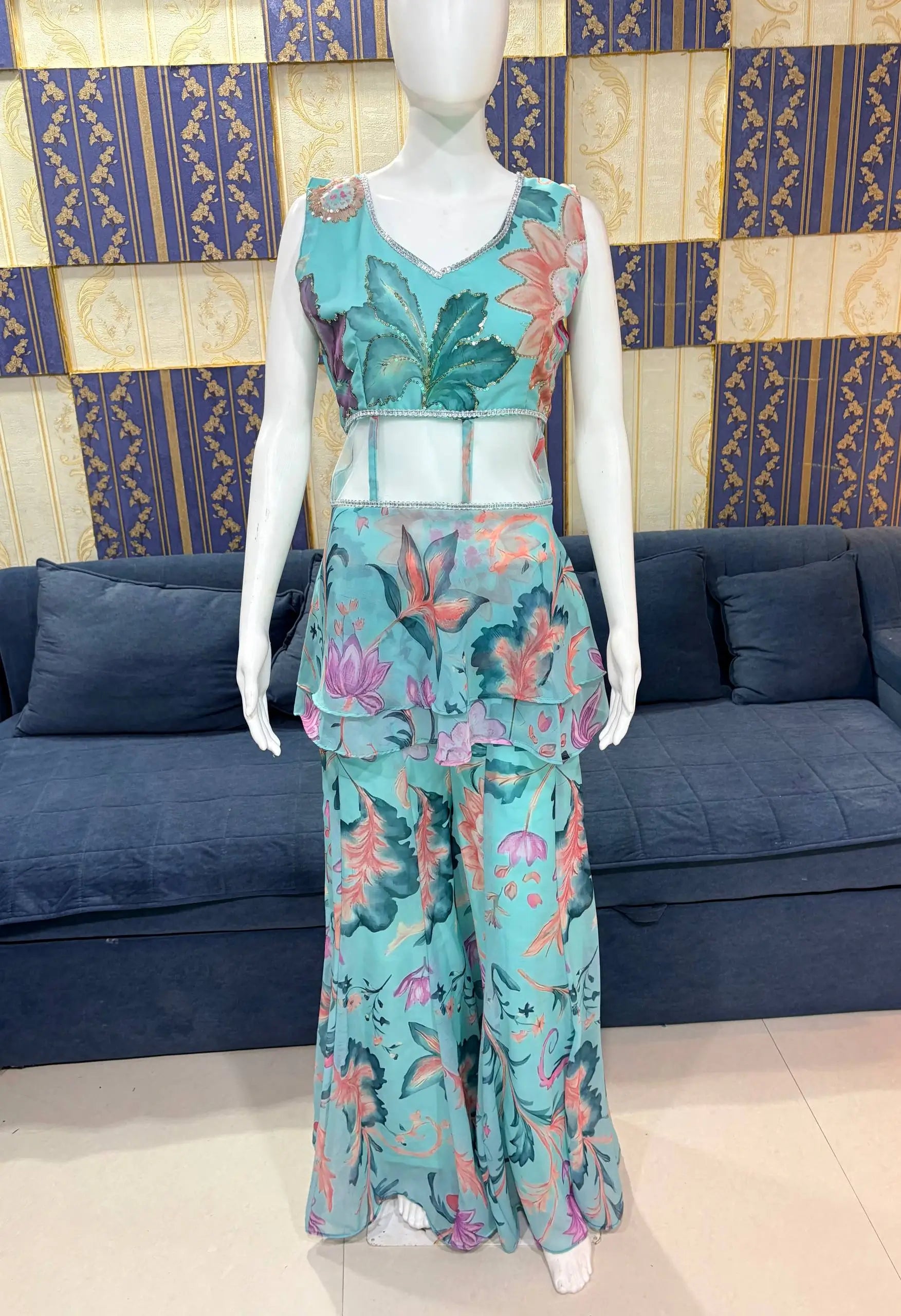 The sleeveless V neckline top features elegant sequins work blended seamlessly with vibrant digital floral prints, creating a refined yet modern look. The peplum style silhouette enhances the overall structure while maintaining a soft, feminine appeal. Paired with a fully stitched fox georgette palazzo adorned with coordinated digital print work, this outfit offers a flattering flare and fluid movement.