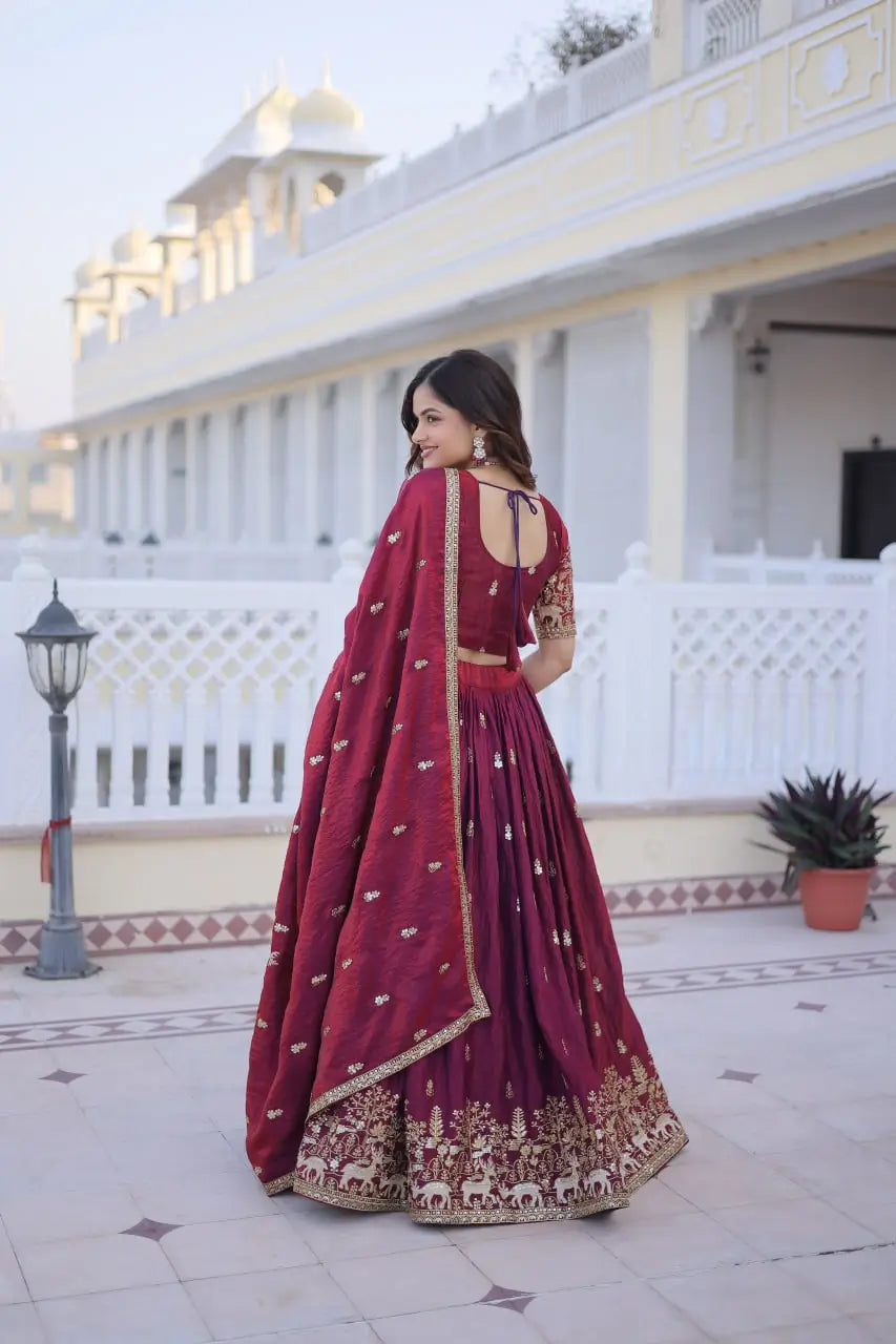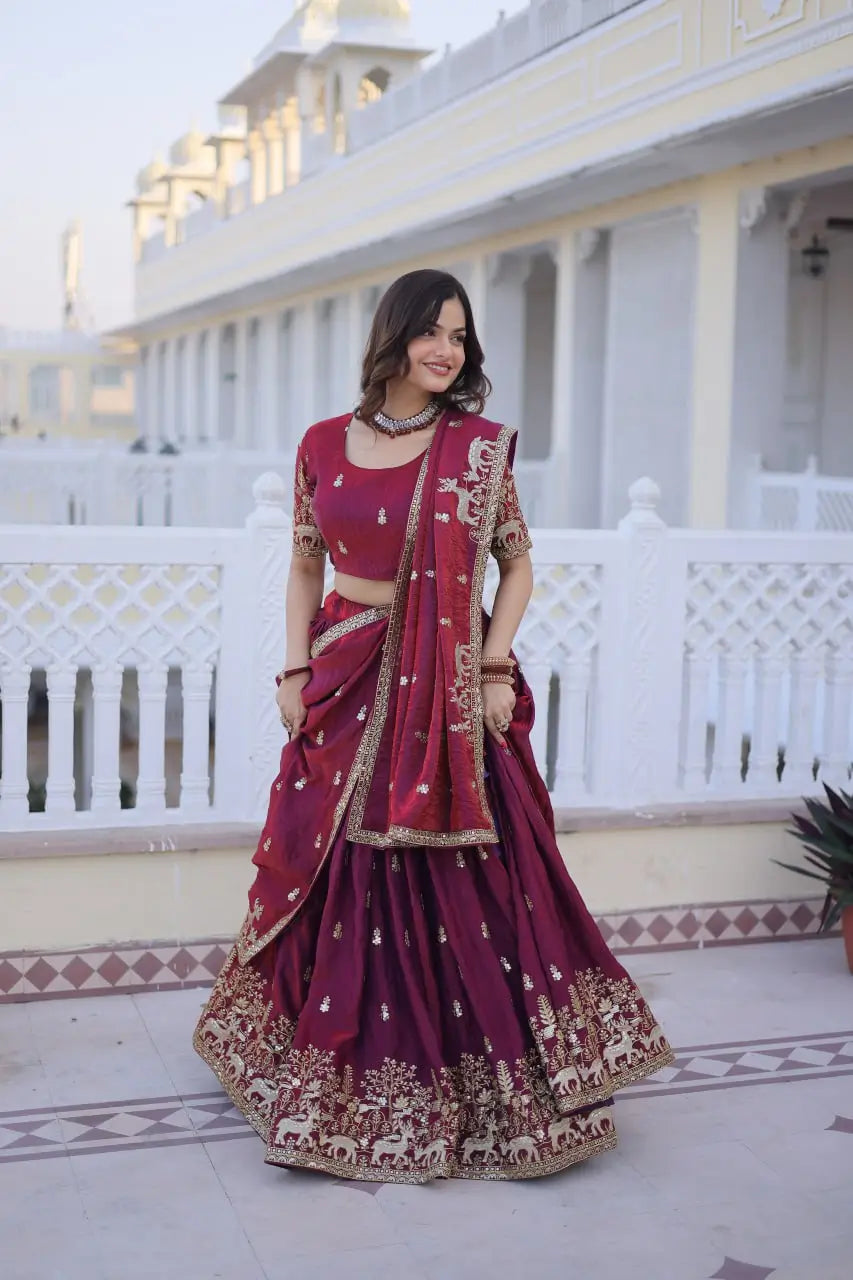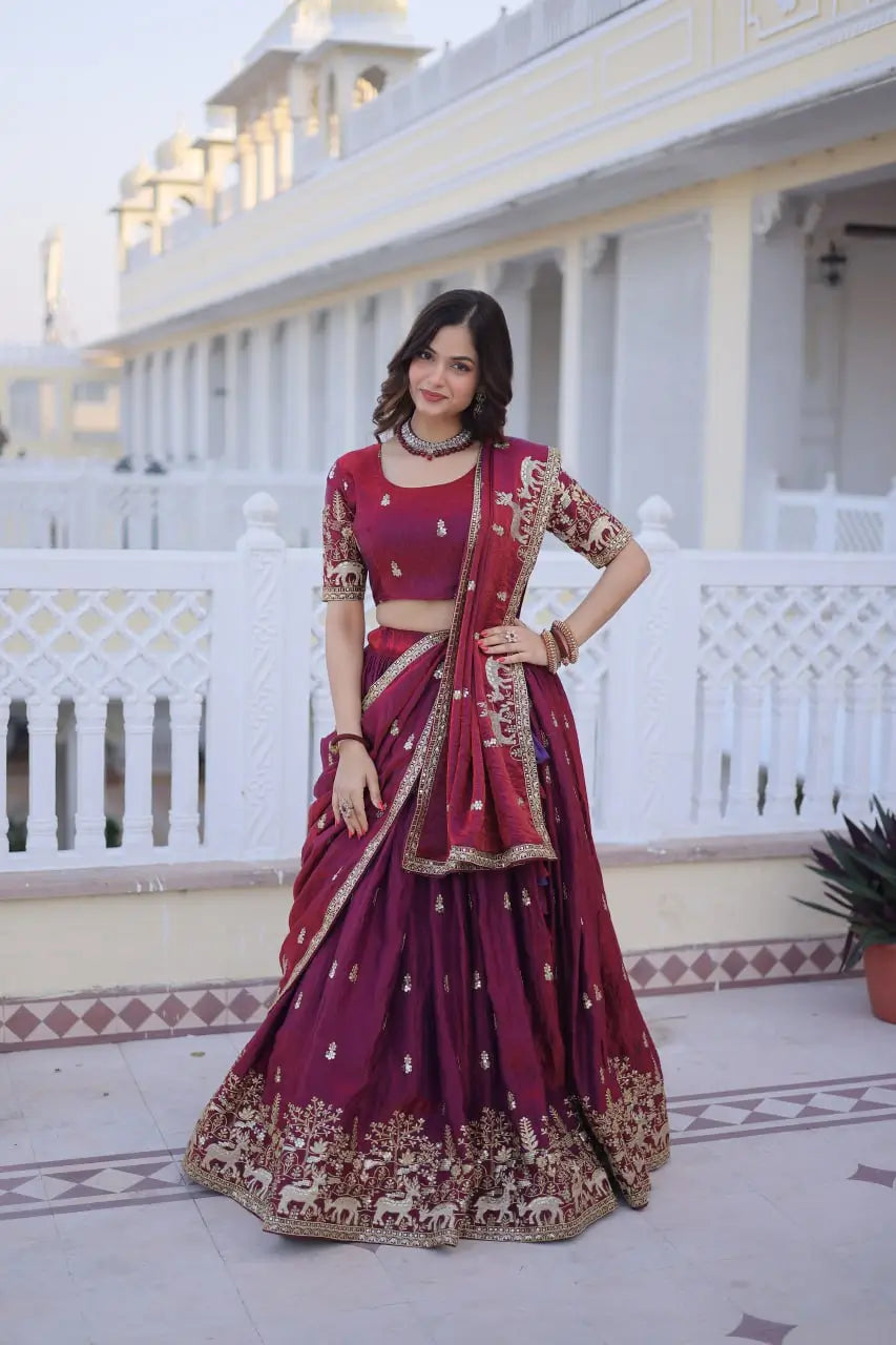 Celebrate every special occasion in regal style with this stunning maroon Fendi Silk lehenga choli set. Designed with heavy sequins and zari thread embroidery, this ensemble reflects rich craftsmanship and timeless elegance. The deep maroon shade combined with intricate detailing makes it a perfect choice for grand celebrations.
