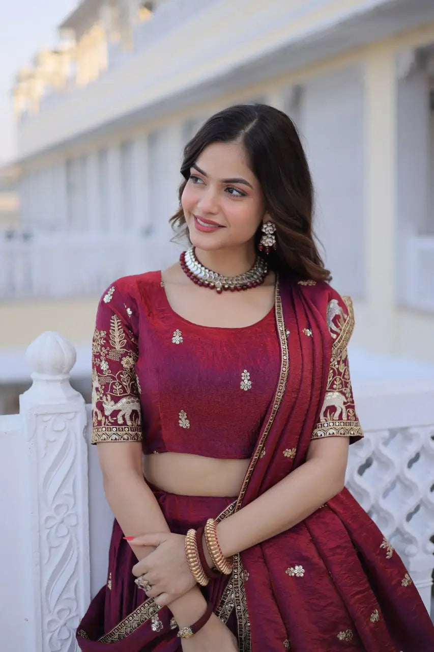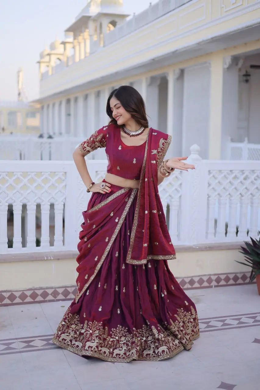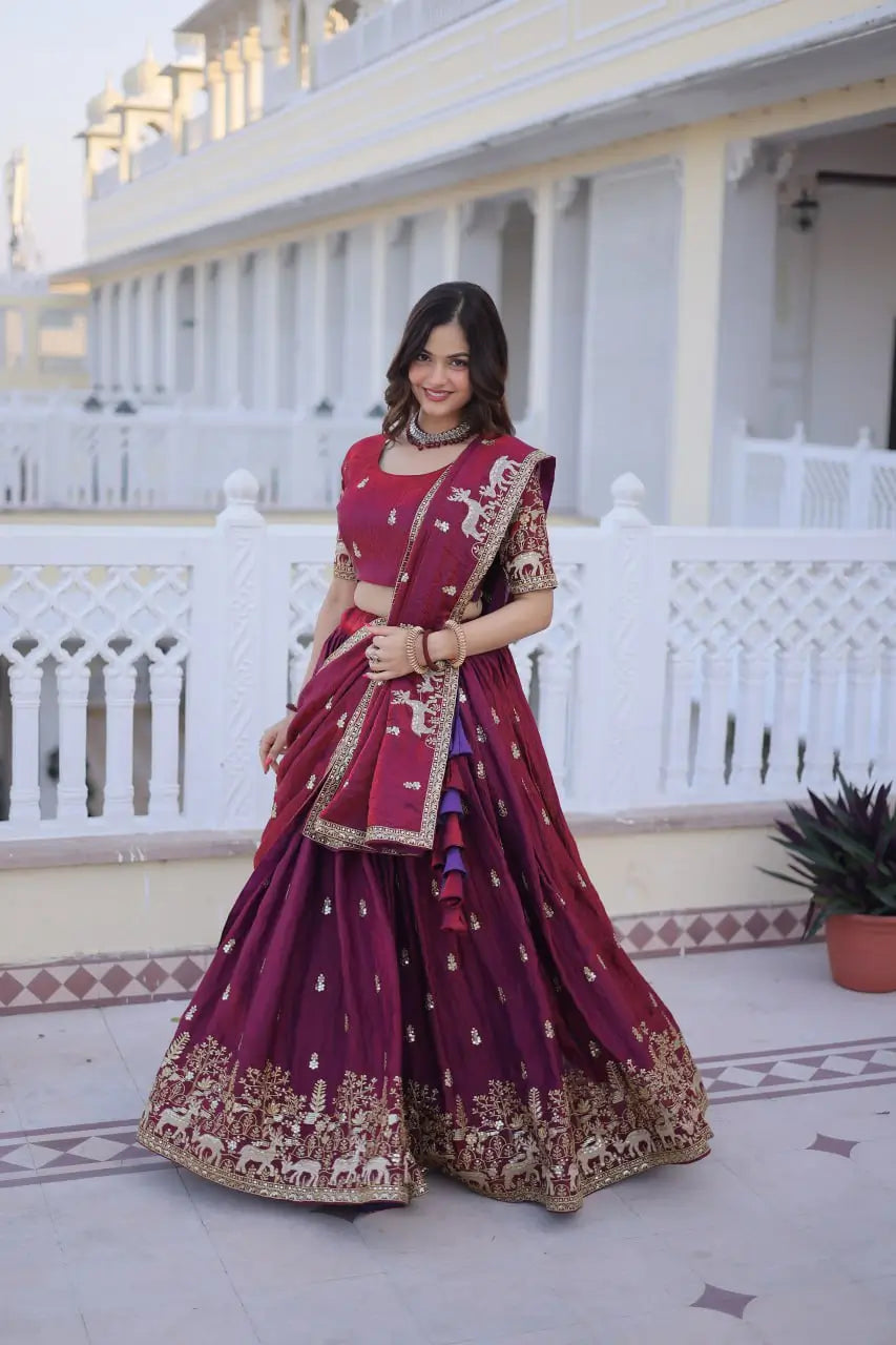 Celebrate every special occasion in regal style with this stunning maroon Fendi Silk lehenga choli set. Designed with heavy sequins and zari thread embroidery, this ensemble reflects rich craftsmanship and timeless elegance. The deep maroon shade combined with intricate detailing makes it a perfect choice for grand celebrations.