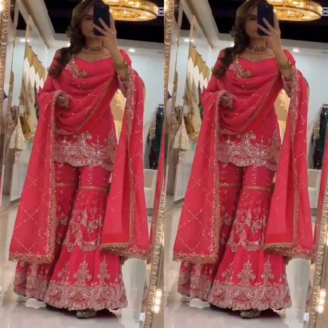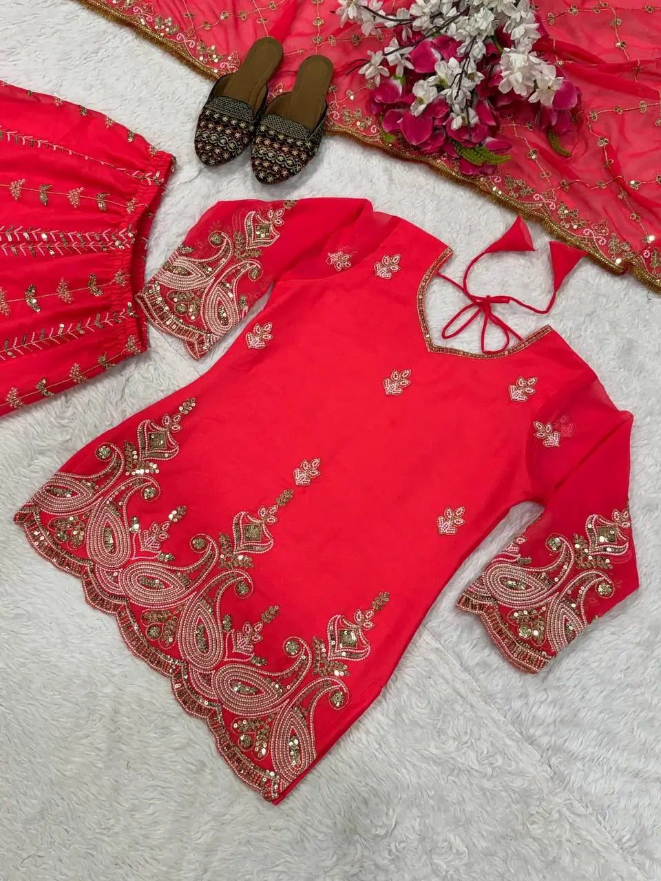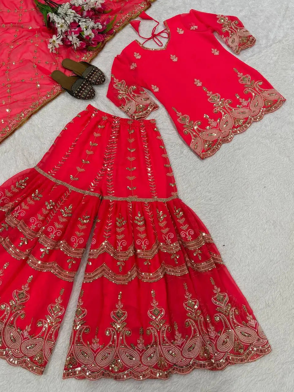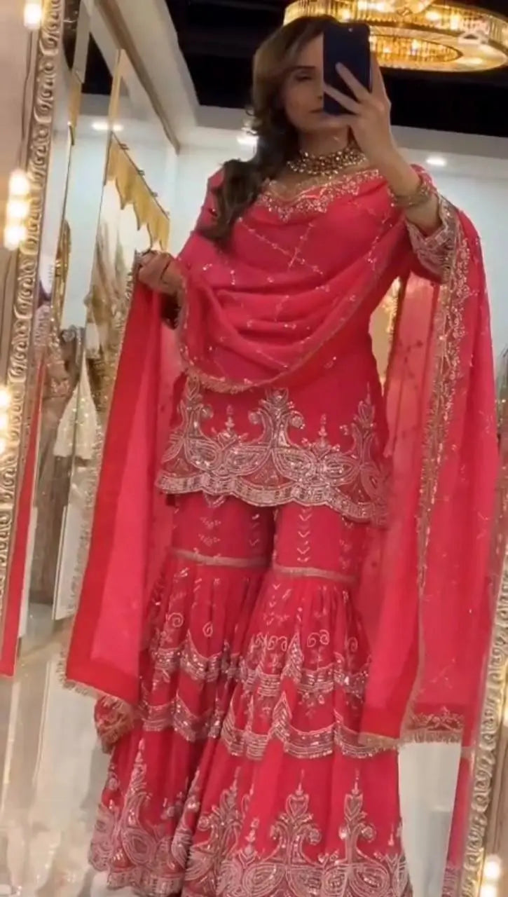 Completing the set is a heavy fox georgette dupatta adorned with matching sequence and embroidery work, measuring 2.30 meters for an elegant drape. Weighing approximately 950 grams, this outfit balances richness with manageable comfort. Ideal for wedding functions, sangeet nights, festive celebrations, and traditional events, this sharara set is designed to make you stand out effortlessly.