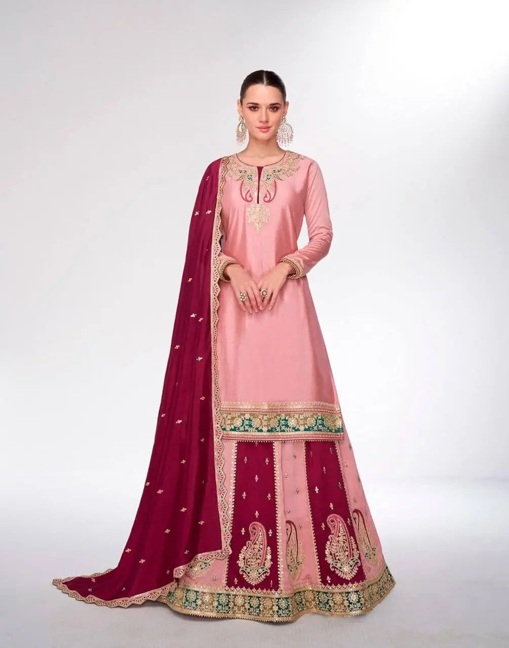 This elegant sharara set is crafted from pure heavy chinnon silk, beautifully enhanced with intricate embroidery and sequin work for a regal finish. The top features full sleeves with detailed embroidery, paired with a soft heavy micro cotton lining for comfort. With a length of 36–37 inches, it creates a refined silhouette. The sharara, also made of chinnon silk, comes fully stitched with embroidery and sequin detailing, offering a graceful flow with a length of 40–41 inches. The look is completed with a dupatta in matching chinnon silk, styled with embroidery and a four-side lace border for an exquisite touch. Fully stitched and ready to wear, this outfit is perfect for weddings, festive celebrations, and special occasions.
