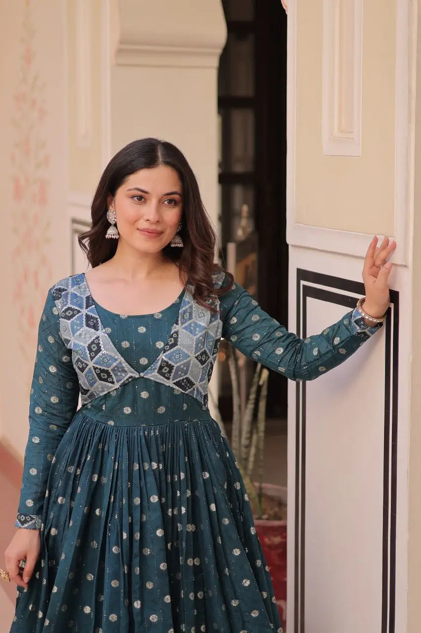 Perfect for weddings, festive functions, sangeet, mehendi, or evening parties, this gown ensures you look effortlessly stylish while staying comfortable. Available in Rama and Wine shades, it’s a must-have for women who love a blend of tradition and modern style.
