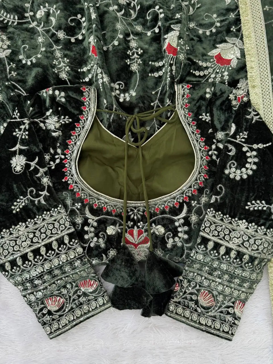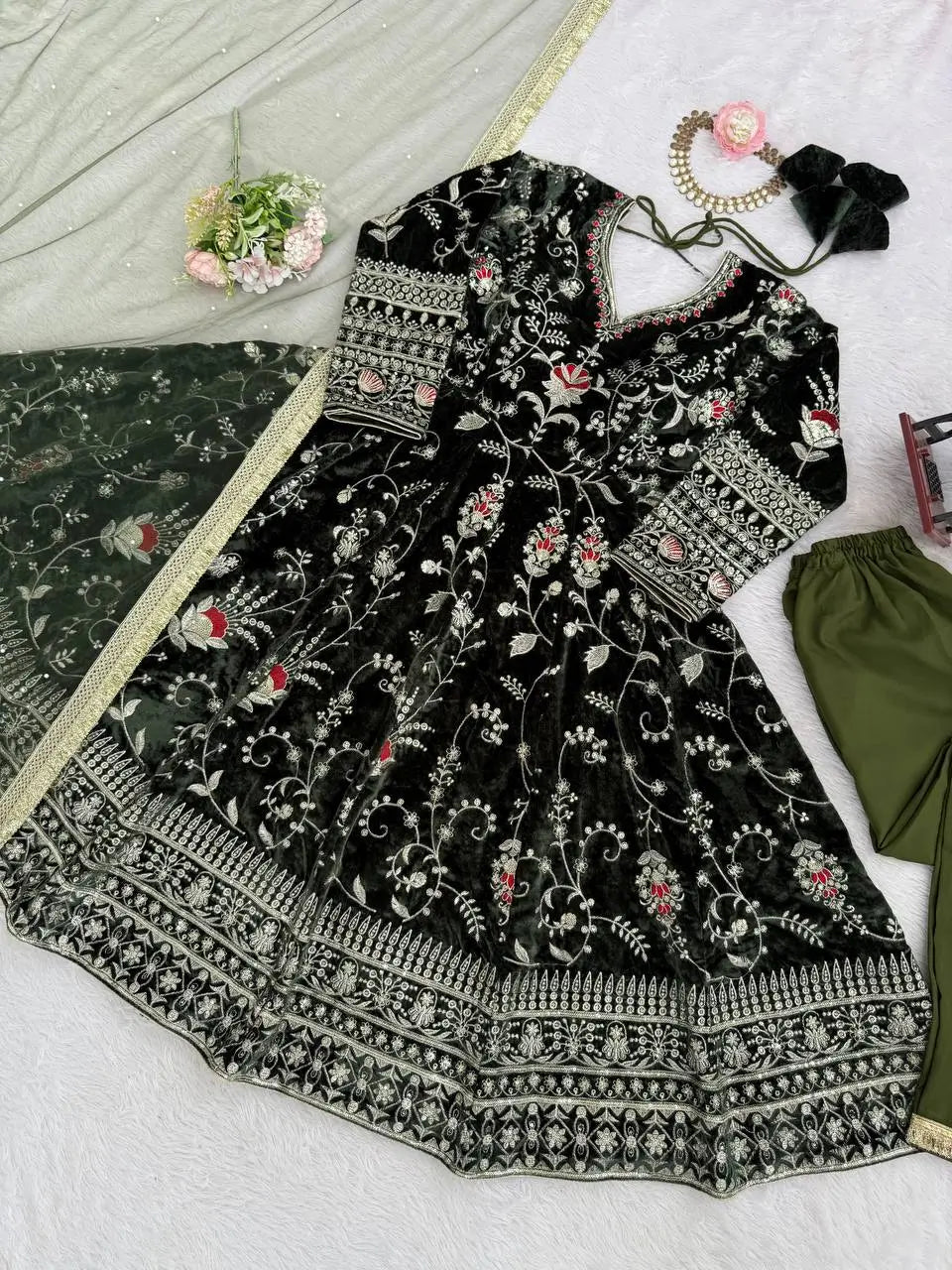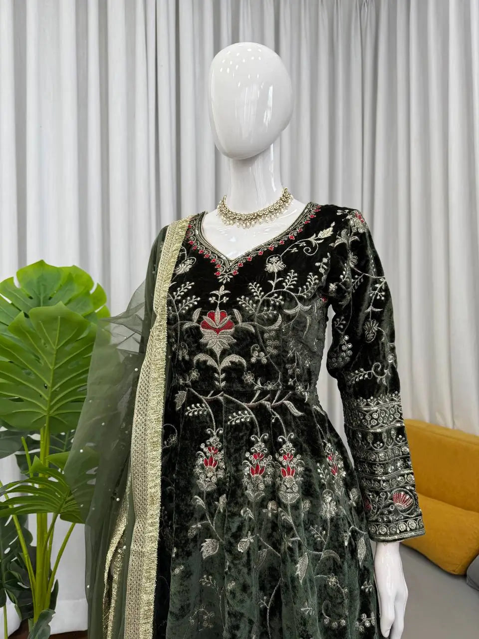 This elegant suit set is crafted from premium viscose velvet, offering a rich texture and luxurious drape perfect for festive and special occasions. The top features detailed thread embroidery combined with sequin accents that enhance its refined design. With a comfortable micro inner and a flattering length of fifty inches, it provides both structure and ease. The matching velvet pants come fully stitched with an elastic waistband for a comfortable fit and coordinated look. Completing the ensemble is a soft butterfly net dupatta adorned with rivet moti work and a four side fancy lace border, adding a delicate and graceful finishing touch. This set blends comfort, craftsmanship, and festive elegance, making it ideal for celebrations and evening events.
