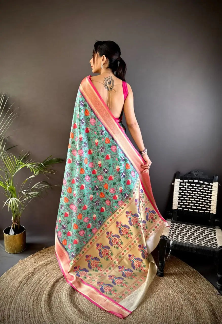 This Banarasi Paithani lichi silk saree is designed to blend traditional richness with modern artistry. Crafted from pure lichi silk, the saree features beautiful floral digital prints that add freshness and visual elegance. The fabric is enhanced with gold zari jacquard weaving, giving the saree a luxurious and festive appeal. The highlight of the saree is its intricately designed peacock pallu, inspired by classic Paithani craftsmanship. Soft, smooth, and comfortable to drape, this saree is perfect for festive occasions, cultural celebrations, and special gatherings. It comes with a tone to tone blouse featuring floral print jacquard weaving, completing the look with refined coordination.