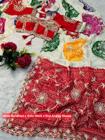 This elegant saree set showcases the timeless beauty of traditional craftsmanship blended with festive charm. Crafted from soft moss georgette, the saree features an attractive Bandhani print enhanced with beautiful full jaal gota work spread gracefully across the drape. The lightweight fabric offers an effortless fall while maintaining a rich and festive appearance. Paired with a soft georgette blouse adorned with hand charkhi gotta patti work, the ensemble reflects refined detailing and artisanal finish. The fully stitched blouse ensures convenience and comfort, making this saree set an ideal choice for festive gatherings, cultural celebrations, and special occasions.