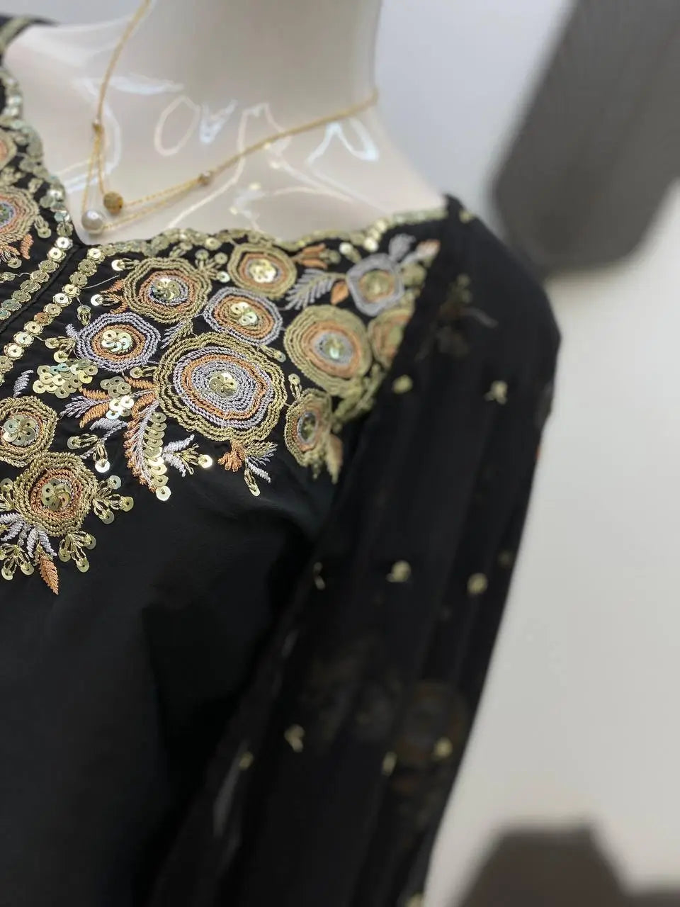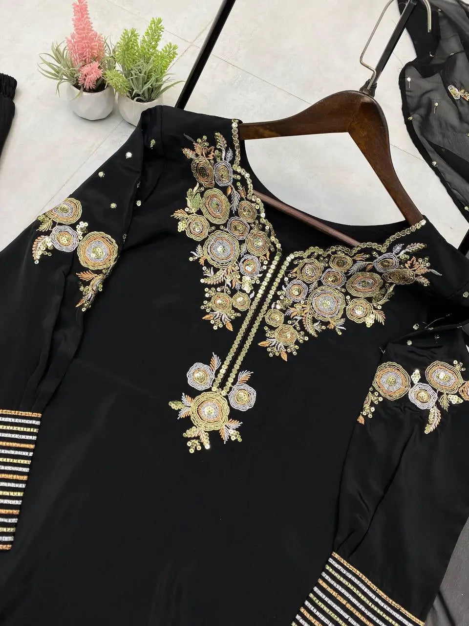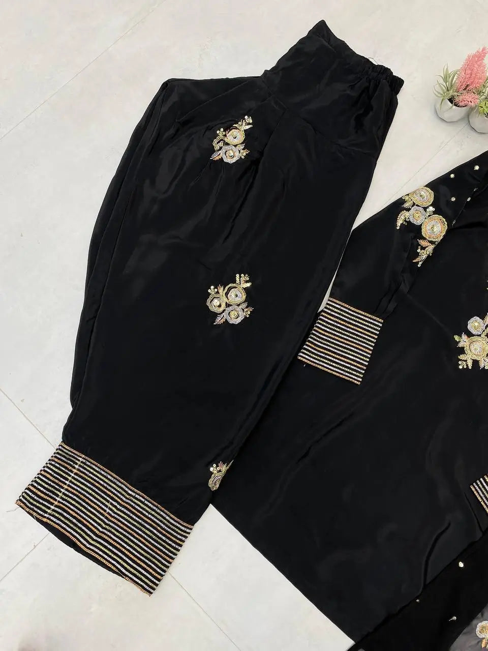 Make a bold and elegant statement with this Black Crape Silk Embroidered Suit Set, designed for festive evenings and special occasions. The suit features luxurious crape silk fabric highlighted with rich sequence embroidery work that adds a touch of glamour. Paired with a fully stitched embroidered crape silk palazzo and a lightweight georgette dupatta with sequence embroidery, this ensemble offers both comfort and sophistication.