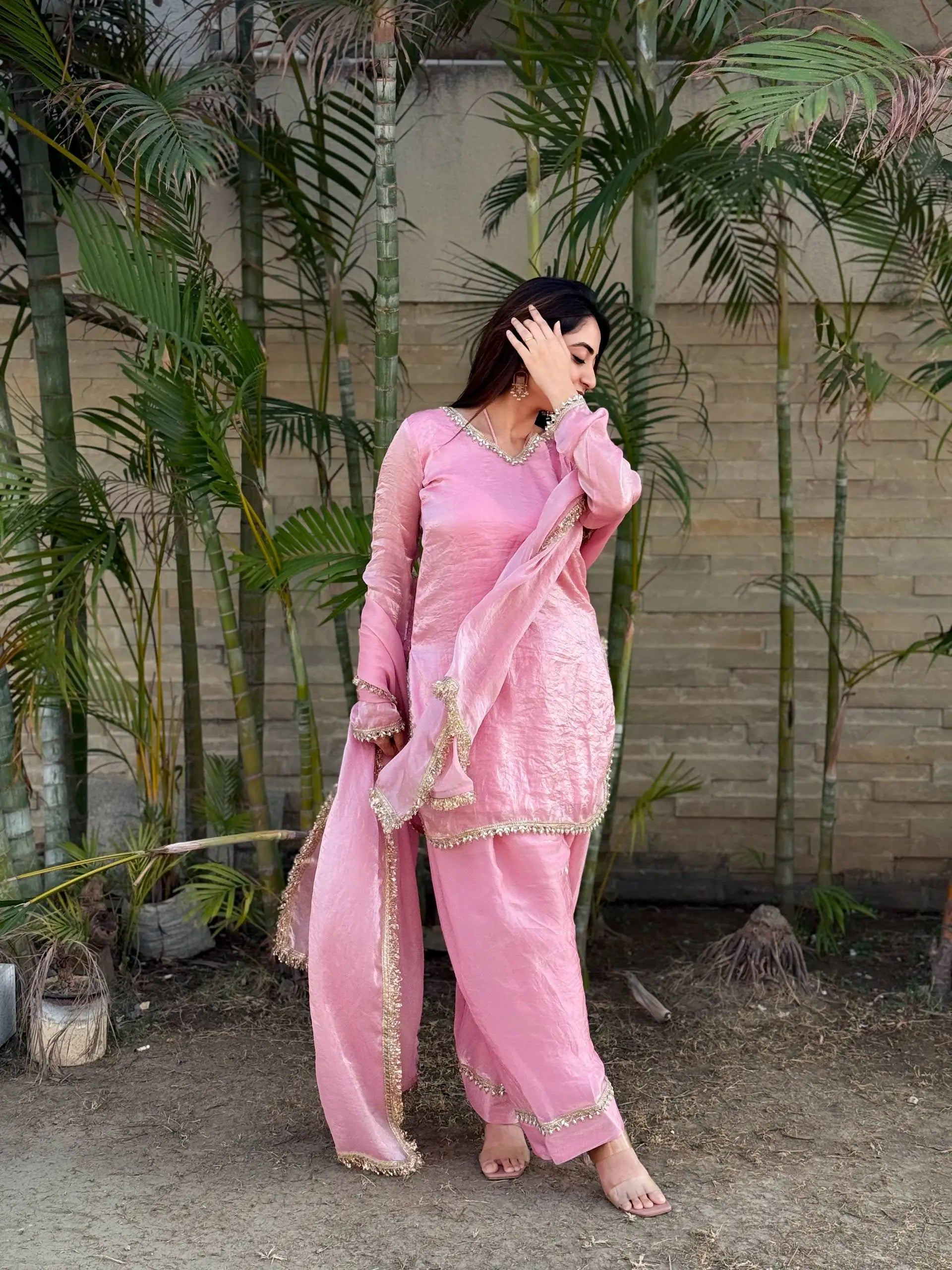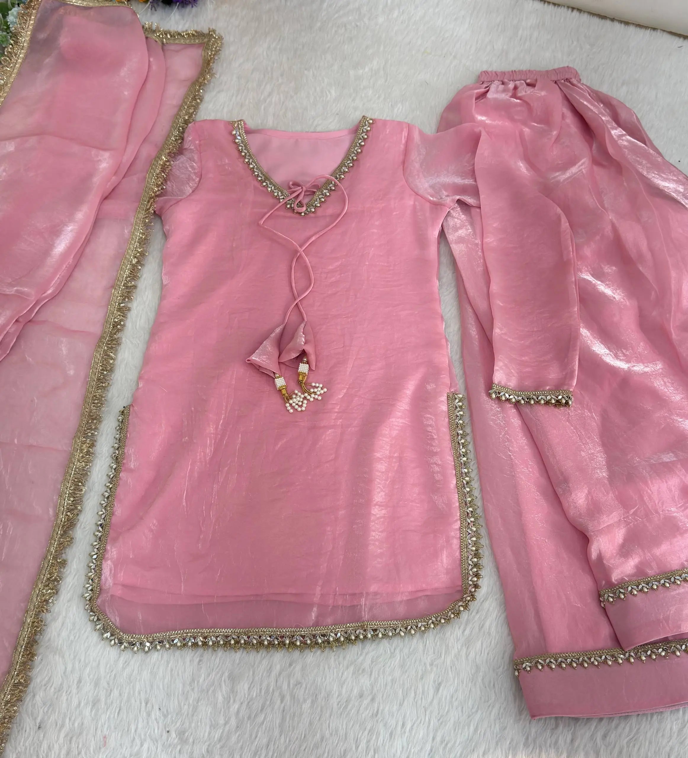 Add a touch of refined elegance to your festive wardrobe with this beautifully designed Blush Pink Kurta Salwar Set. Crafted from luxurious Fendi satin silk fabric, this ensemble offers a rich sheen and smooth finish that instantly elevates your traditional look.