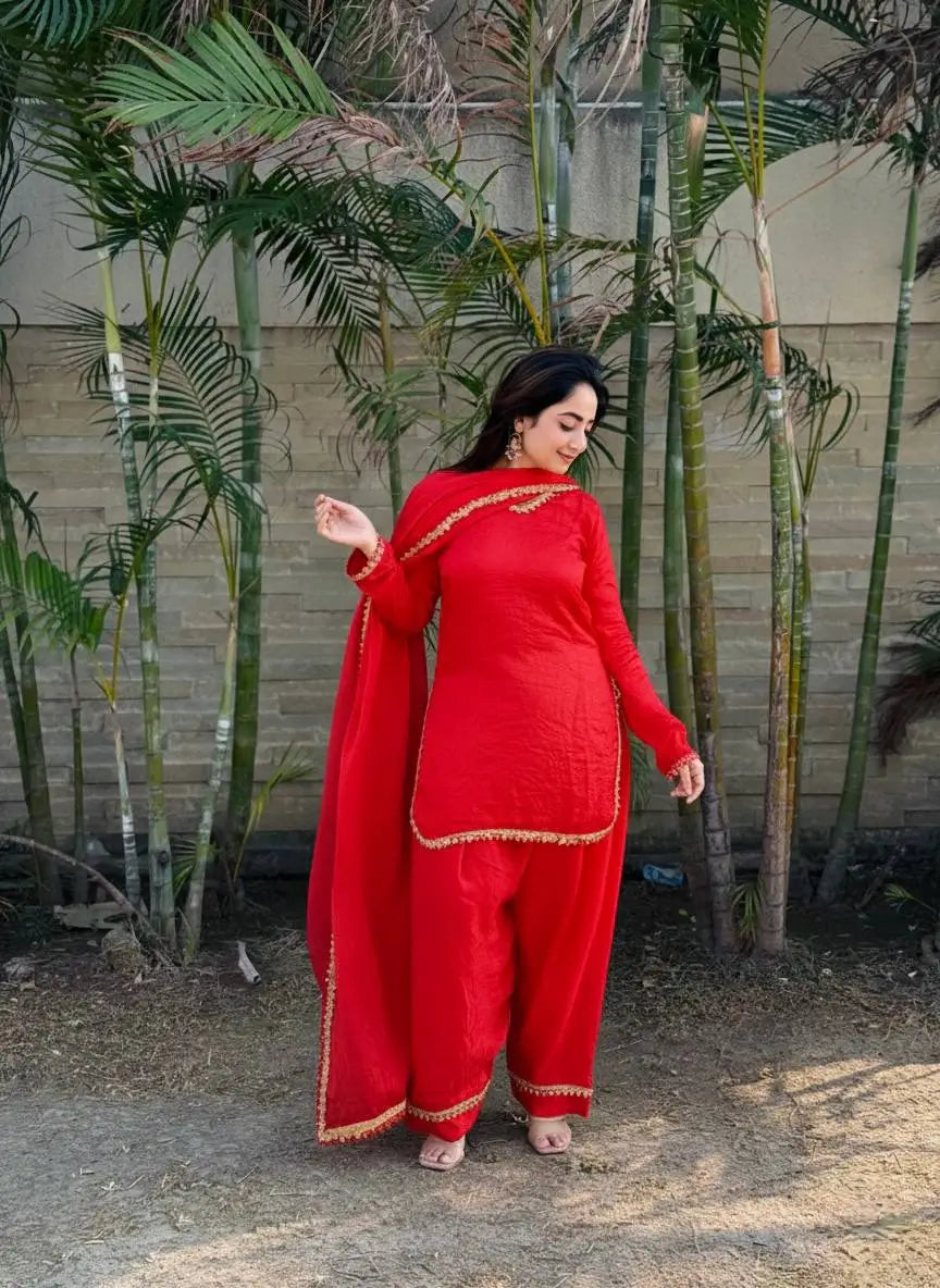 The matching salwar is tailored in Fendi satin with a comfortable soft micro cotton lining for ease and structure. A four inch daman Farsi patta border enhances the overall silhouette, giving it a polished and traditional finish. Completing the look is a coordinated Fendi satin dupatta adorned with sequence and zari fancy lace work on all four sides. With a generous 2.10 meter length, the dupatta drapes beautifully and adds festive richness to the outfit.