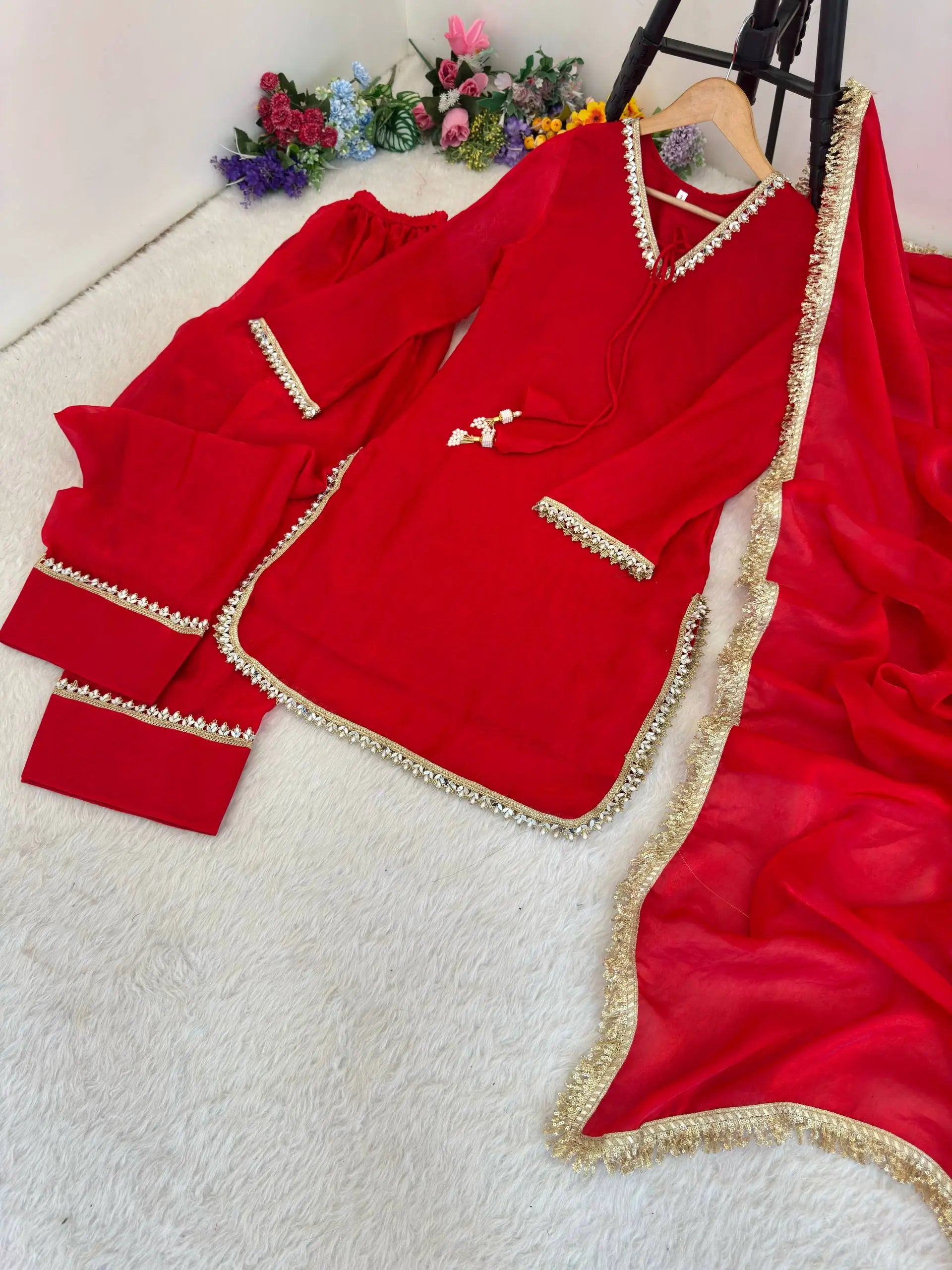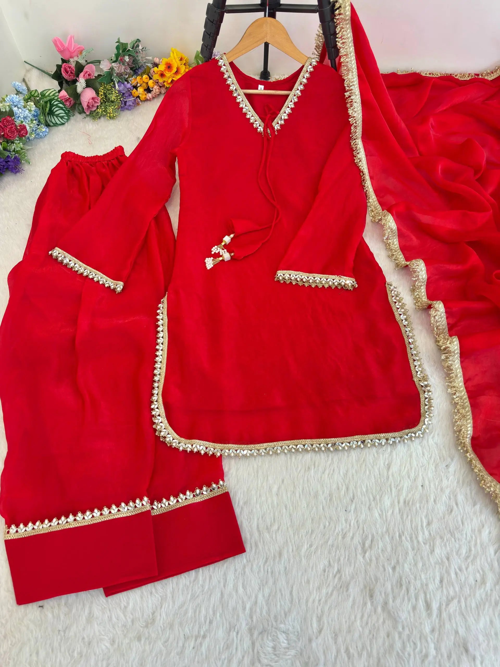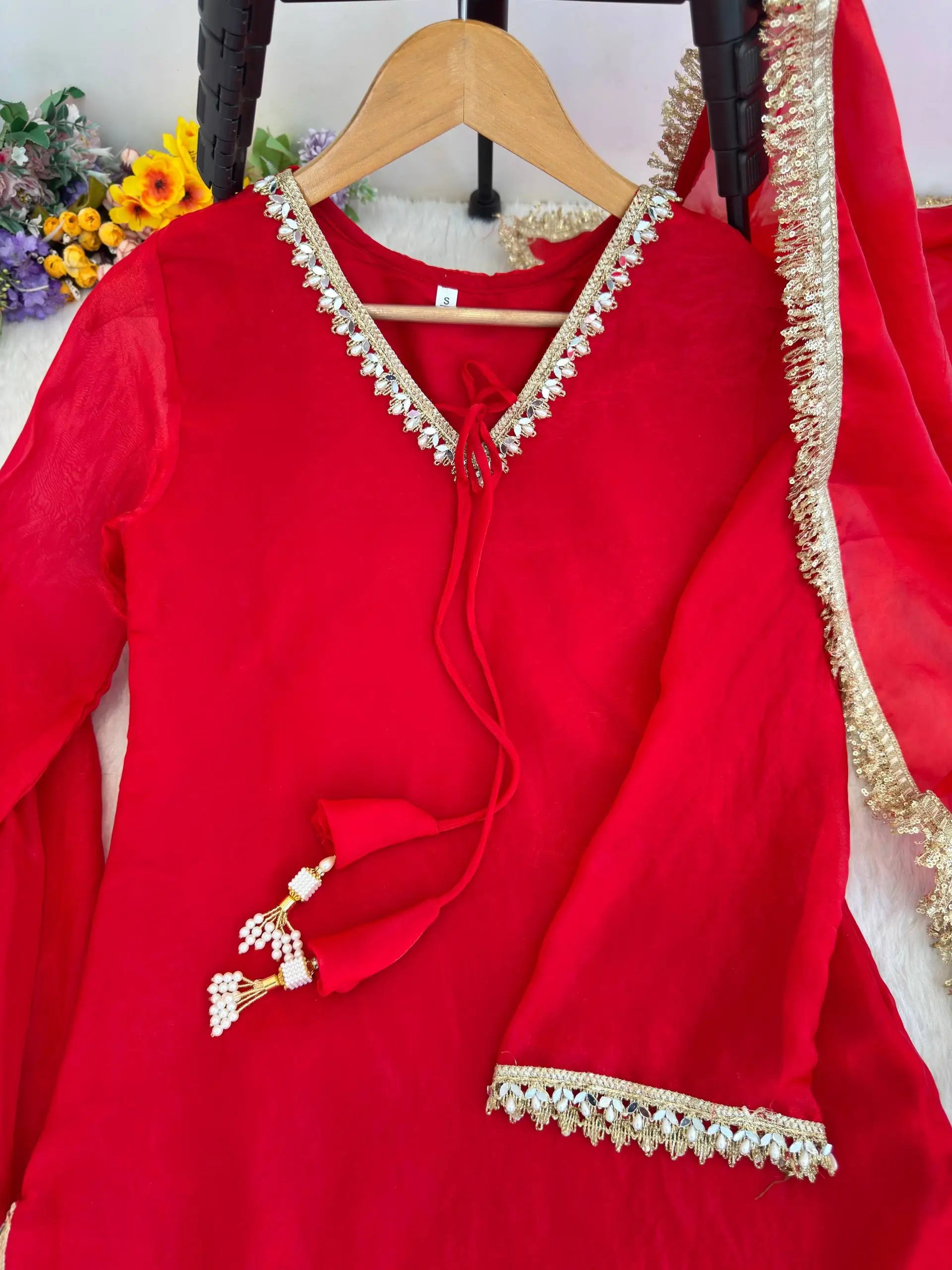 • Handcrafted real mirror work with moti lace detailing