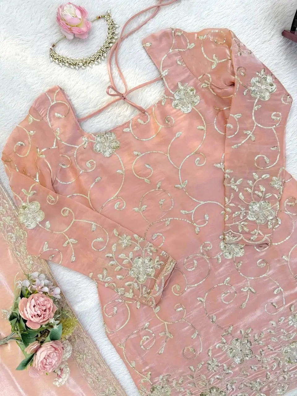 The champagne peach shade is soft, pastel, and extremely elegant. It works beautifully for daytime weddings and looks luxurious under warm evening lighting. This tone flatters Indian skin tones and pairs perfectly with silver, pearl, or diamond-style jewellery. The subtle shimmer from the sequins adds depth without overpowering the outfit.
