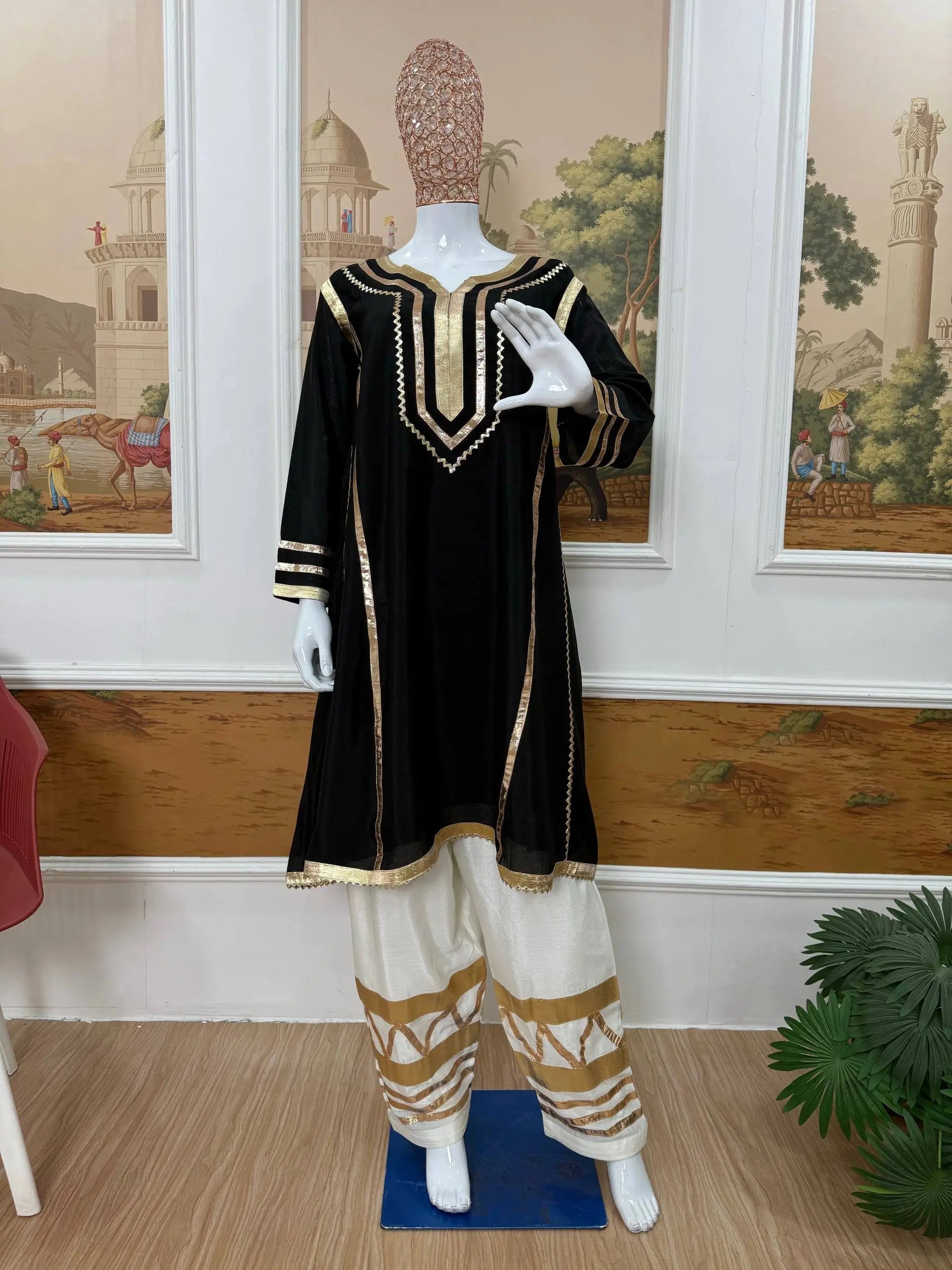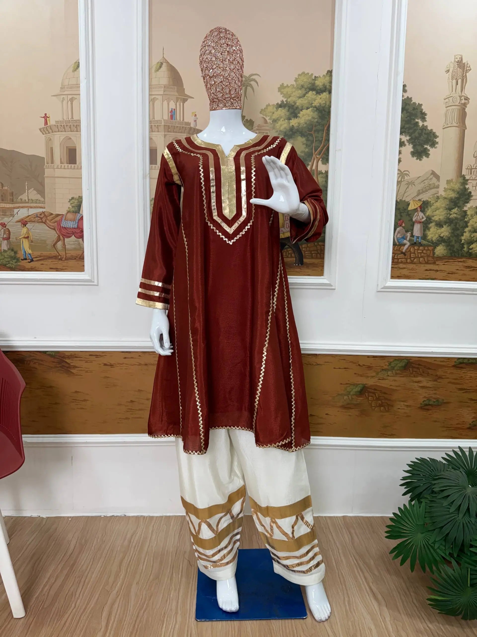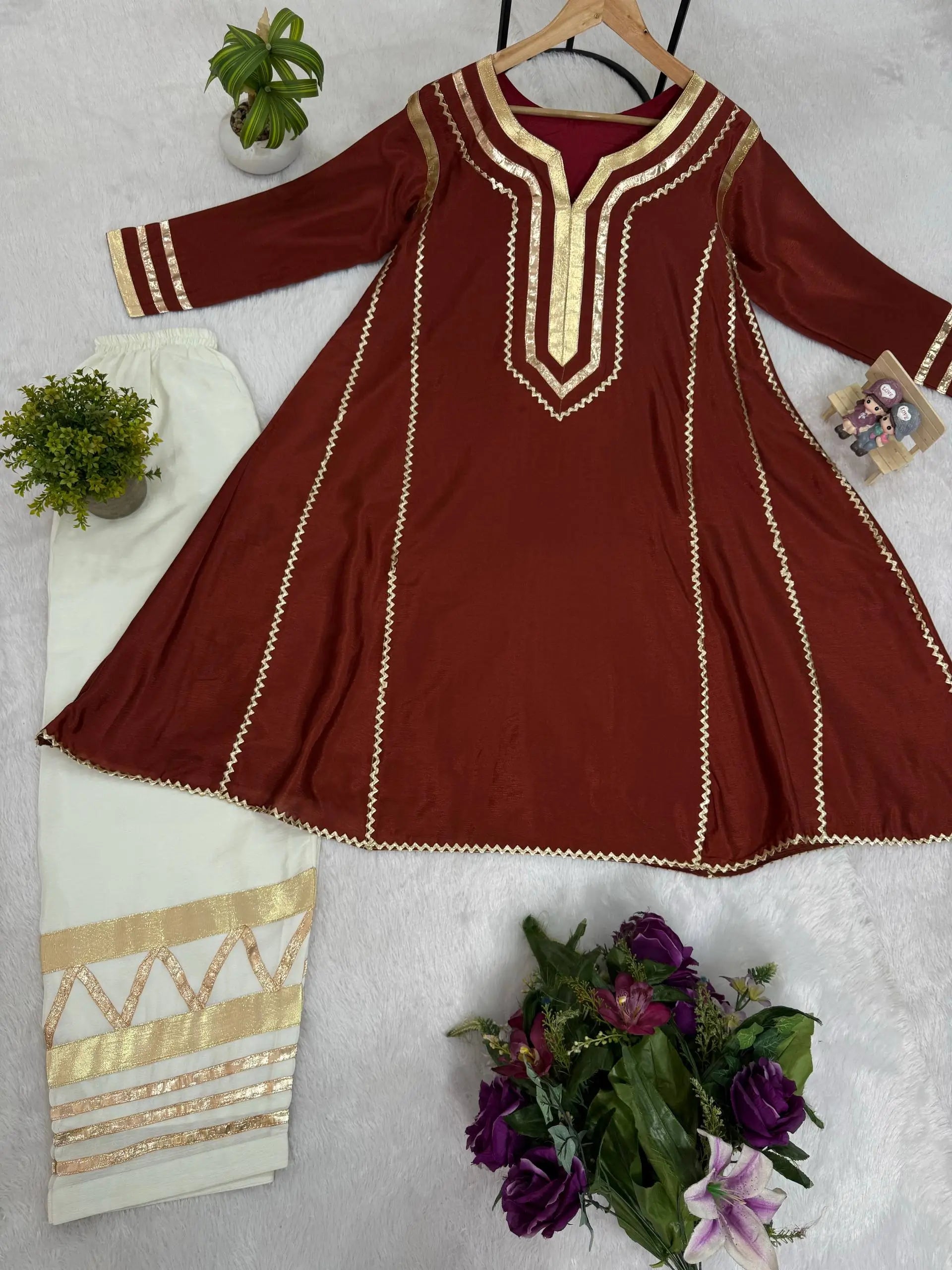 The matching bottom is made from premium Chinon fabric and enhanced with coordinated gota patti pattern work, creating a cohesive and sophisticated look. With a length of 40 inches and a free size fit up to XXL, the palazzo ensures ease of movement and comfort for extended wear. Ideal for festive gatherings, pooja functions, family celebrations and traditional events, this premium quality set is ready to ship and perfect for effortless styling.
