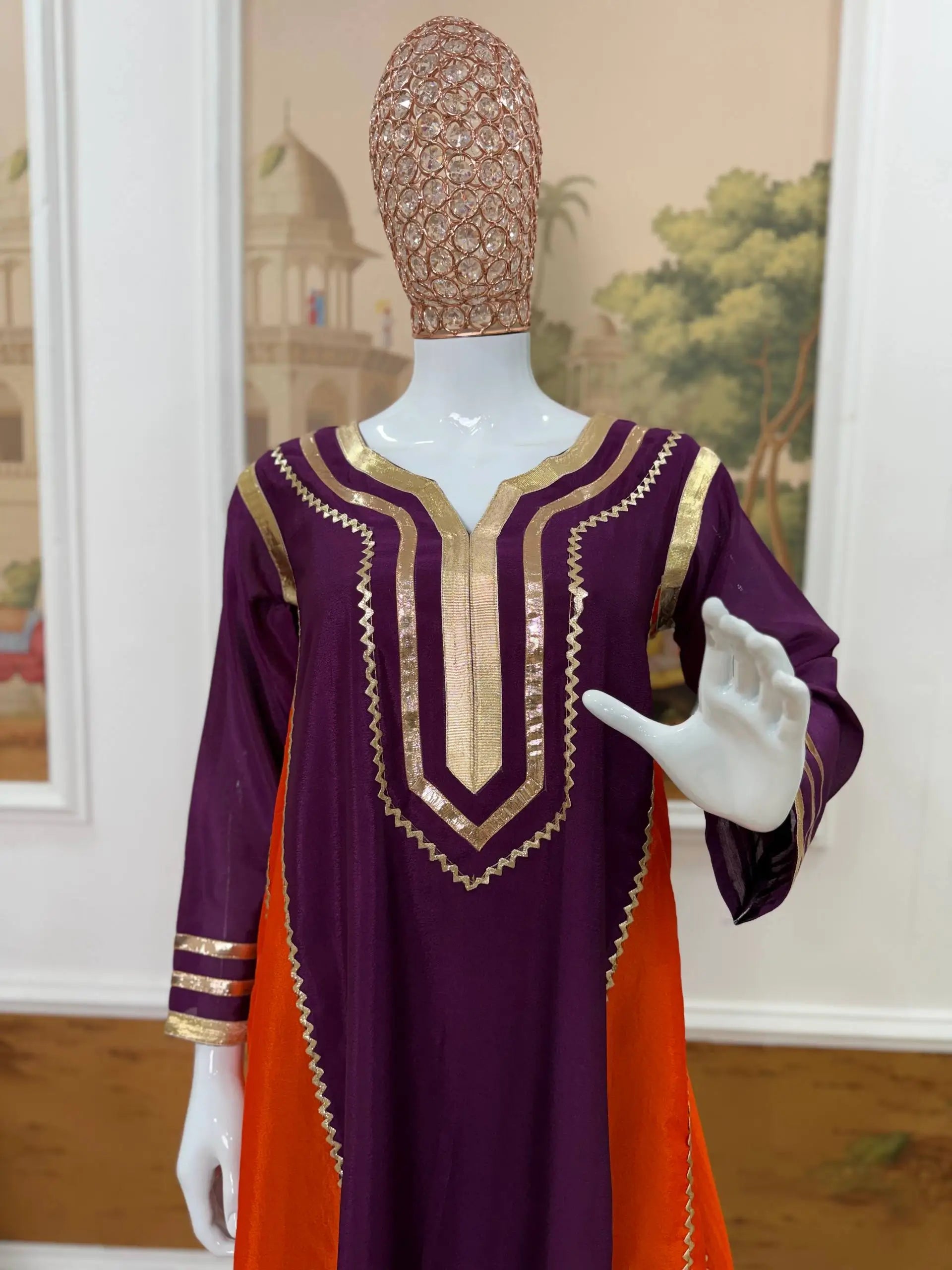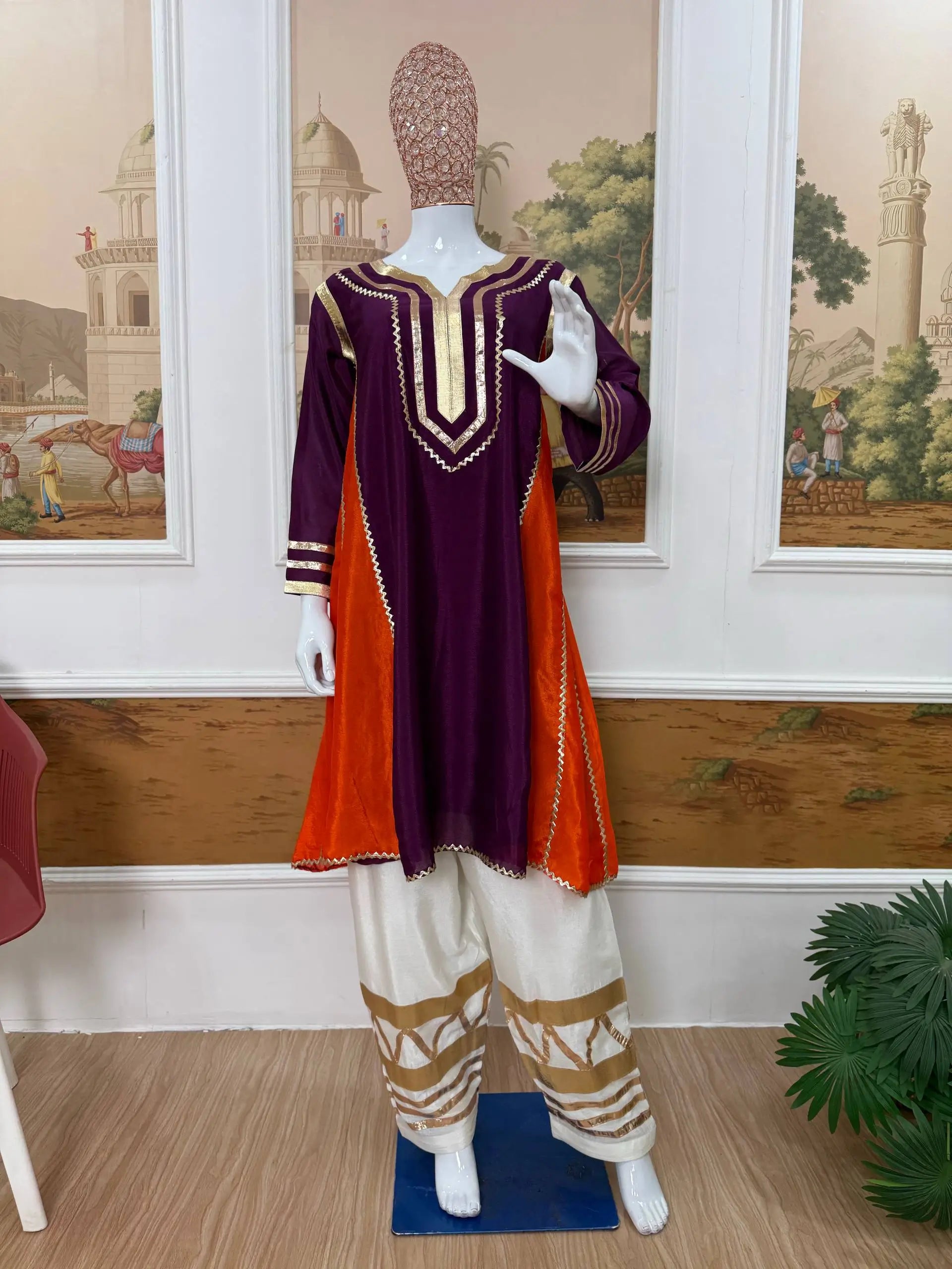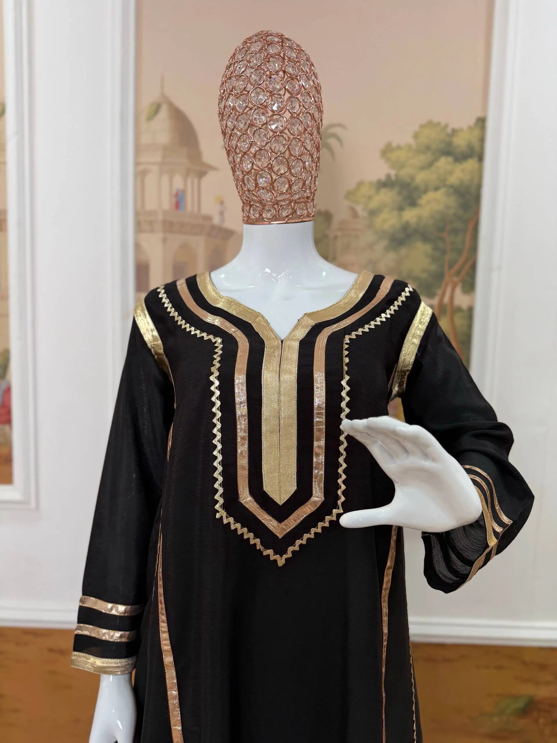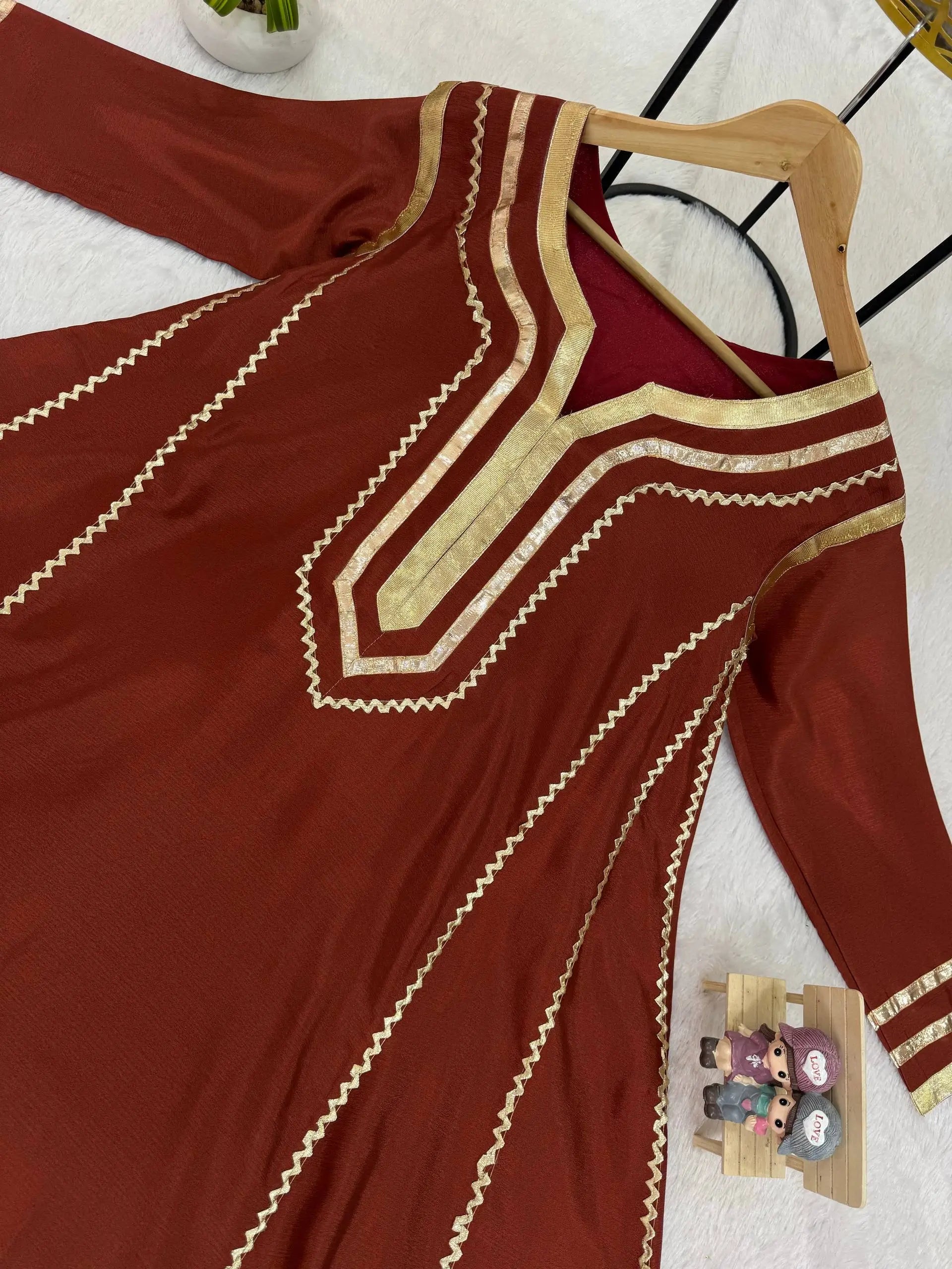 The matching bottom is made from premium Chinon fabric and enhanced with coordinated gota patti pattern work, creating a cohesive and sophisticated look. With a length of 40 inches and a free size fit up to XXL, the palazzo ensures ease of movement and comfort for extended wear. Ideal for festive gatherings, pooja functions, family celebrations and traditional events, this premium quality set is ready to ship and perfect for effortless styling.