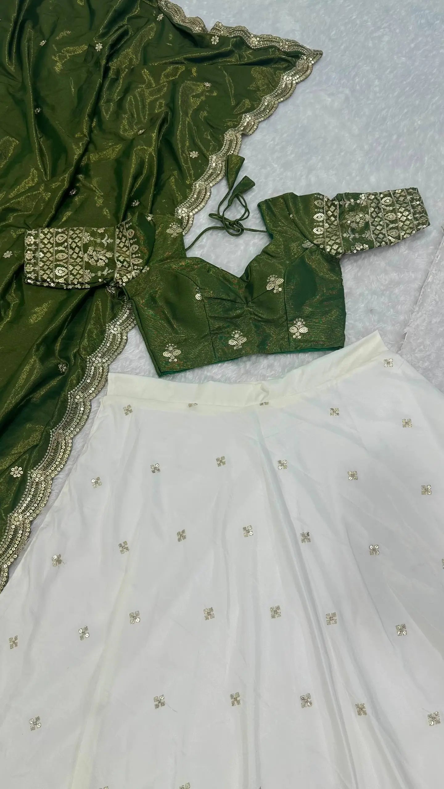 1. This elegant lehenga choli set is crafted to bring together traditional charm and modern festive appeal. The lehenga is made from pure crepe silk and enhanced with delicate sequins and zari work that add subtle shimmer while maintaining a graceful, flowy silhouette. With a generous five meter flair, the lehenga offers a luxurious drape that looks stunning in movement and photographs beautifully.
