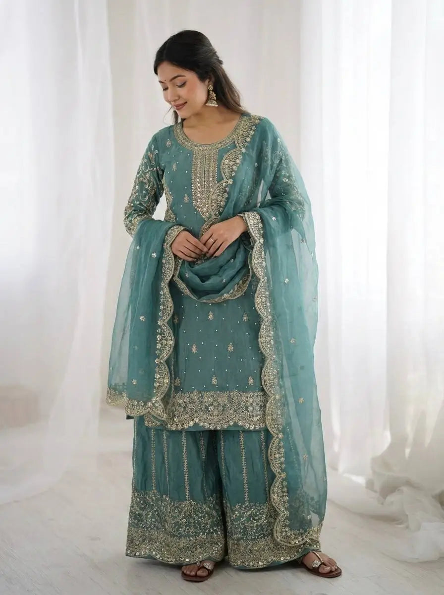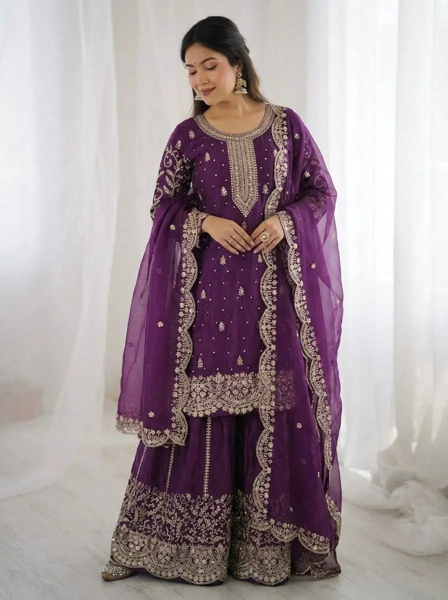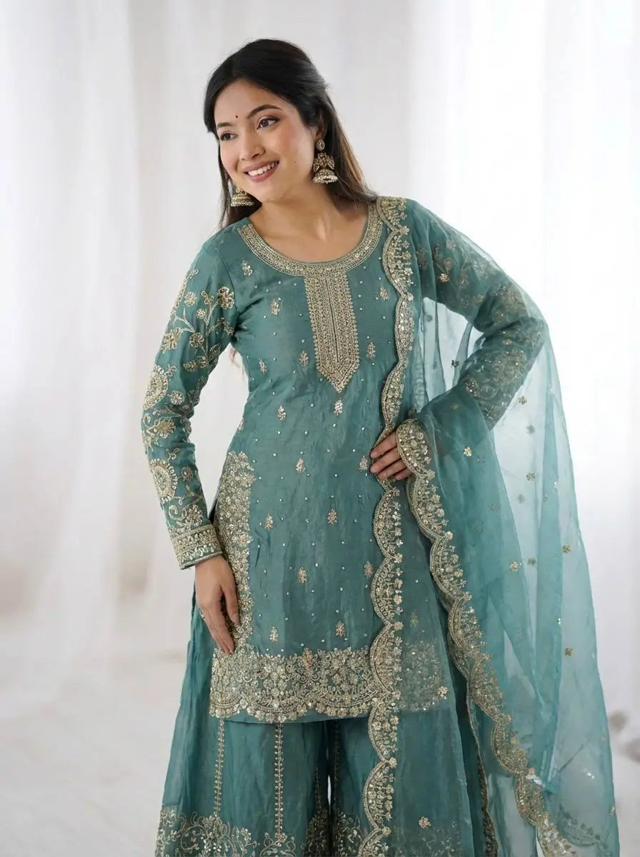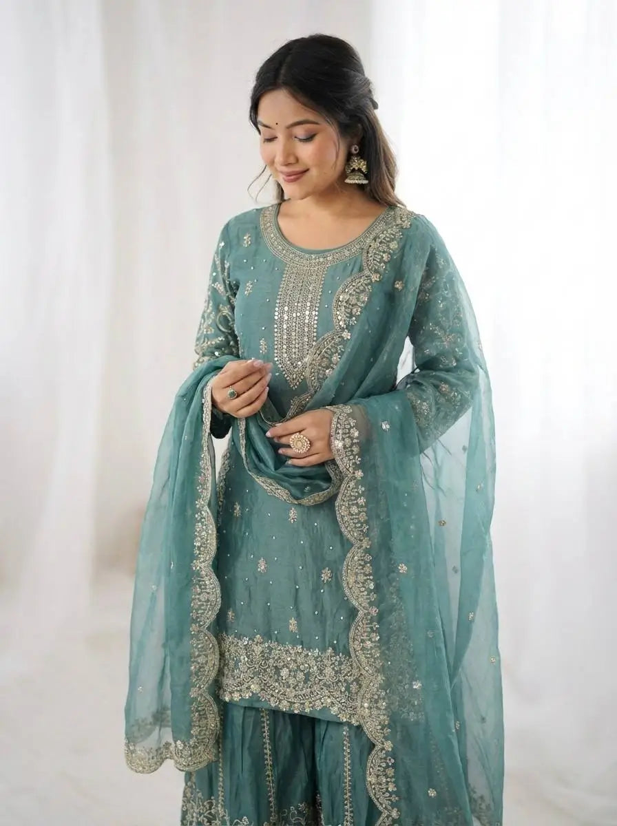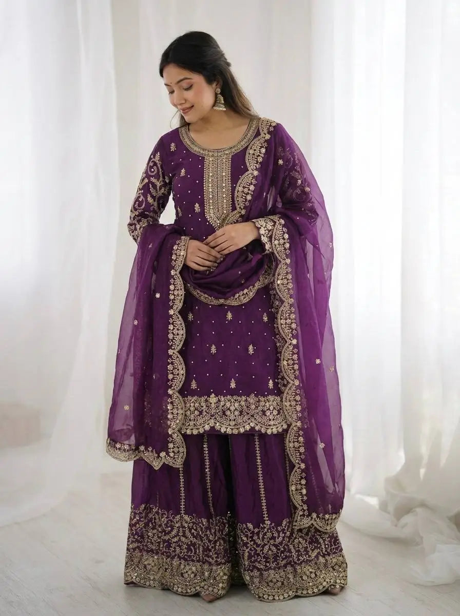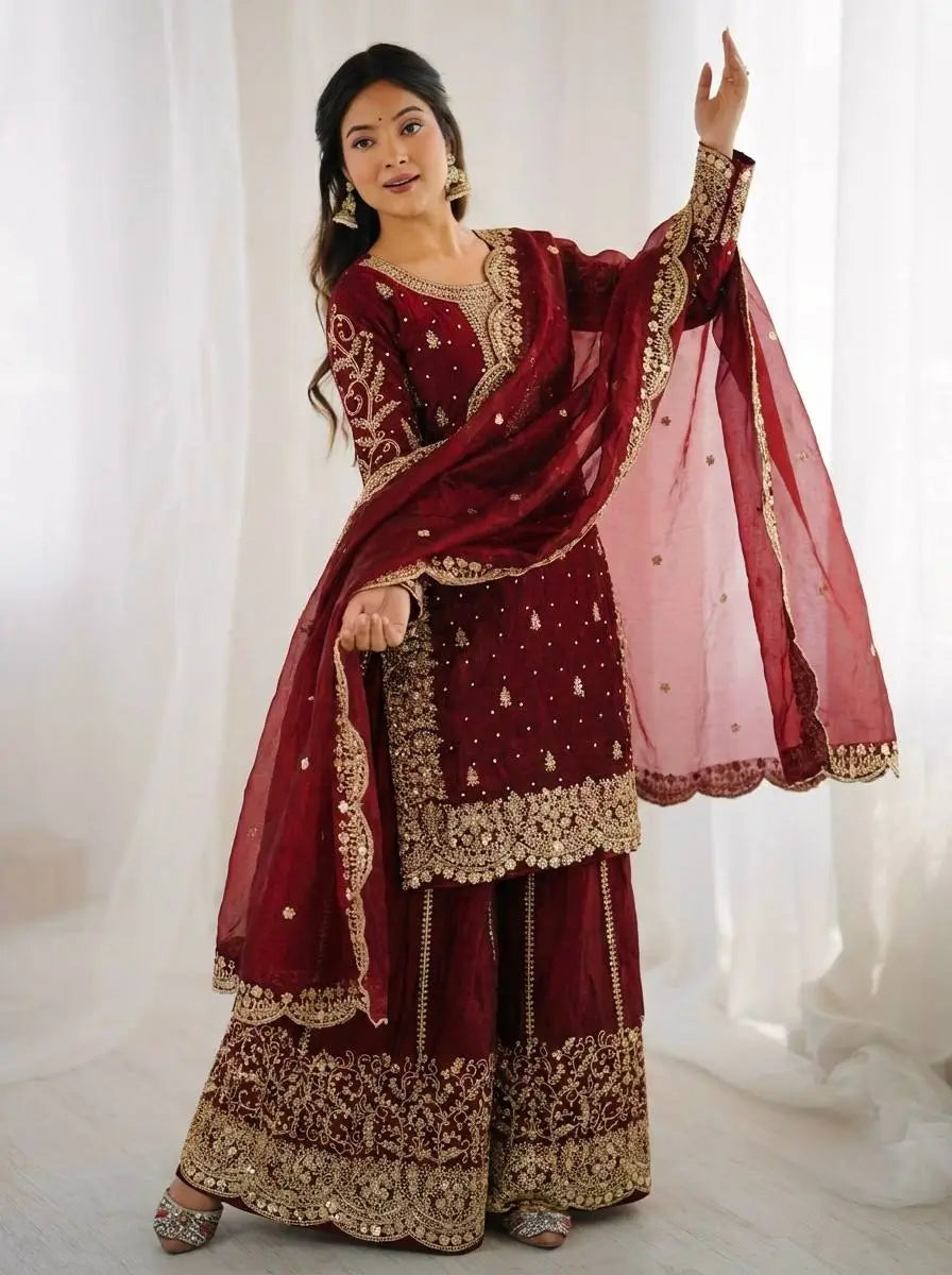 This premium sharara set is crafted from heavy chinon silk, beautifully embellished with embroidery, sequence detailing, and elegant lace work for a refined traditional look. The top comes with full sleeves, a length of 37–38 inches, and a soft heavy micro cotton lining for all-day comfort. The sharara is made from chinon silk with matching embroidery and sequence work, fully stitched with a micro cotton lining for ease of wear. The outfit is completed with a dupatta in chinon silk, finished with a delicate lace border, adding grace to the ensemble. Fully stitched and ready to wear, this sharara set is perfect for weddings, festive occasions, and party wear.