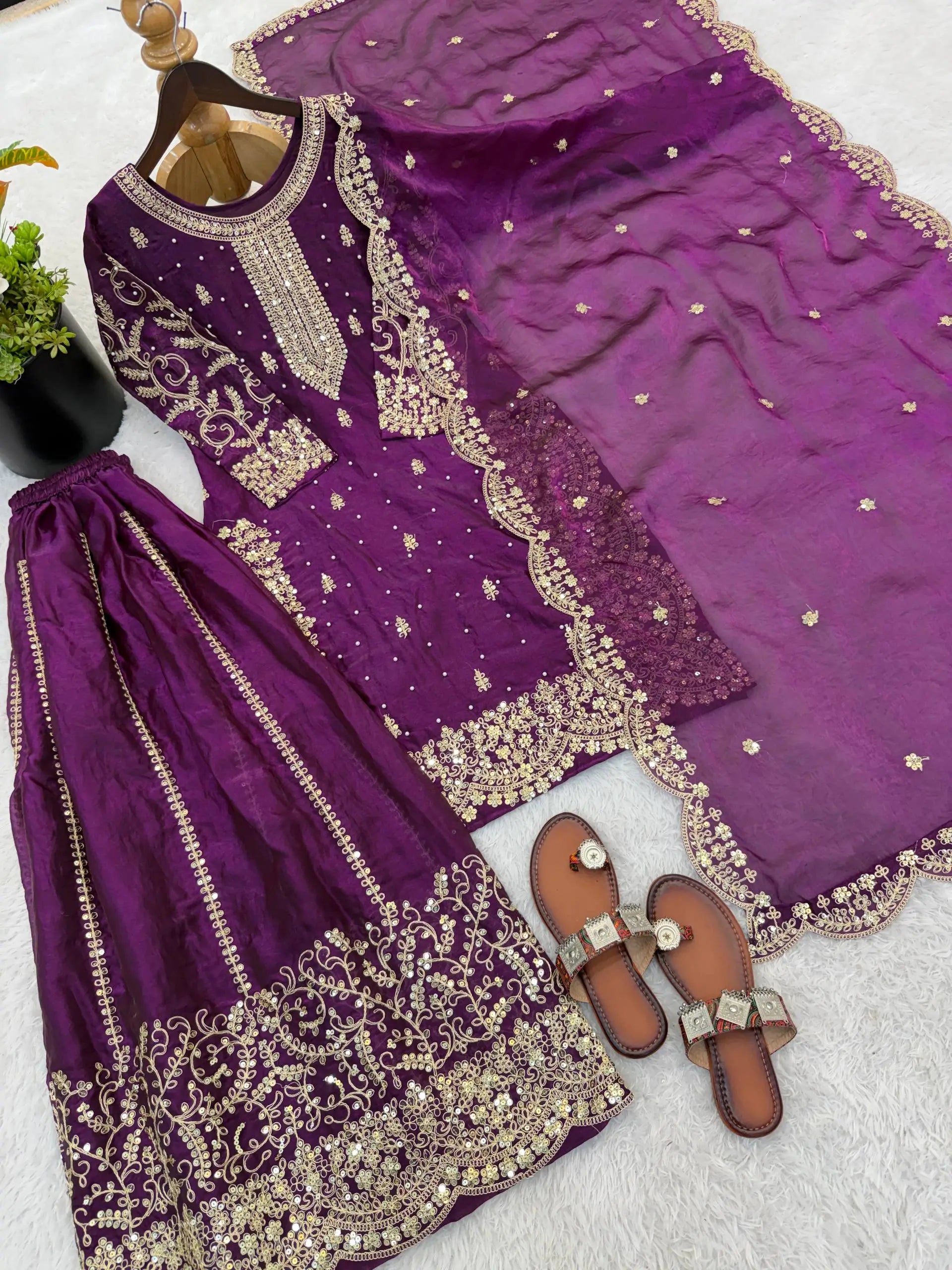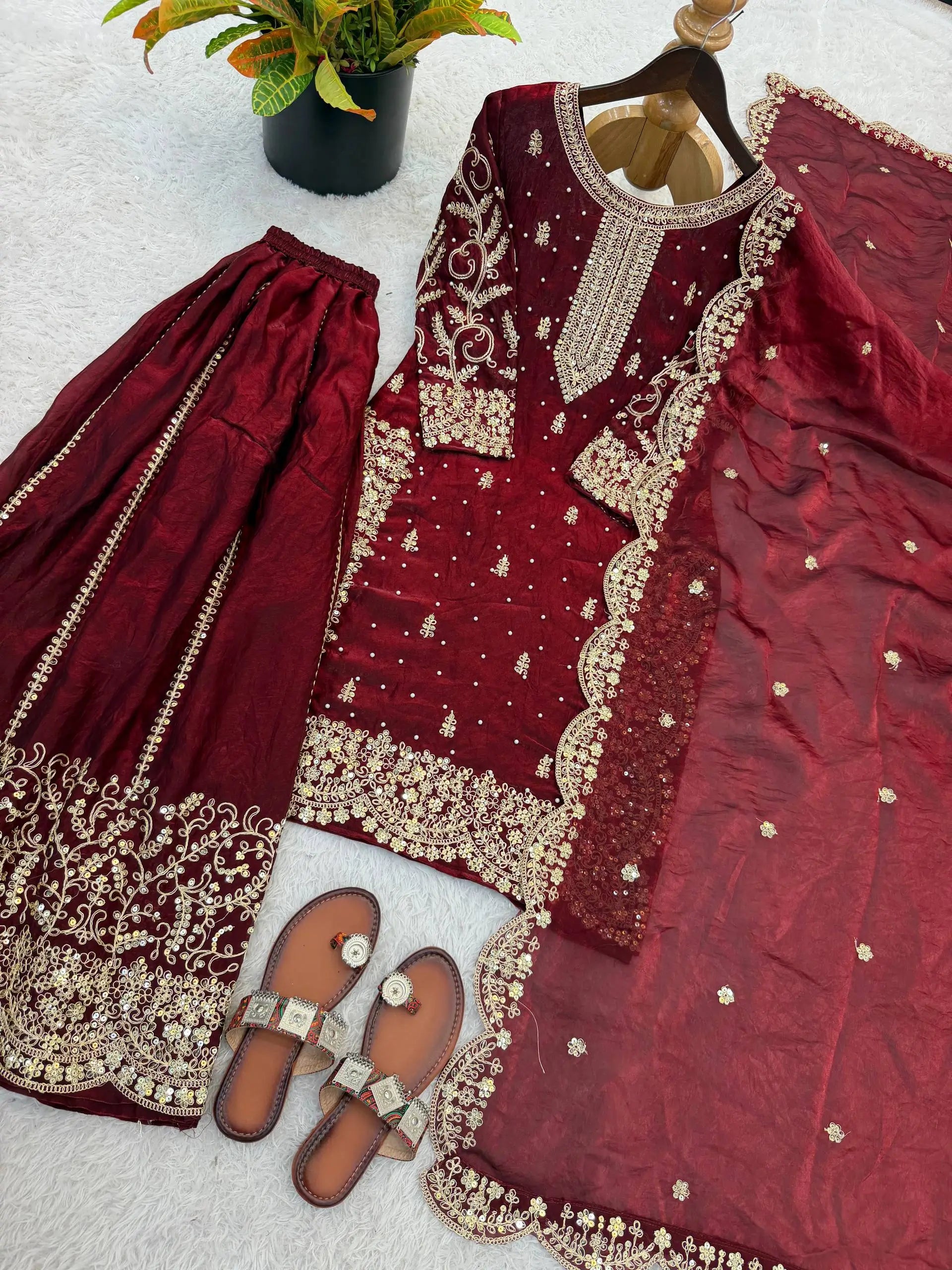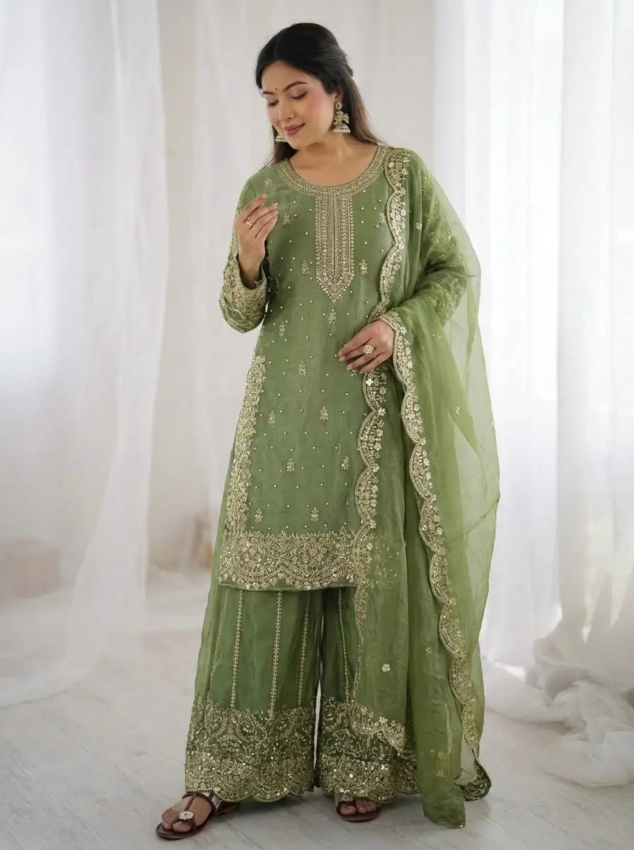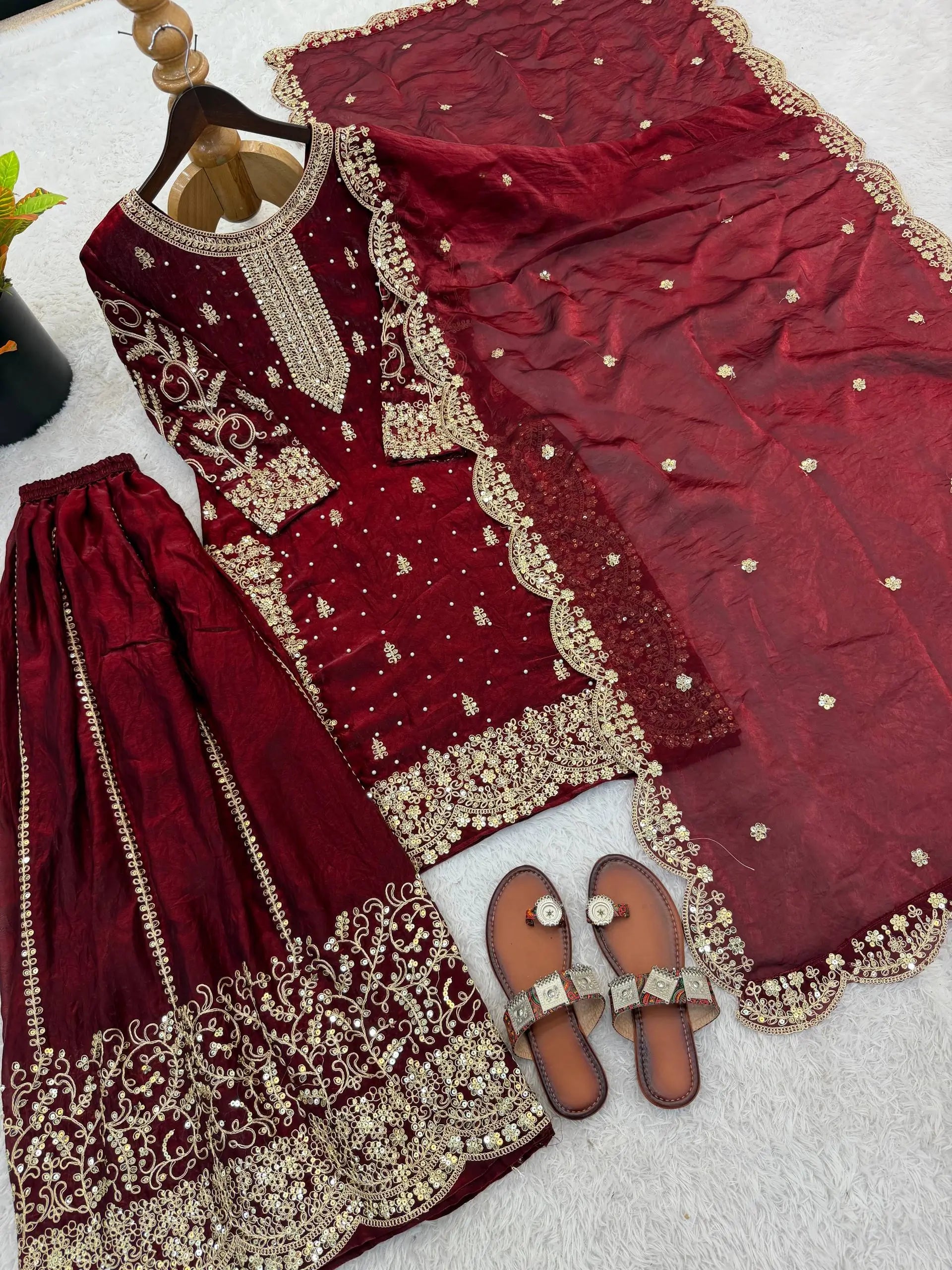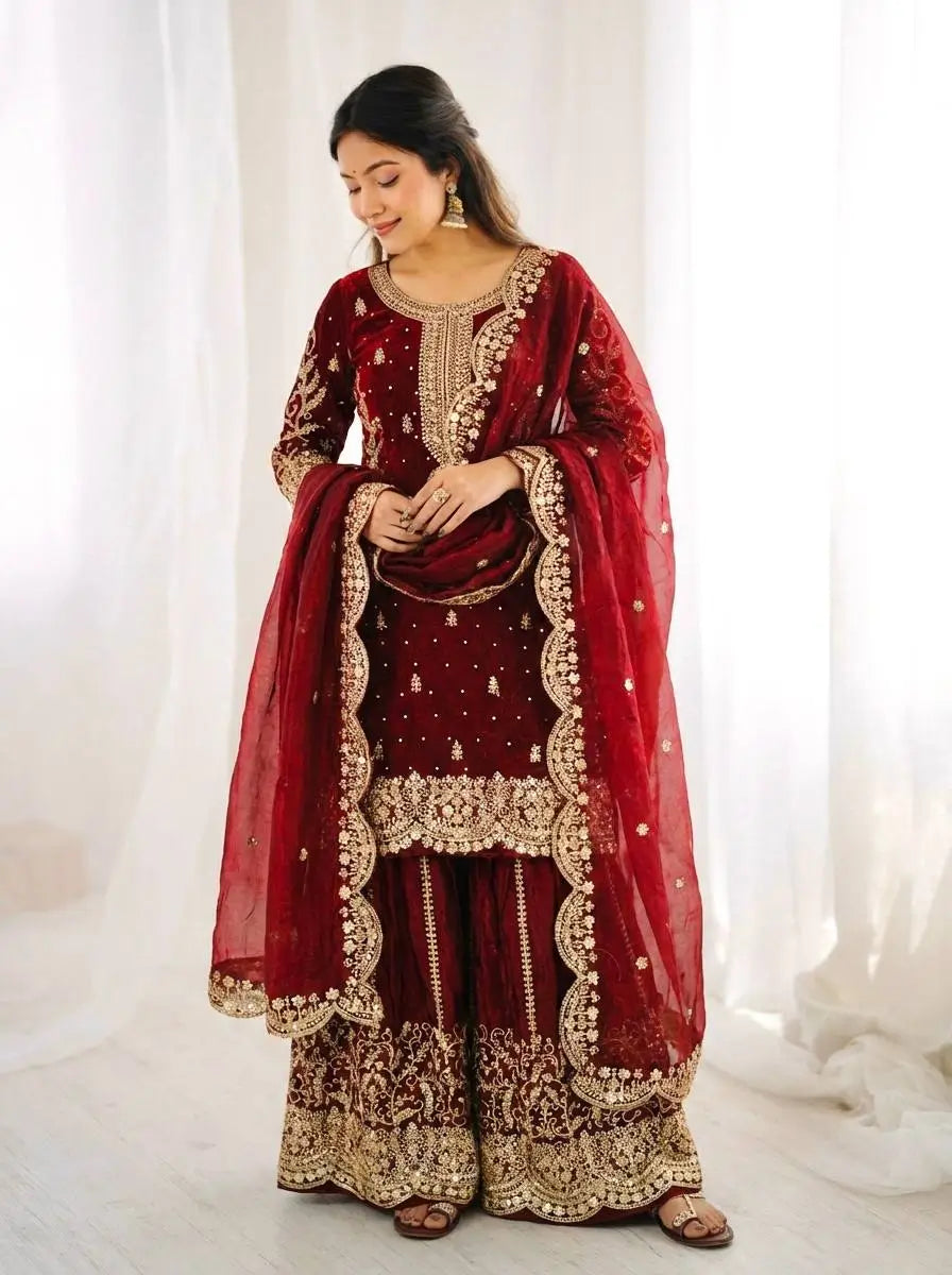 This premium sharara set is crafted from heavy chinon silk, beautifully embellished with embroidery, sequence detailing, and elegant lace work for a refined traditional look. The top comes with full sleeves, a length of 37–38 inches, and a soft heavy micro cotton lining for all-day comfort. The sharara is made from chinon silk with matching embroidery and sequence work, fully stitched with a micro cotton lining for ease of wear. The outfit is completed with a dupatta in chinon silk, finished with a delicate lace border, adding grace to the ensemble. Fully stitched and ready to wear, this sharara set is perfect for weddings, festive occasions, and party wear.