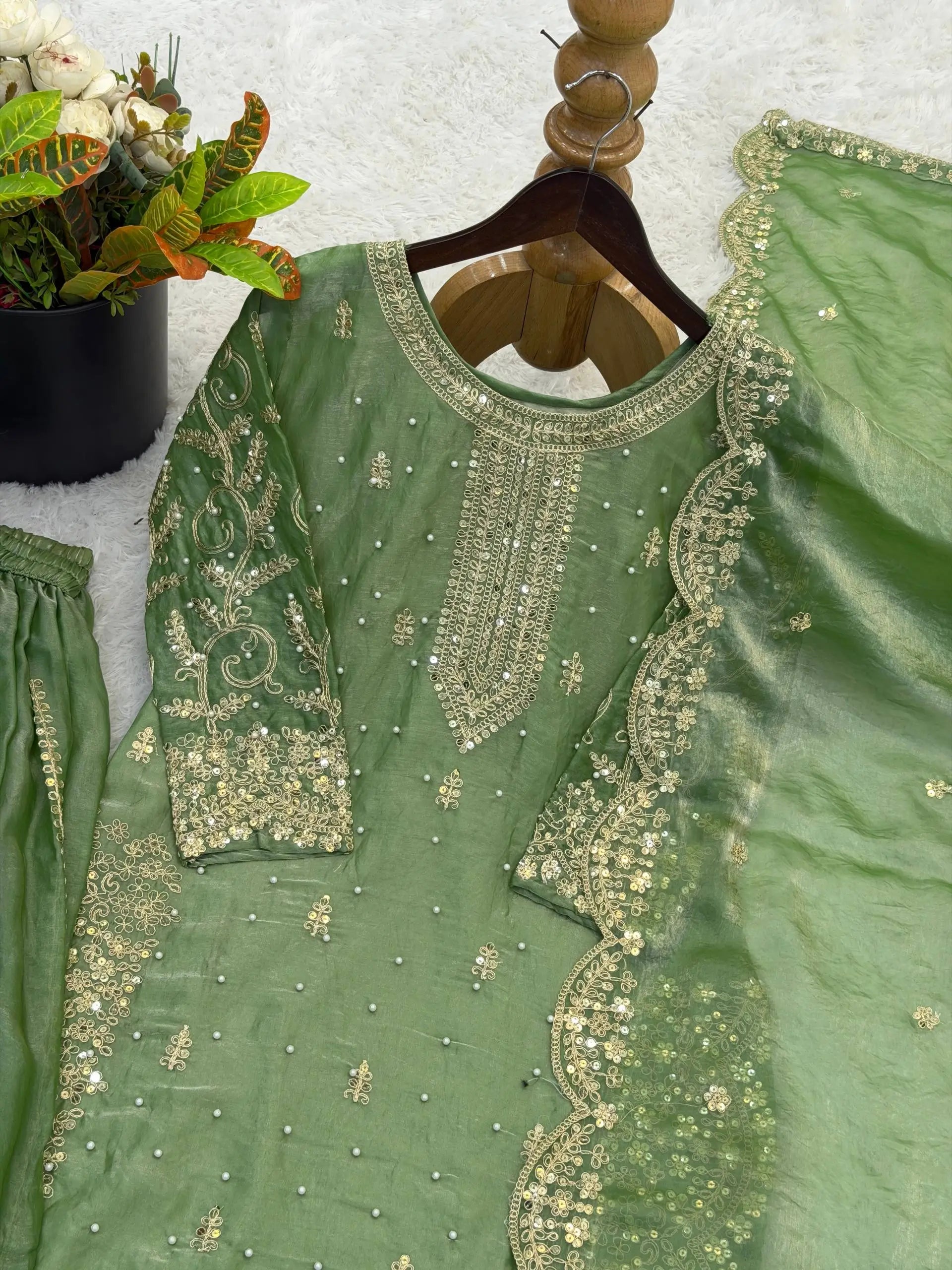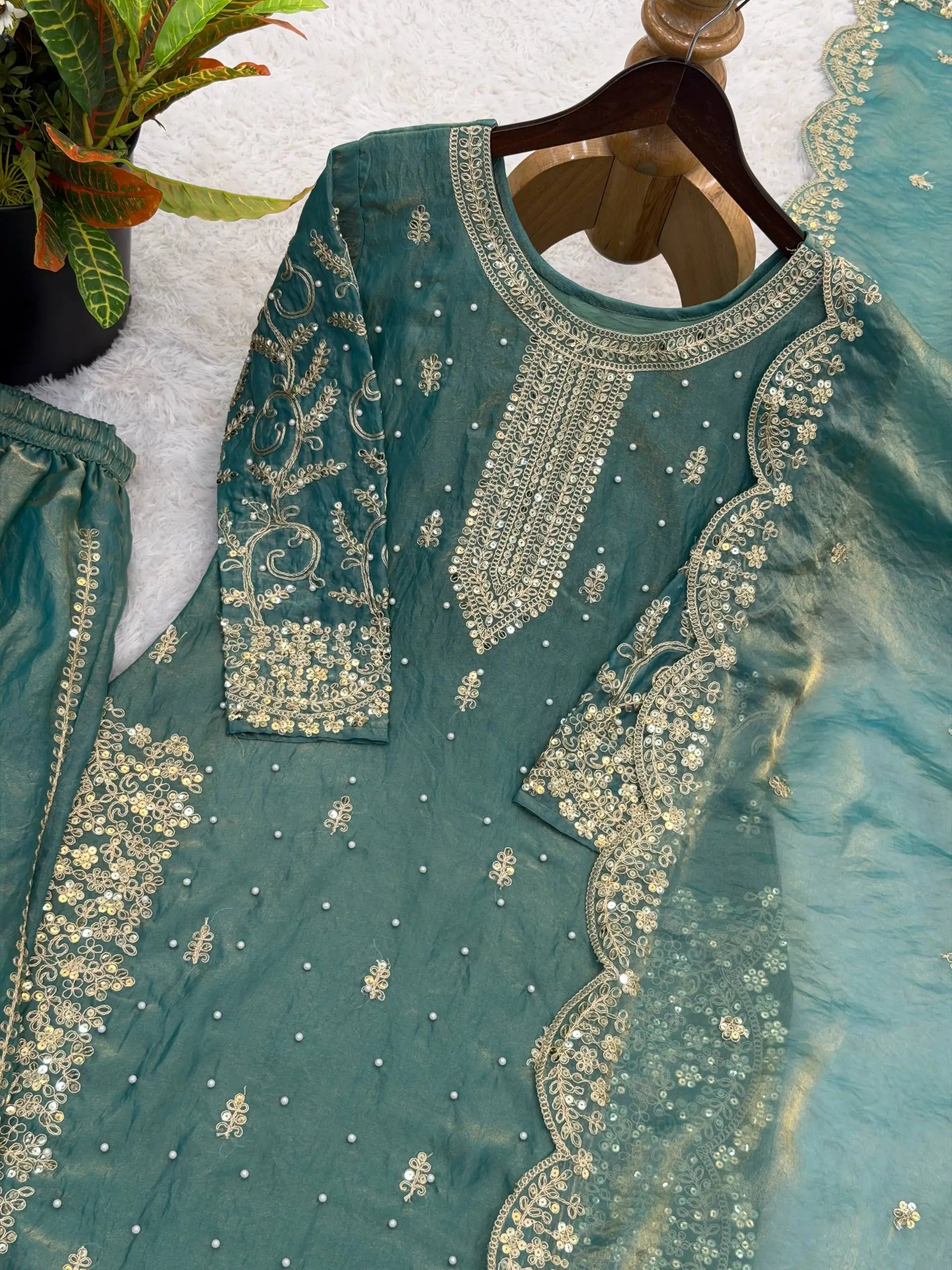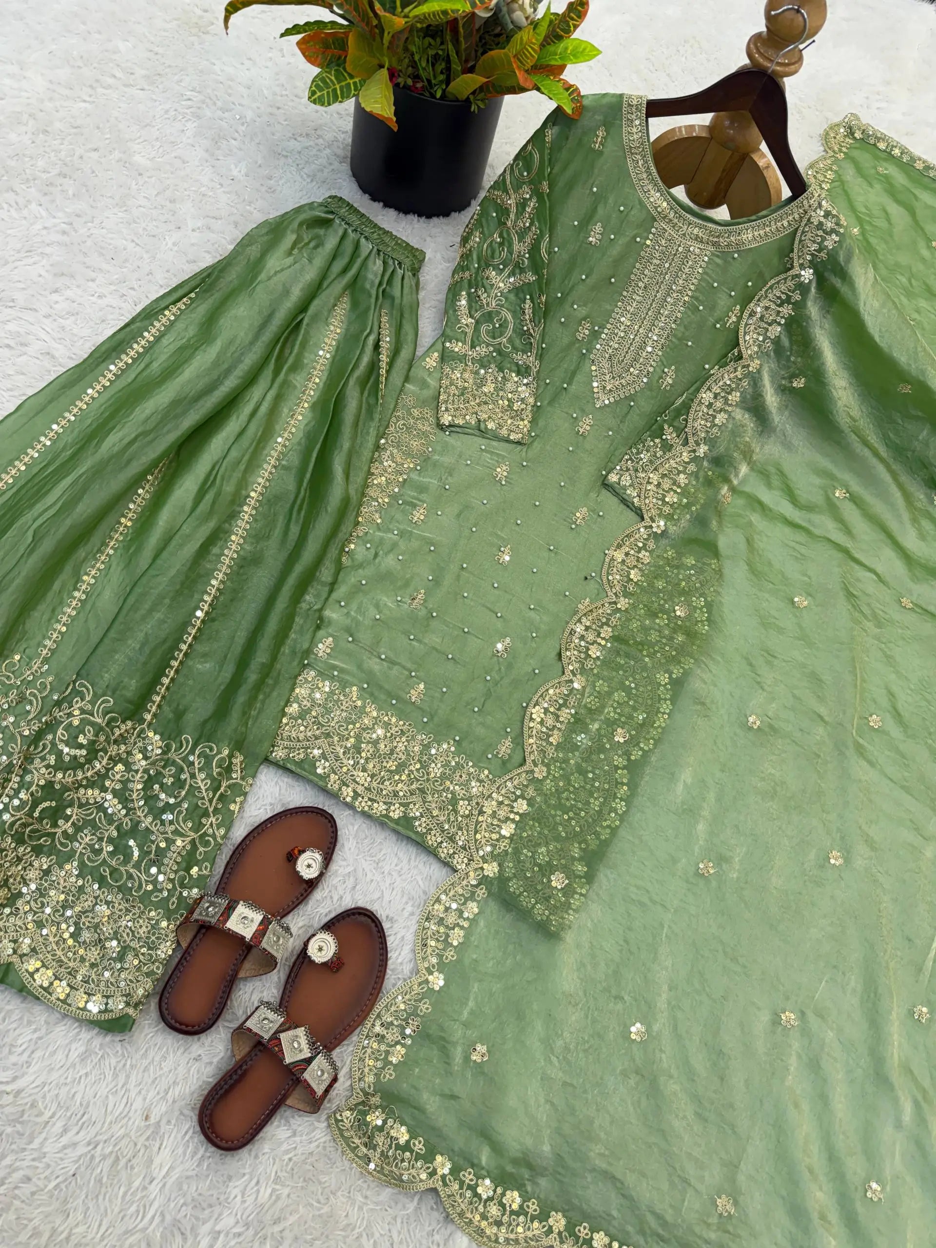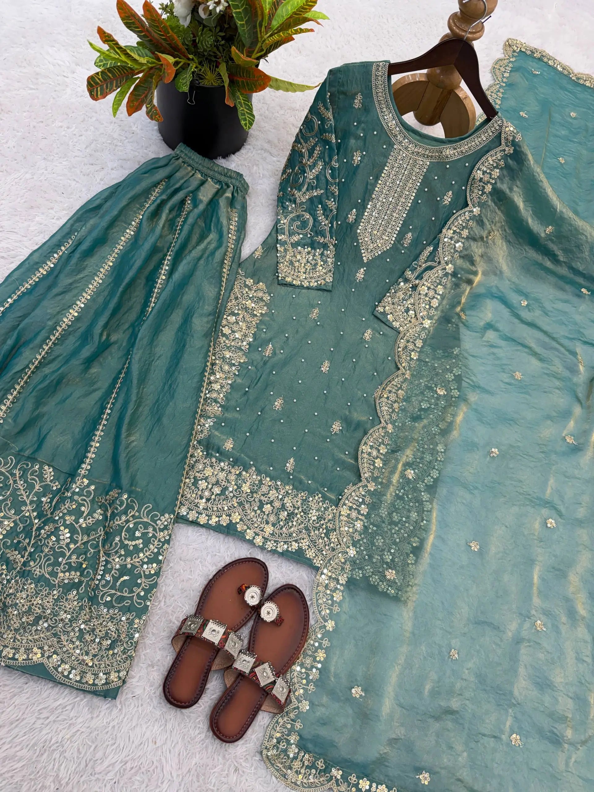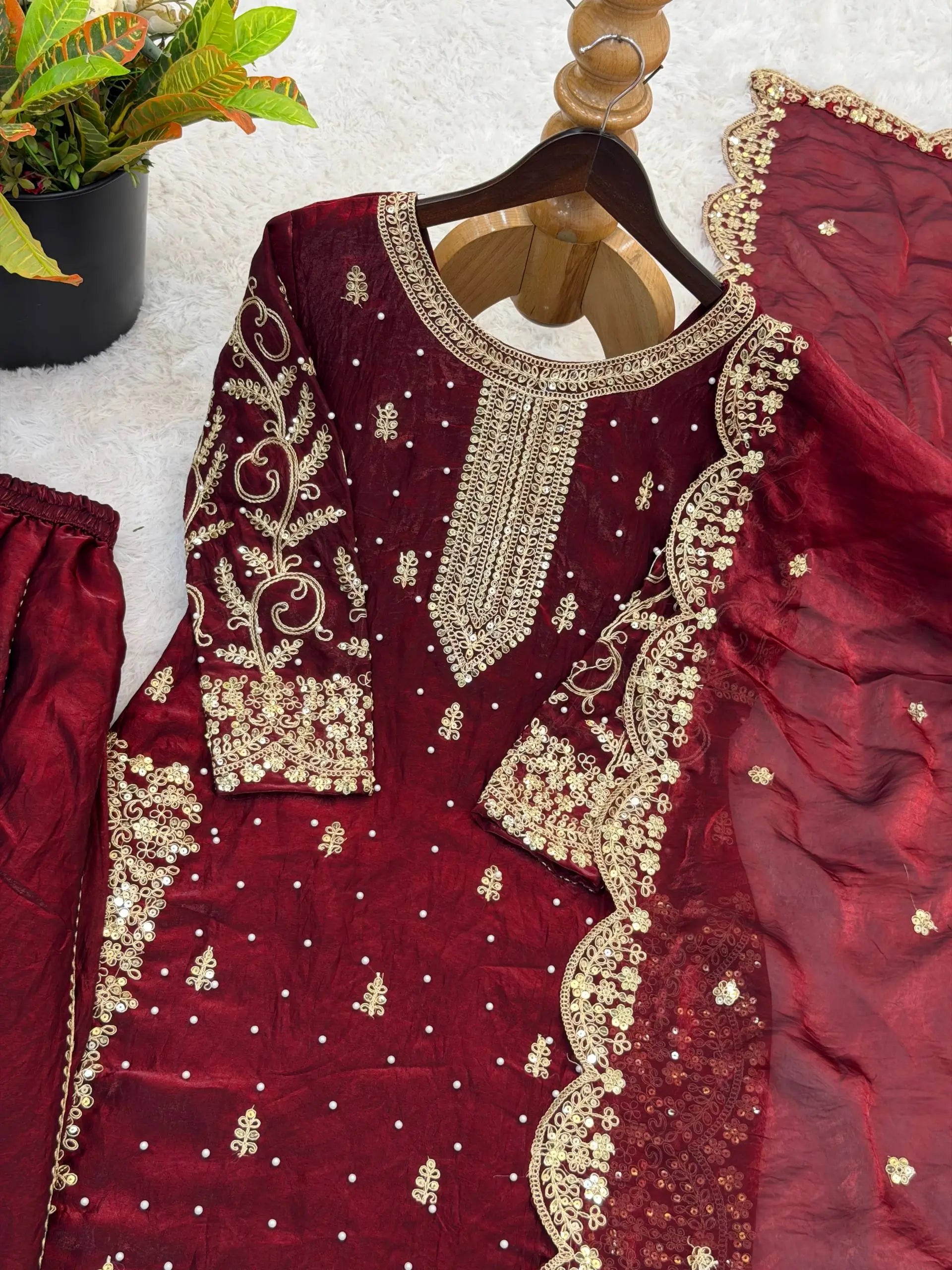 This premium sharara set is crafted from heavy chinon silk, beautifully embellished with embroidery, sequence detailing, and elegant lace work for a refined traditional look. The top comes with full sleeves, a length of 37–38 inches, and a soft heavy micro cotton lining for all-day comfort. The sharara is made from chinon silk with matching embroidery and sequence work, fully stitched with a micro cotton lining for ease of wear. The outfit is completed with a dupatta in chinon silk, finished with a delicate lace border, adding grace to the ensemble. Fully stitched and ready to wear, this sharara set is perfect for weddings, festive occasions, and party wear.